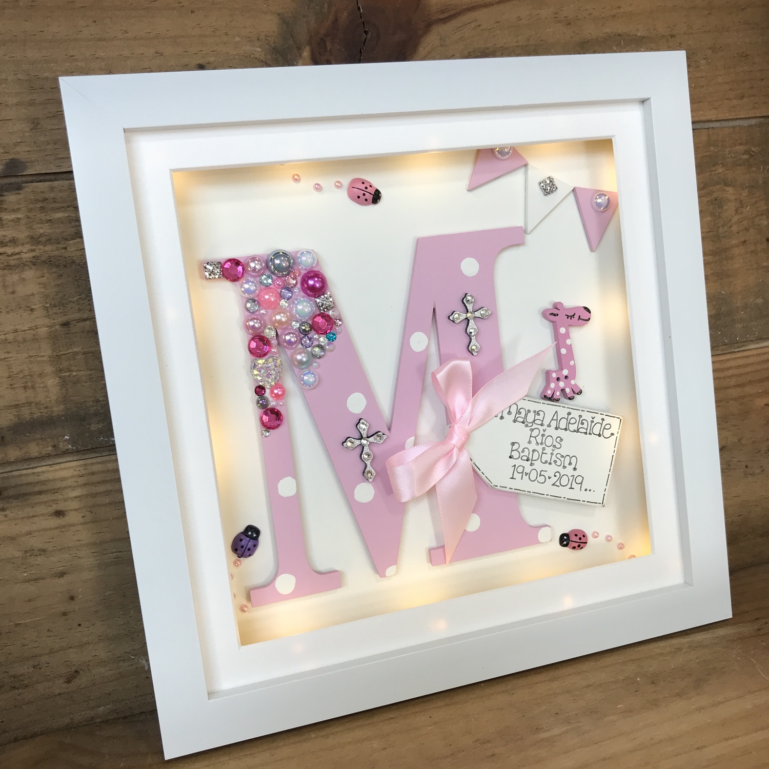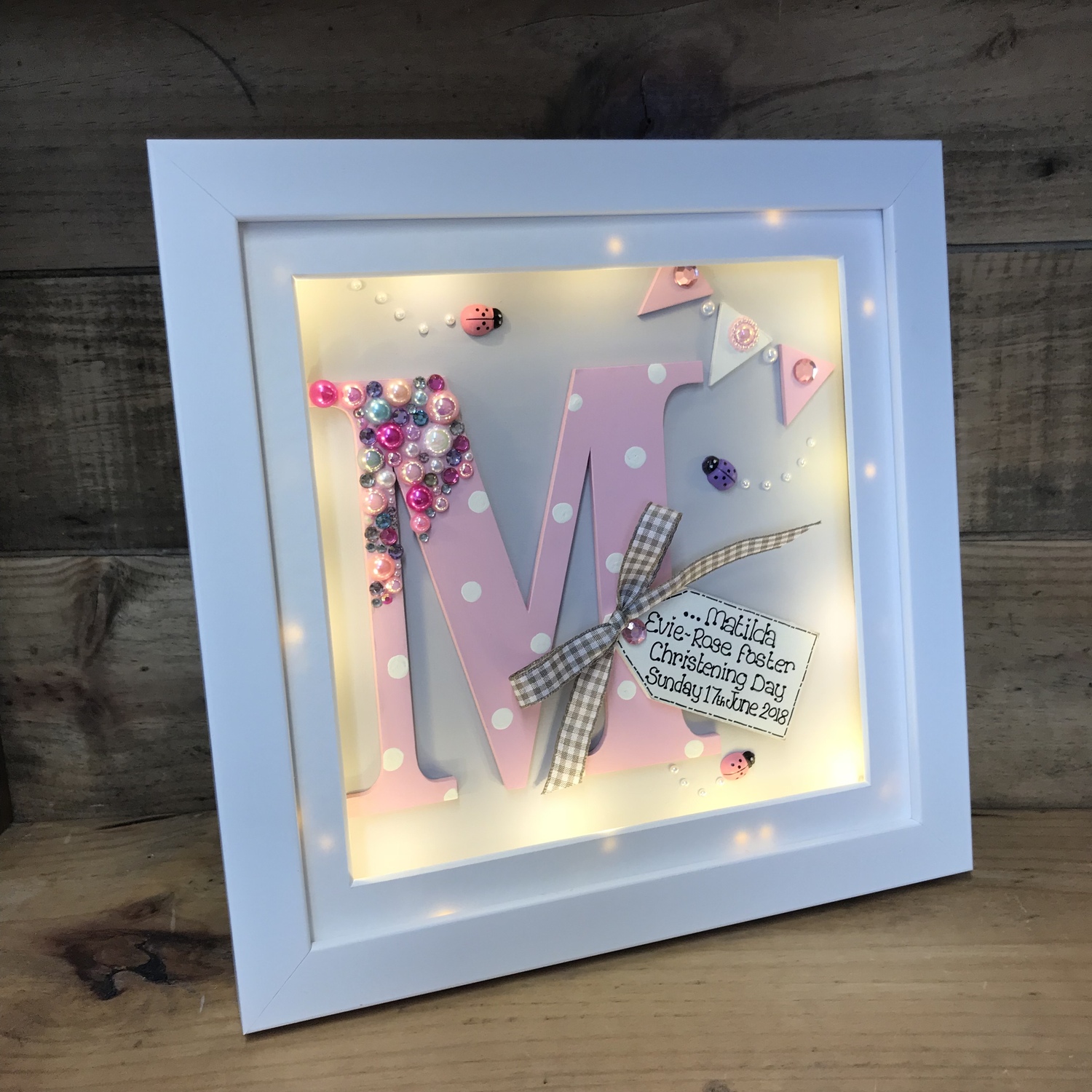 beautiful deep box frame with a hand painted laser cut letter inside,