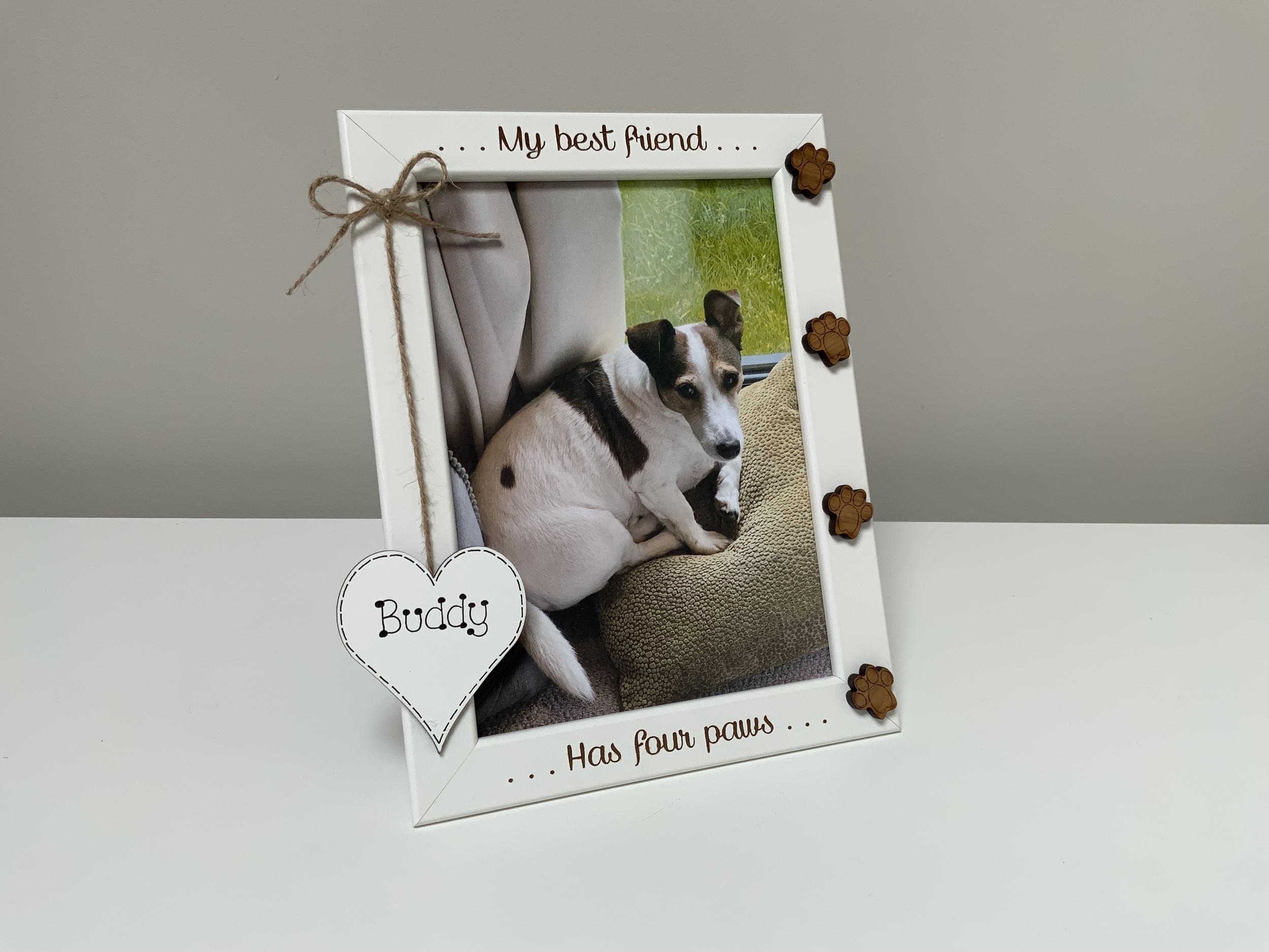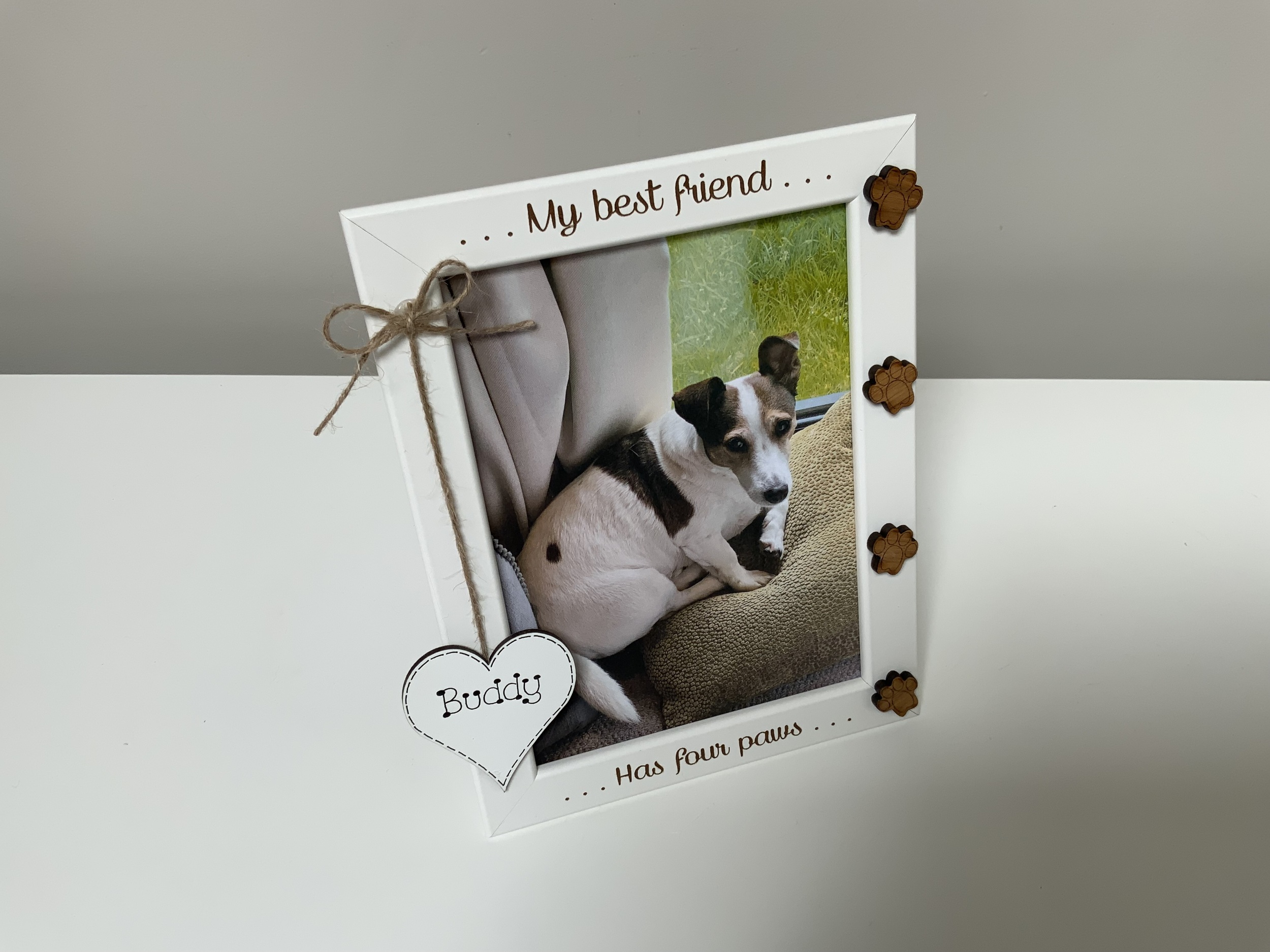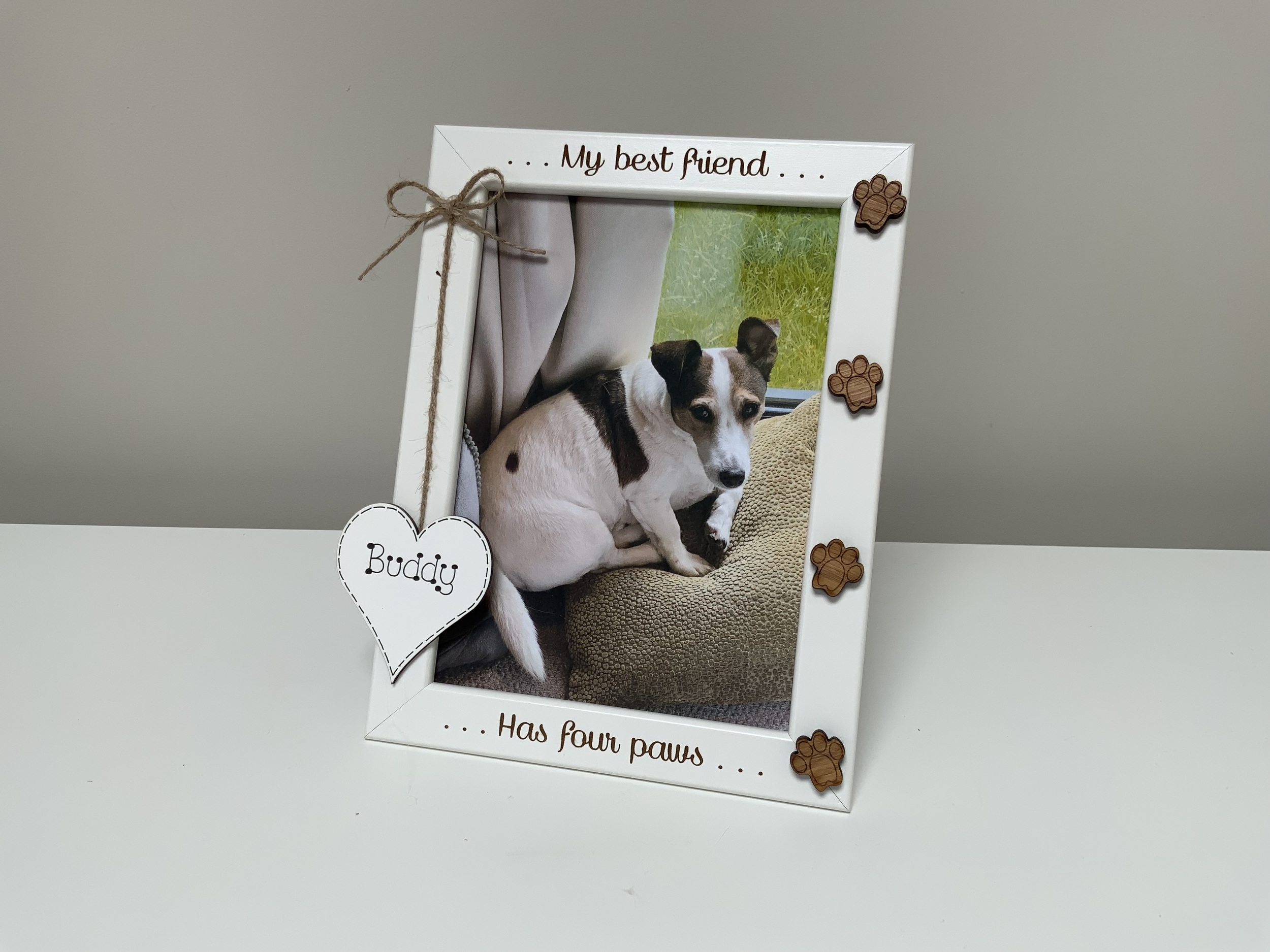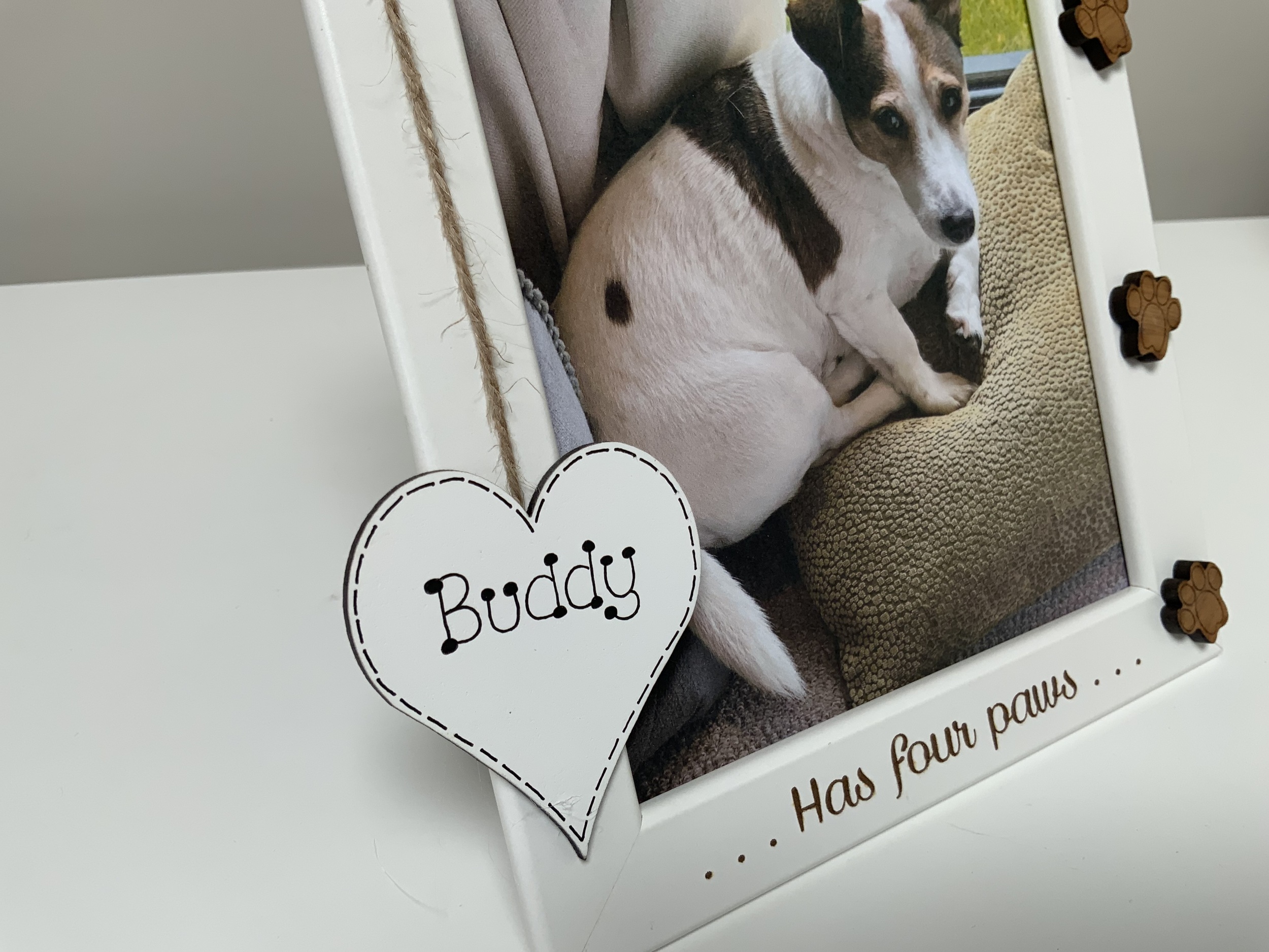 this personalised 5x7” white photo frame, features custom engraving, paw prints in oak, silver, black, or gold, and a hanging heart for their name.