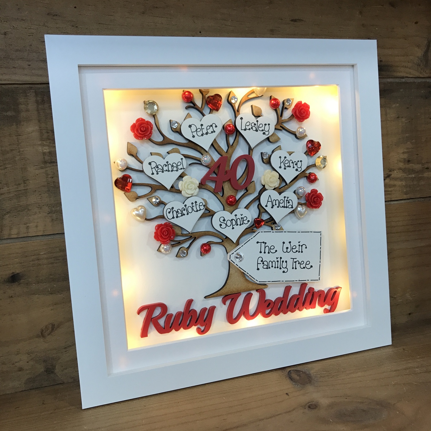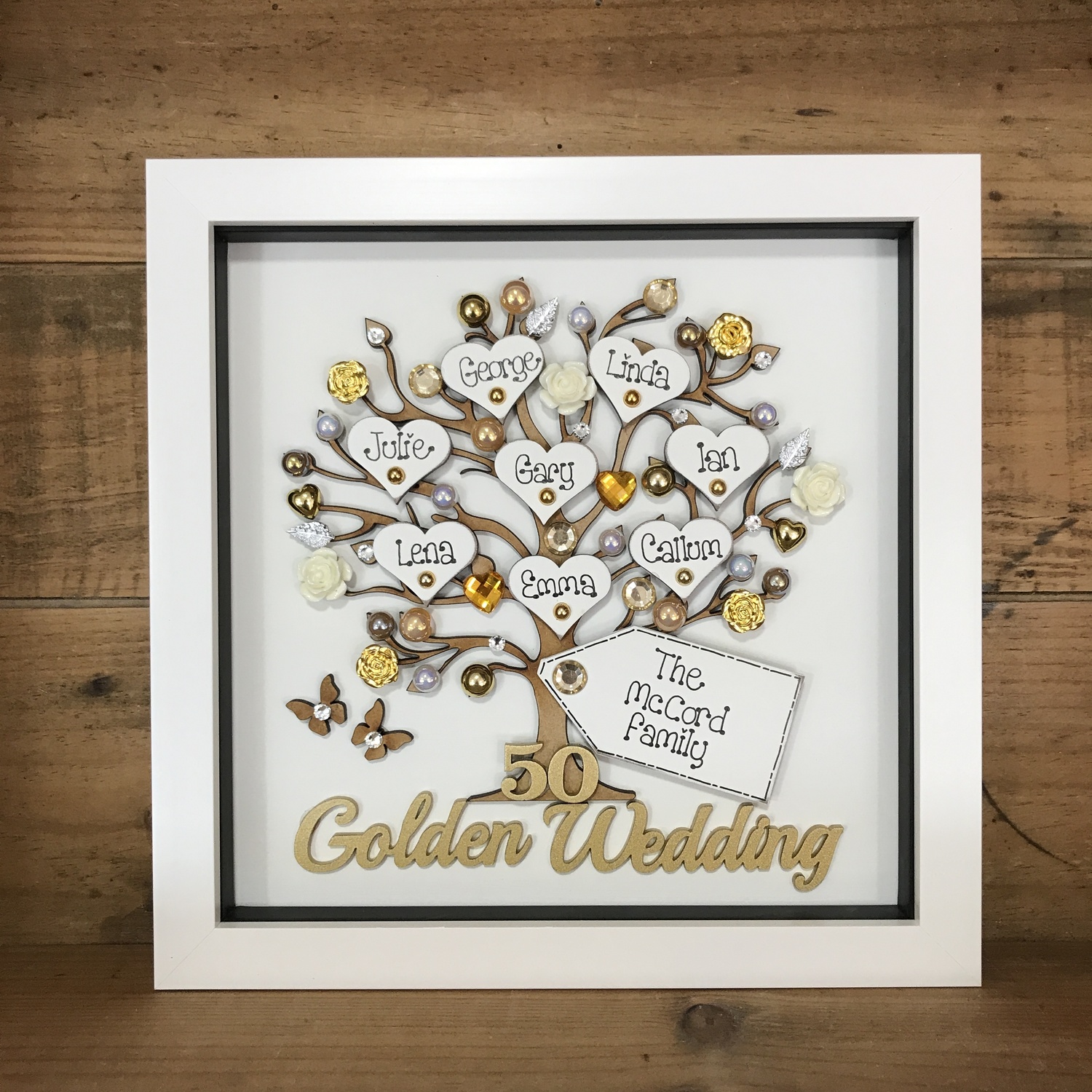 At the bottom of the tree you can Any Wording which is available in wood / gold / silver and many more colours
