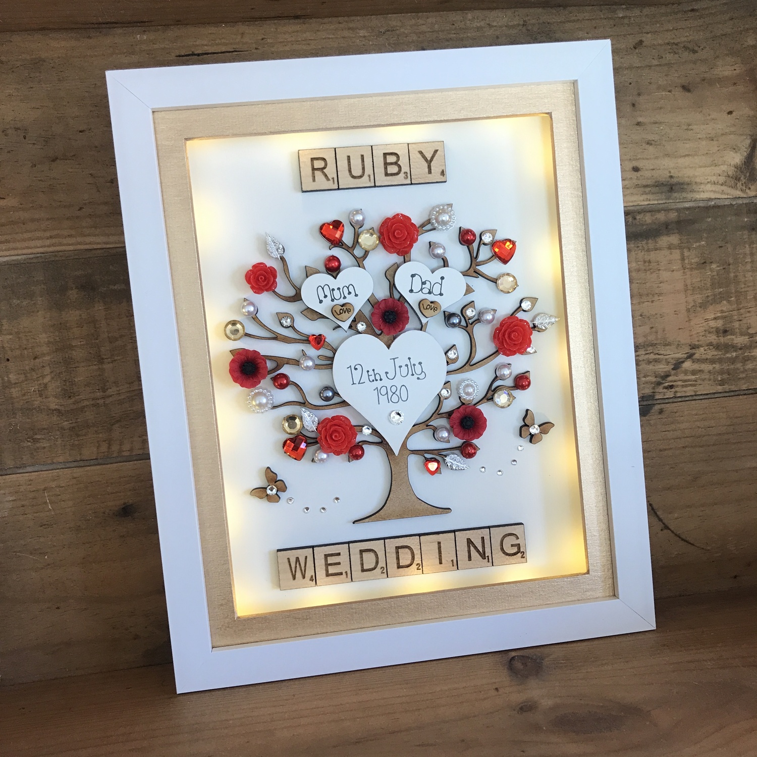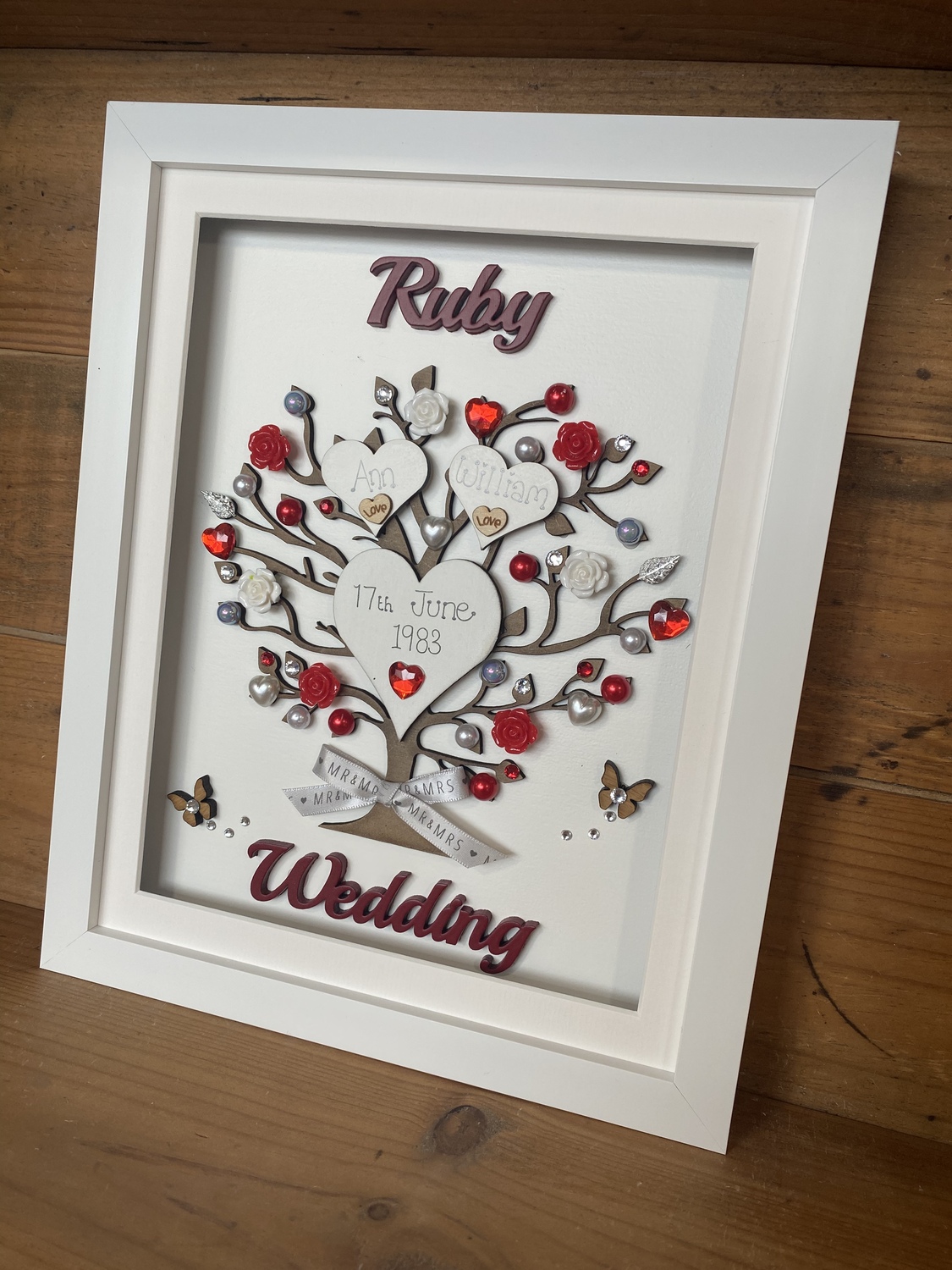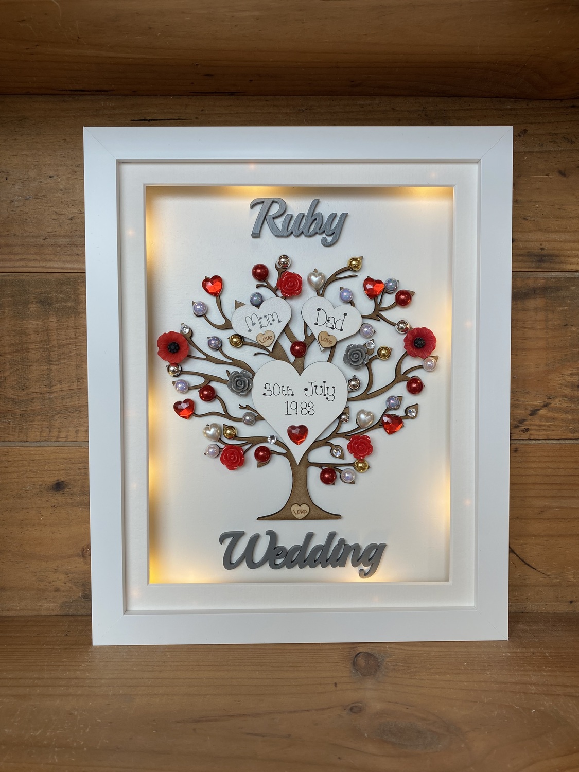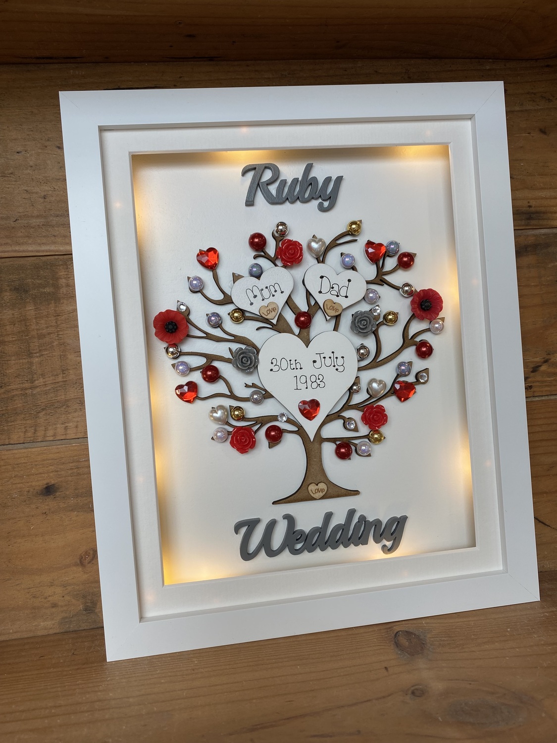 The laser cut tree can be left natural or sprayed silver/gold and is embellished with wooden hearts, pearls, diamantes and flowers also available in many colours to match your scheme.