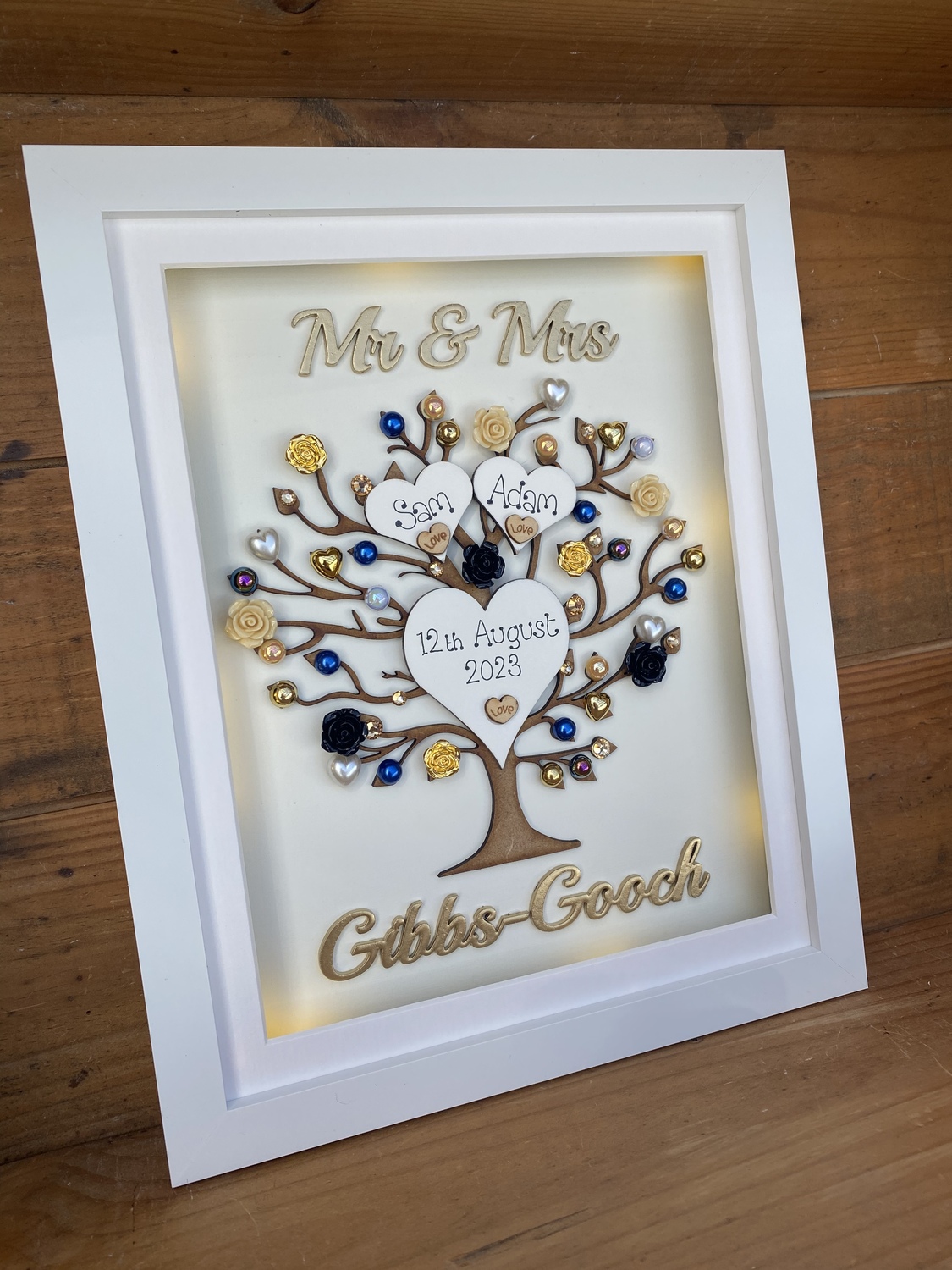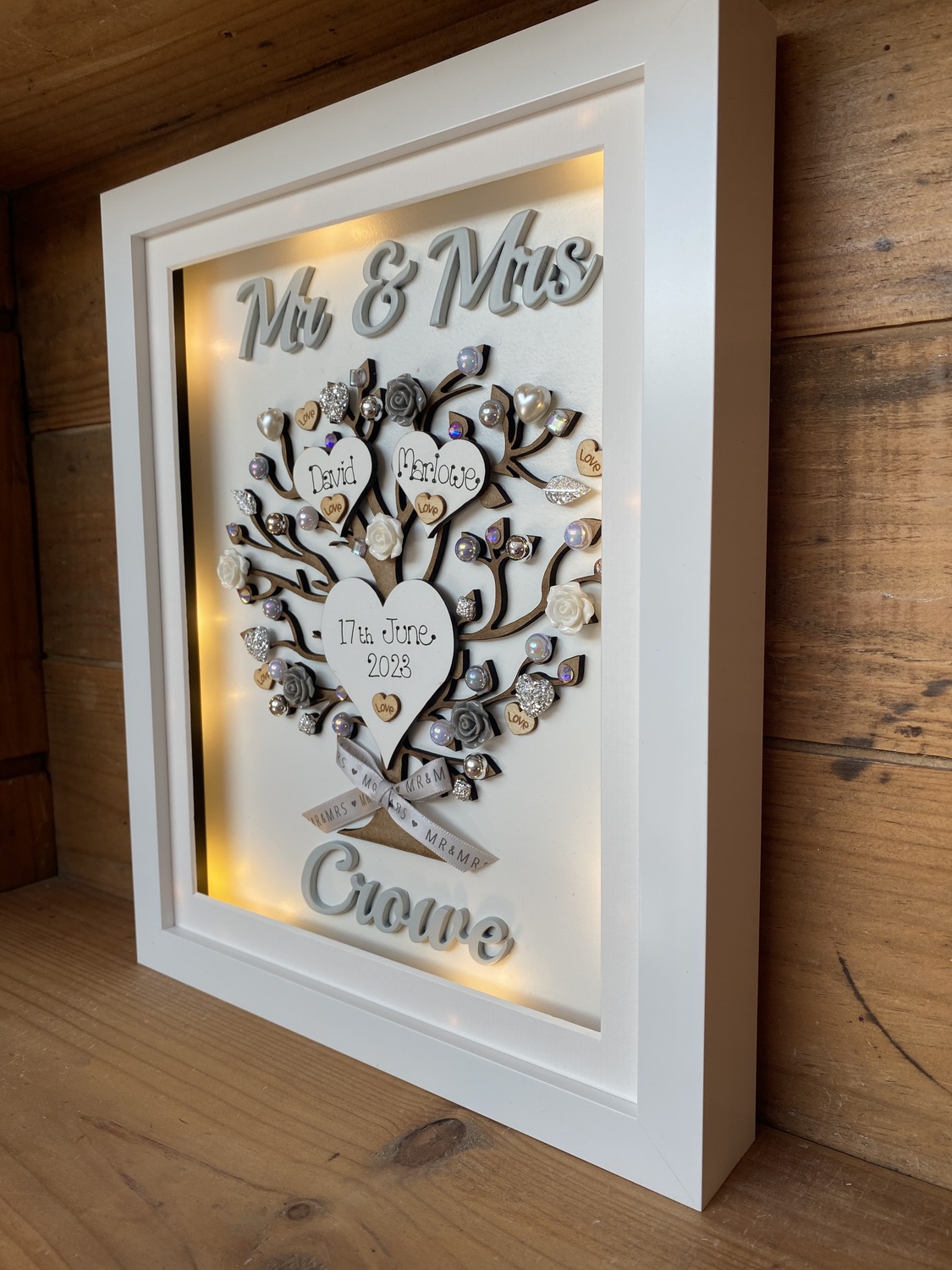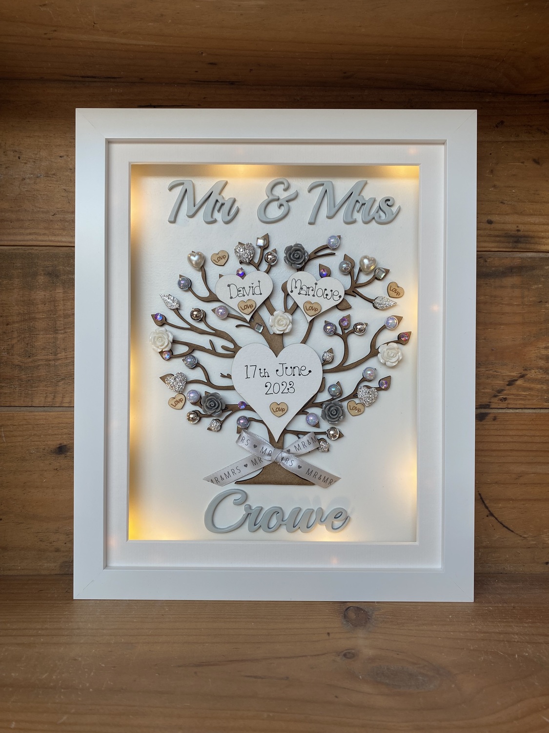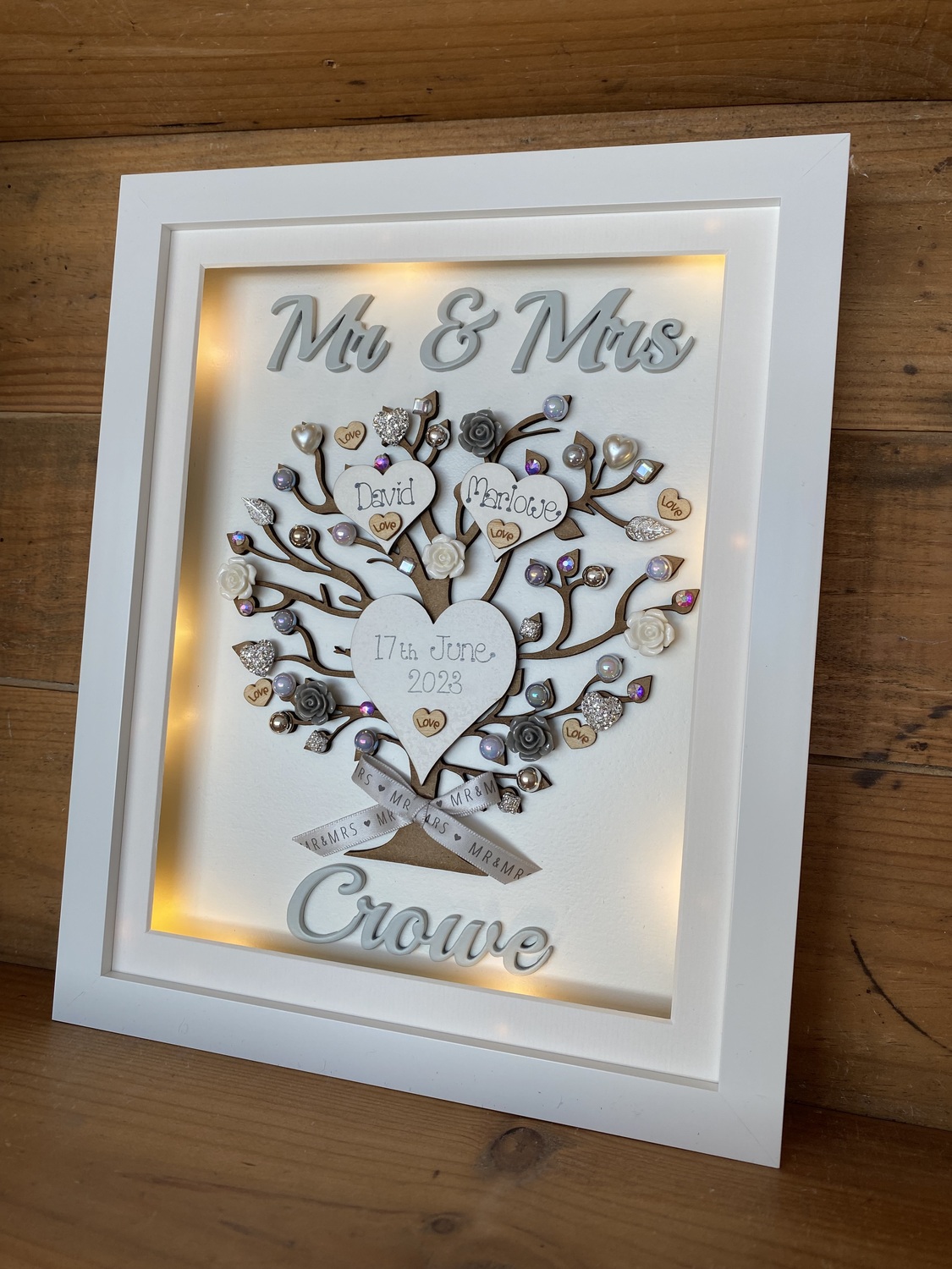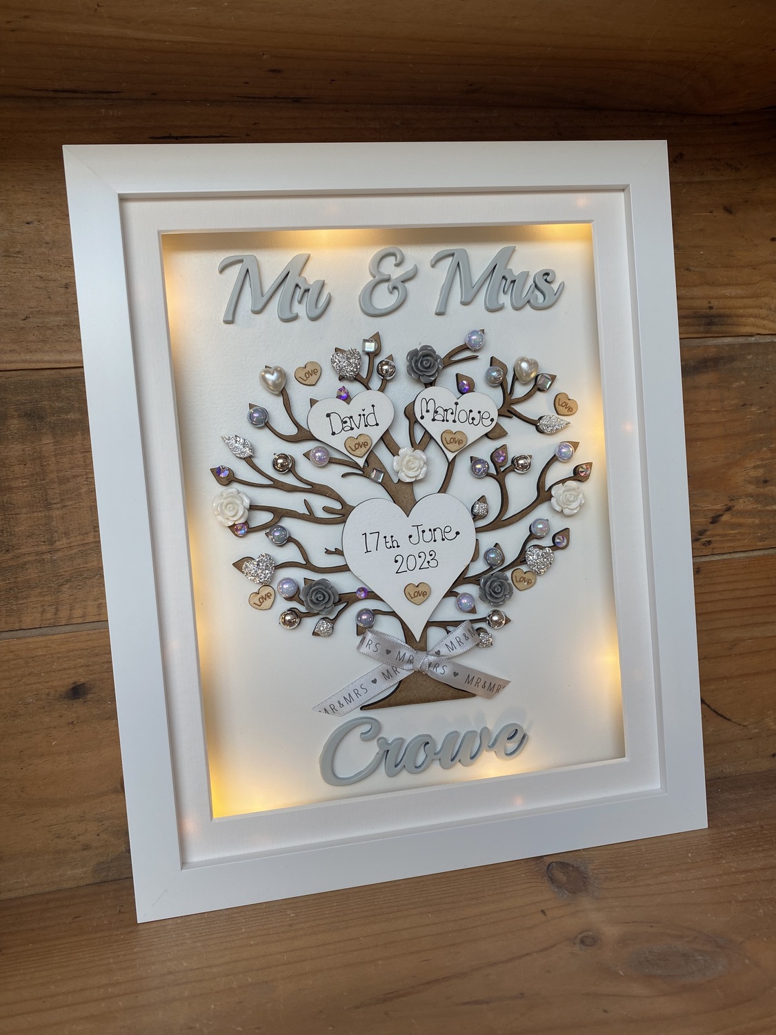 Beautiful Unique Wedding Gift in a Quality free standing box frame . The laser cut tree can be left natural or sprayed silver/gold and is embellished with wooden hearts, pearls, diamantes and flowers also available in many colours to match your scheme.