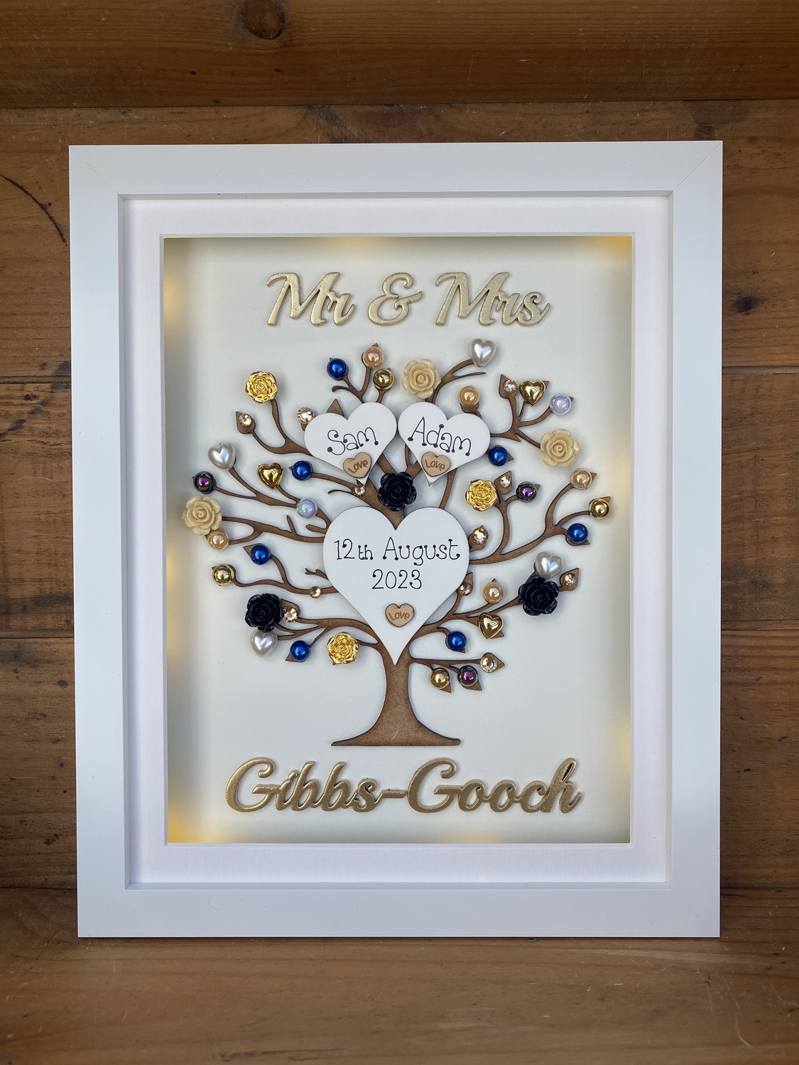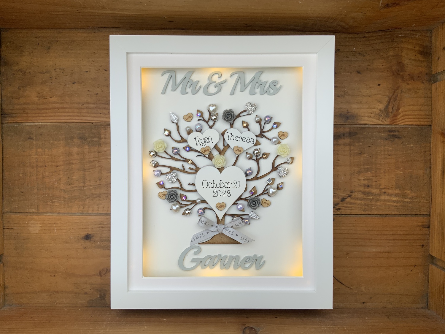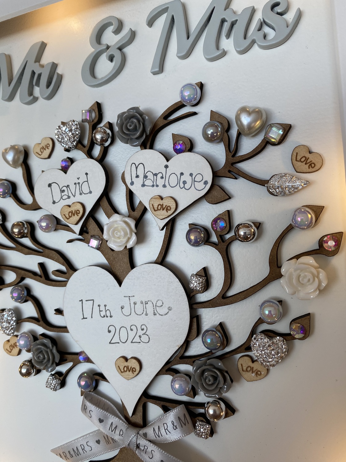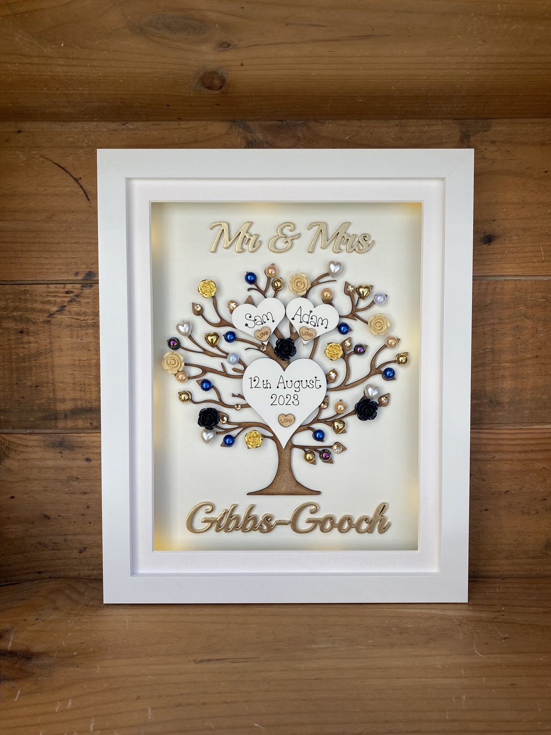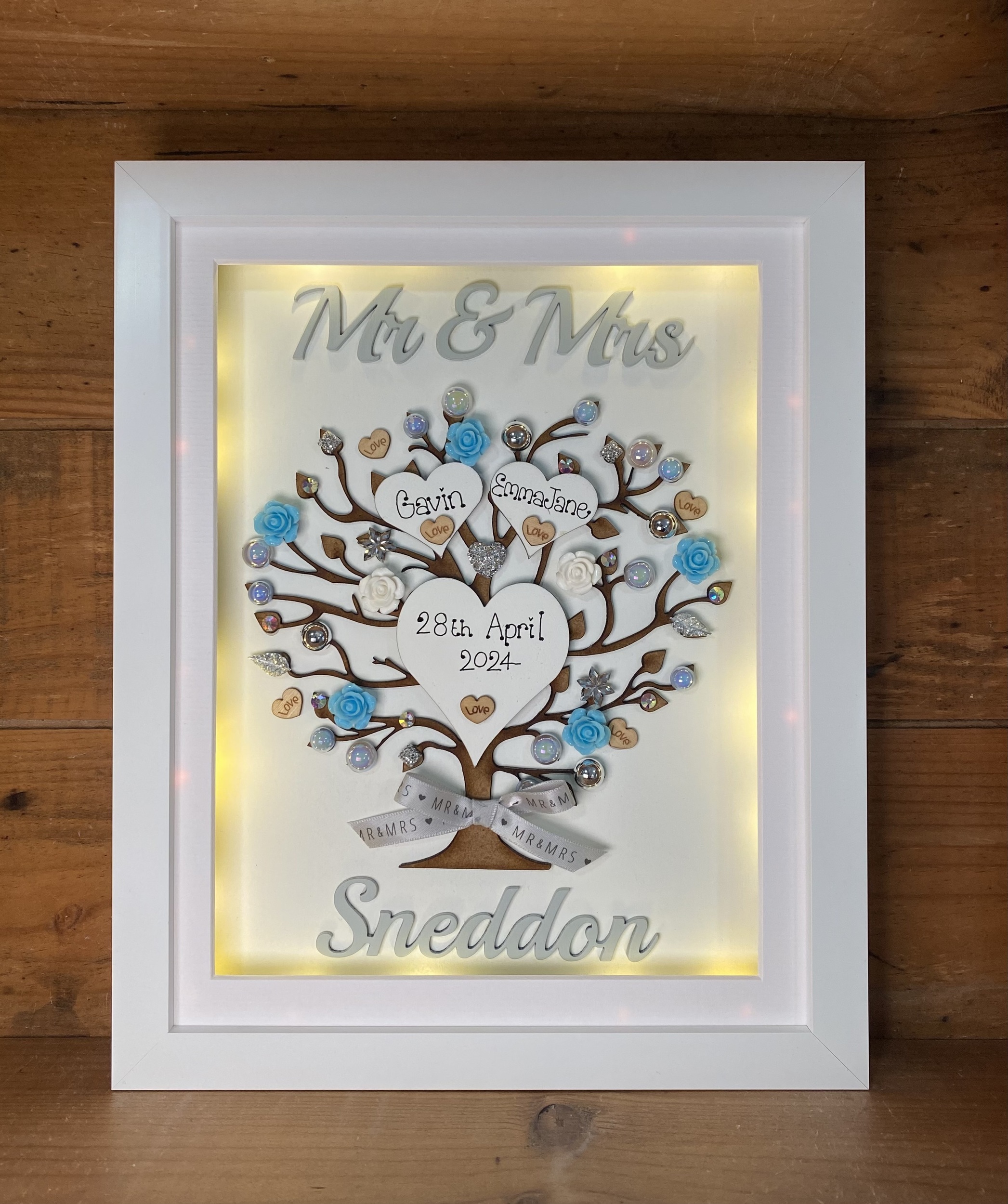 Beautiful Unique Wedding Gift in a Quality free standing box frame . The laser cut tree can be left natural or sprayed silver/gold and is embellished with wooden hearts, pearls, diamantes and flowers also available in many colours to match your scheme.