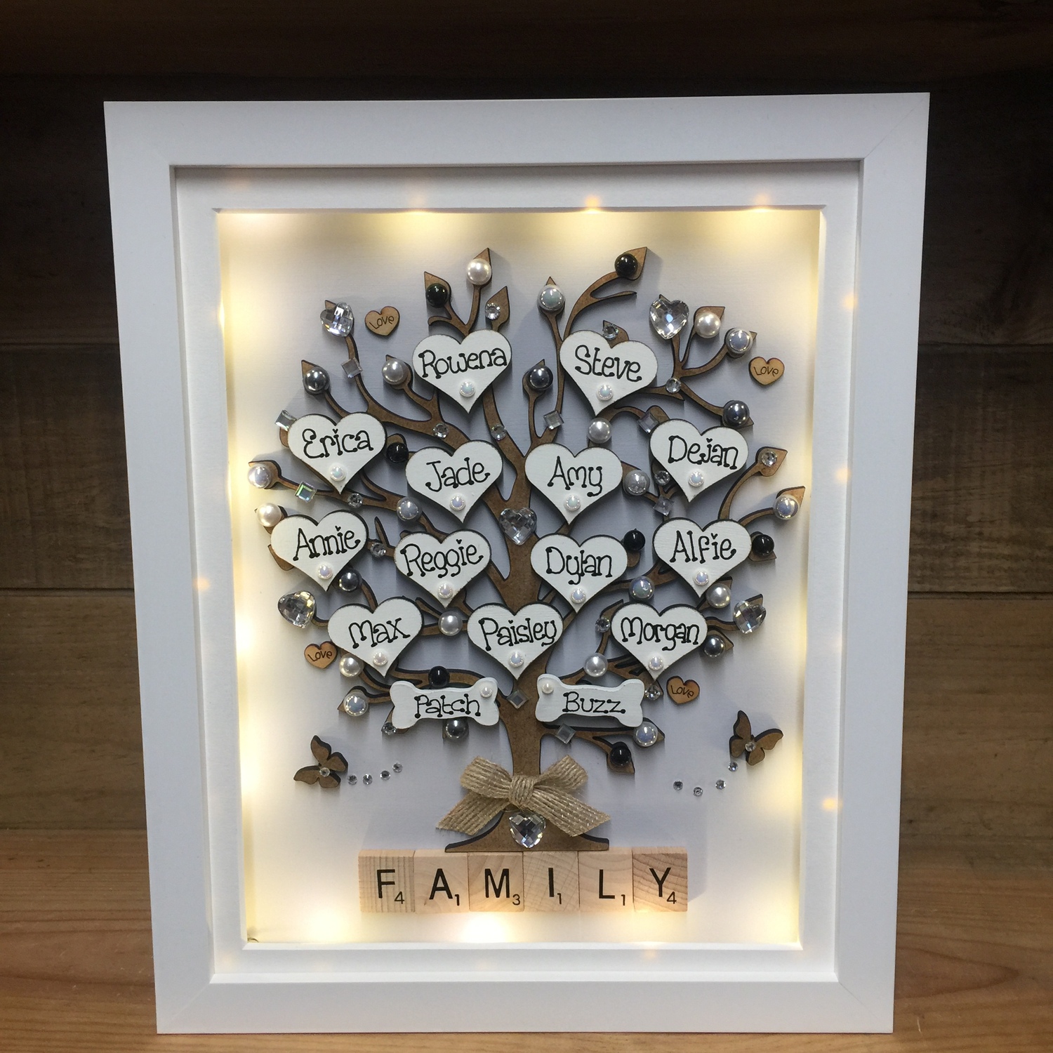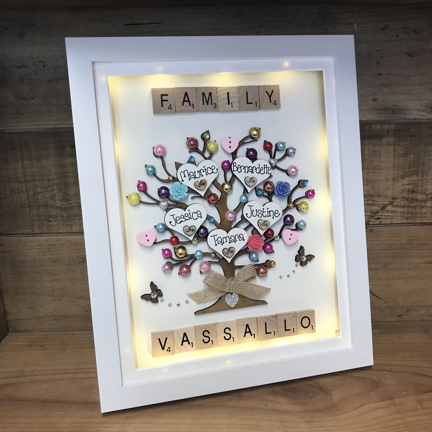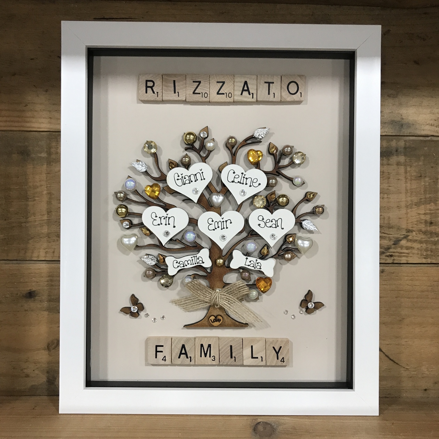 At the bottom of the tree you can either have scrabble tiles (max9)or a heart handwritten with the family name.