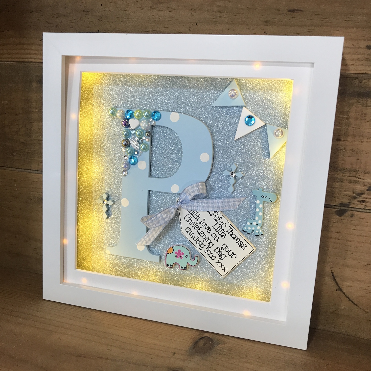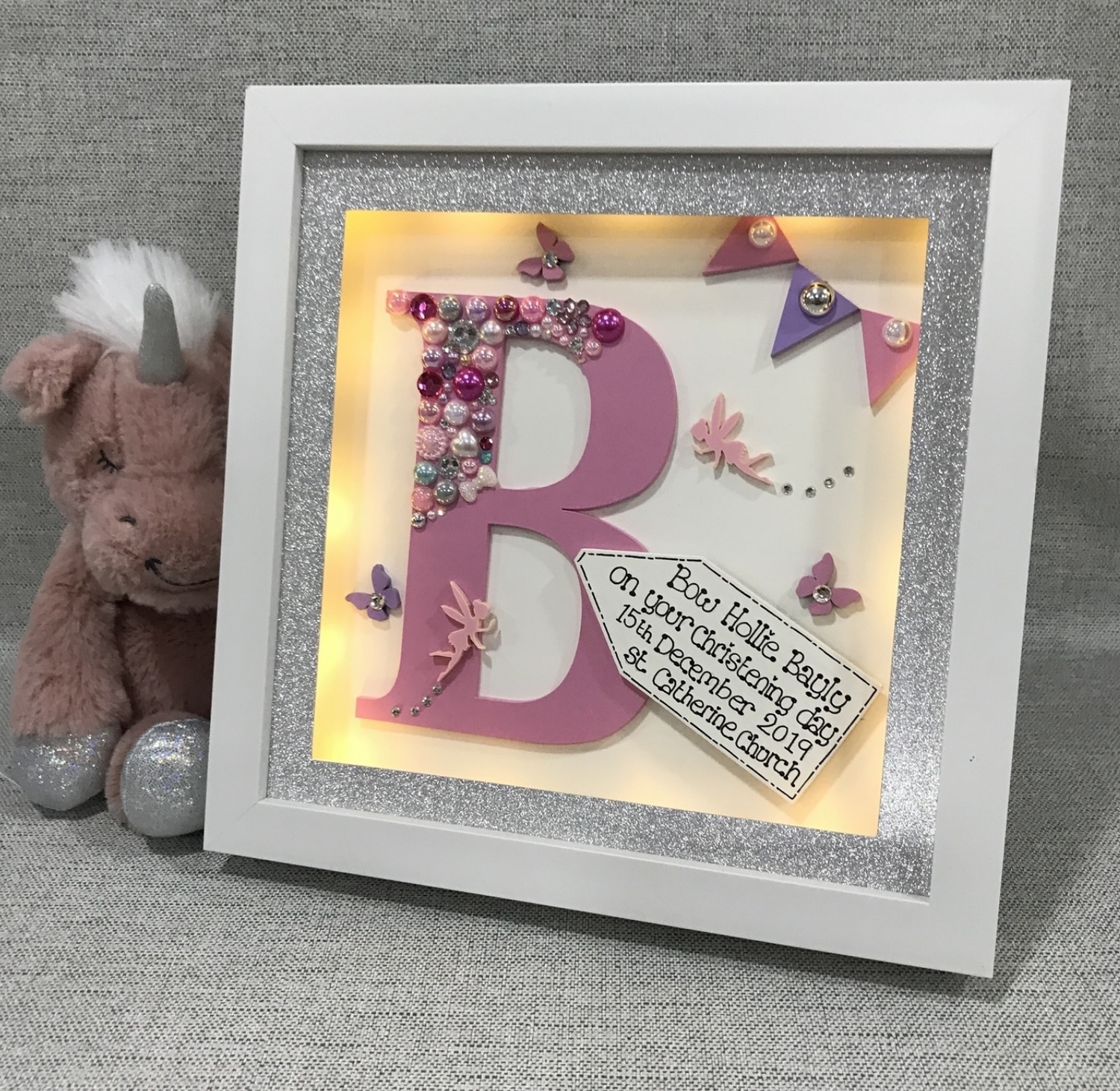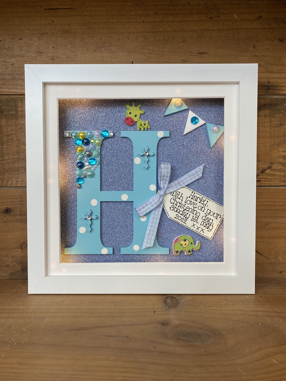beautiful deep box frame with a hand painted laser cut letter inside,