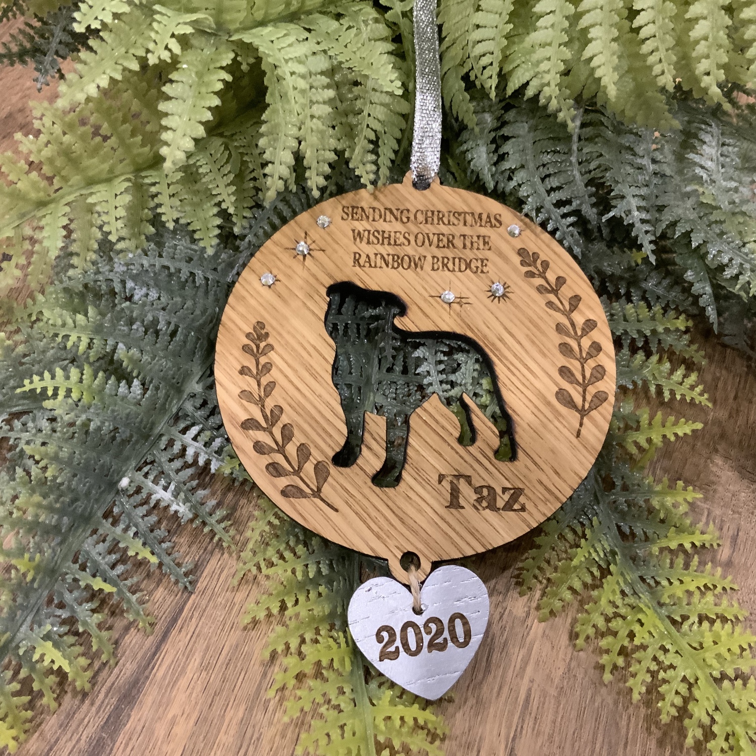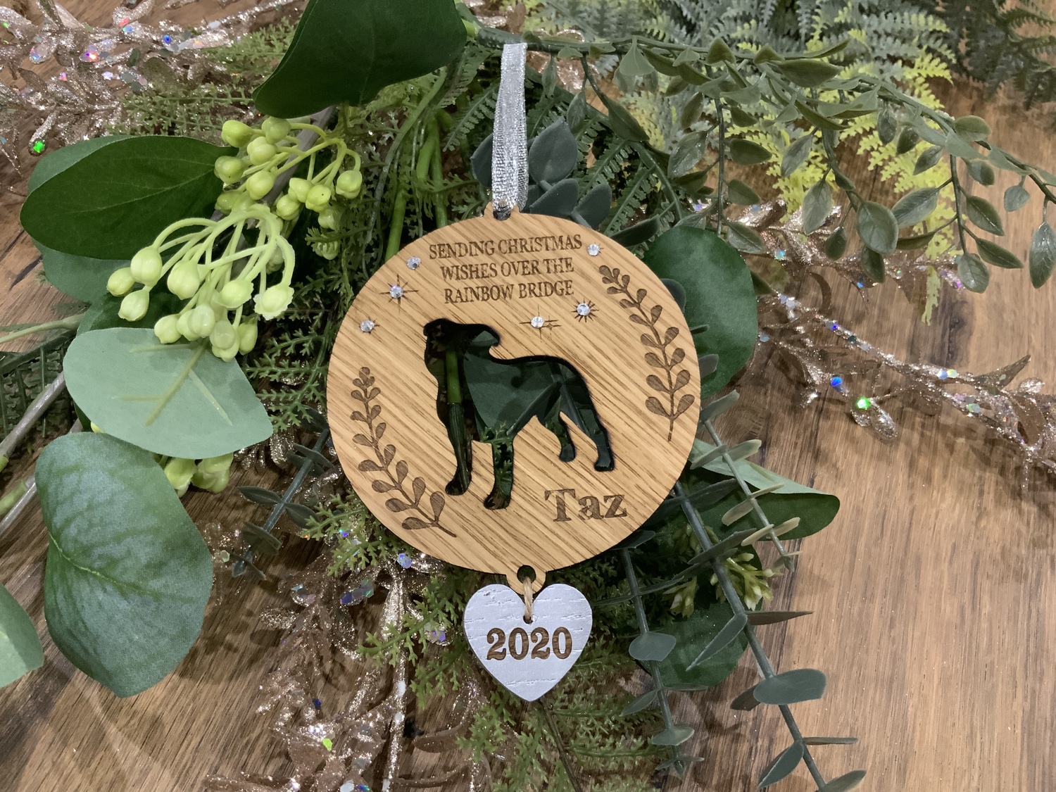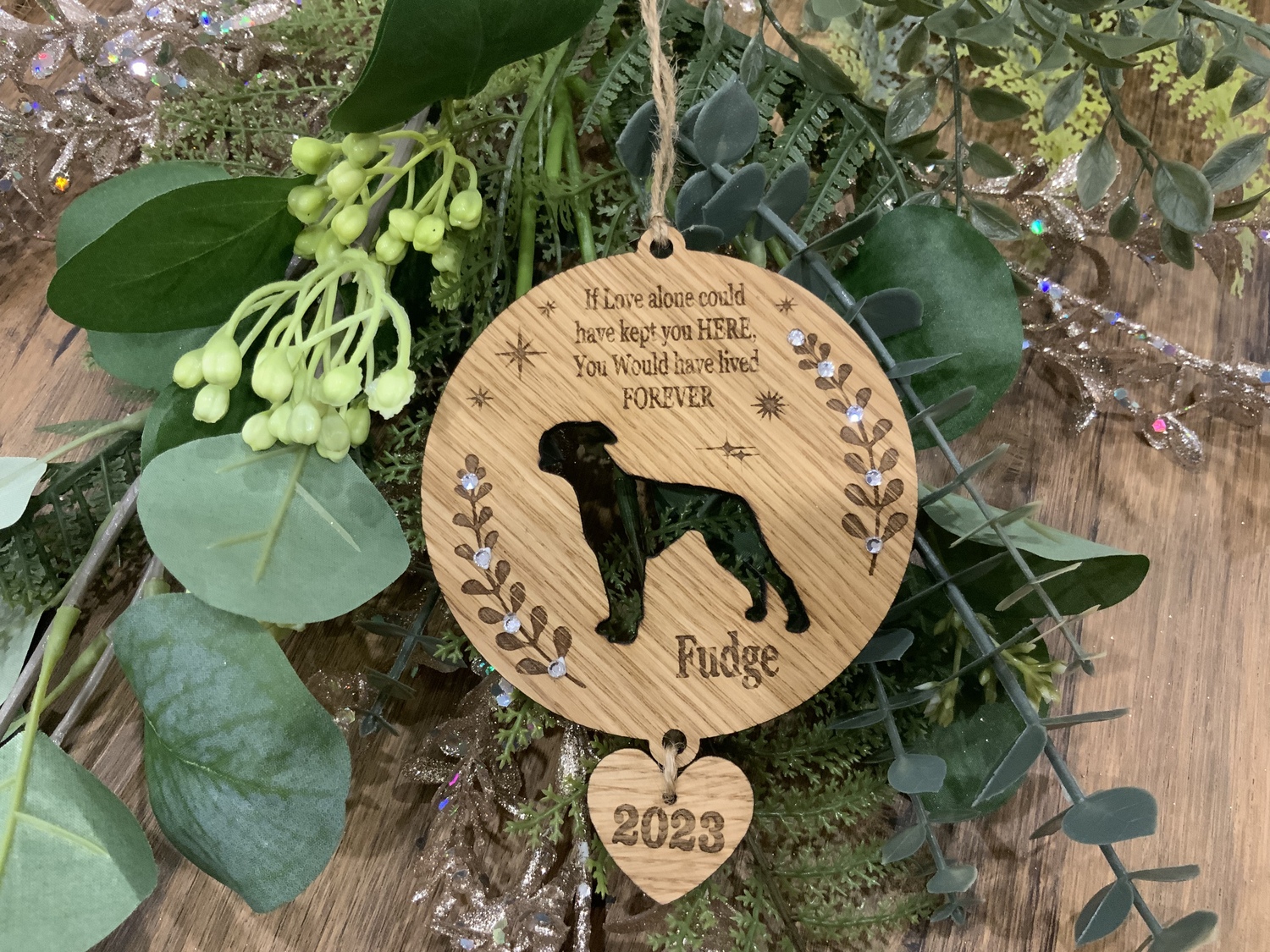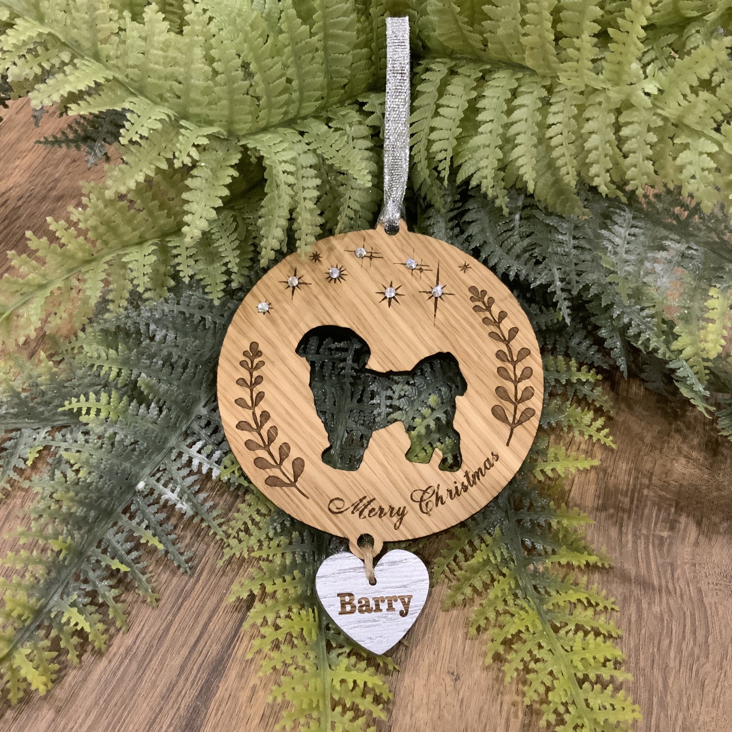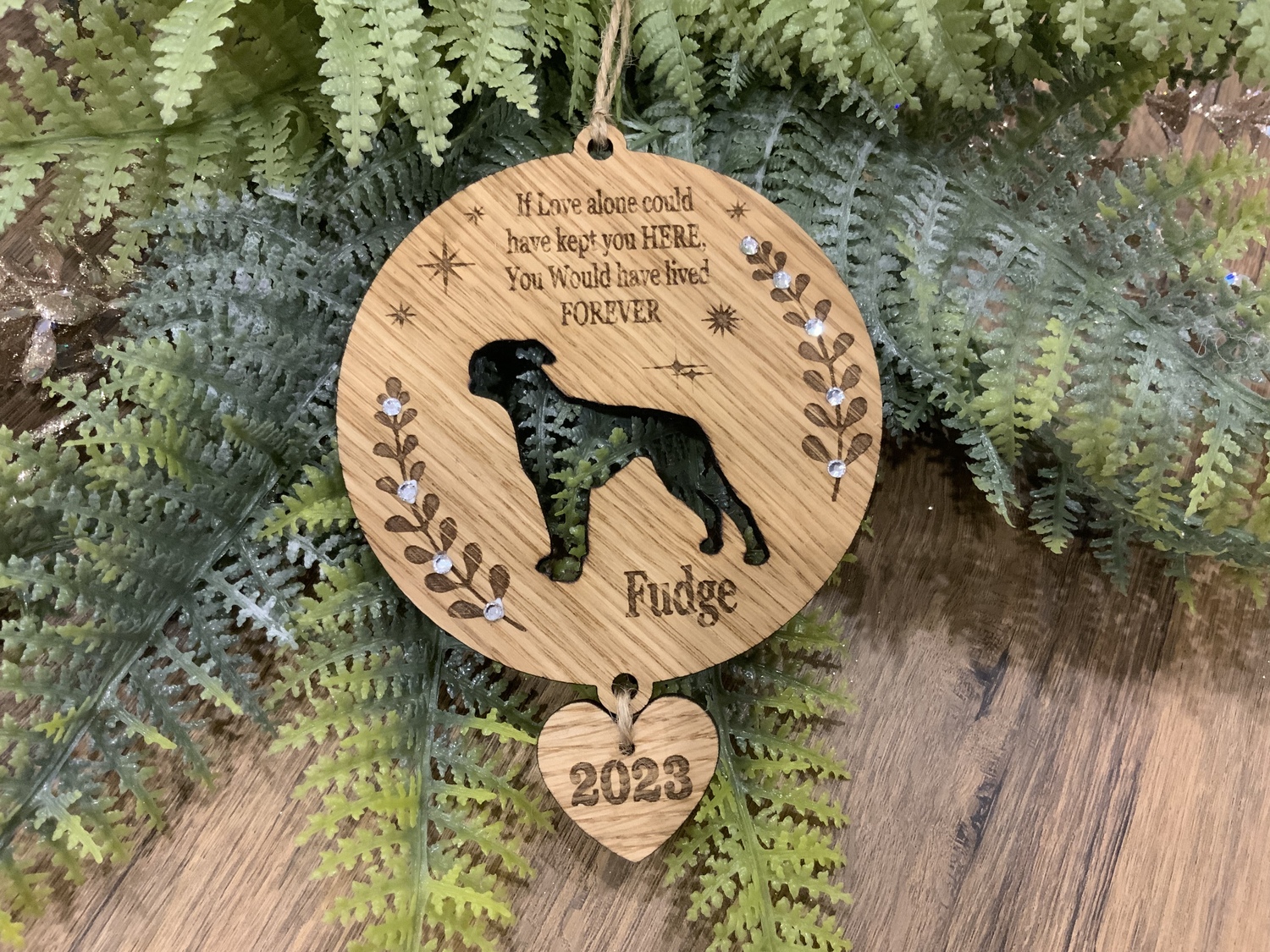 Oiled oak dog breed baubles, measuring 13cm/10cm