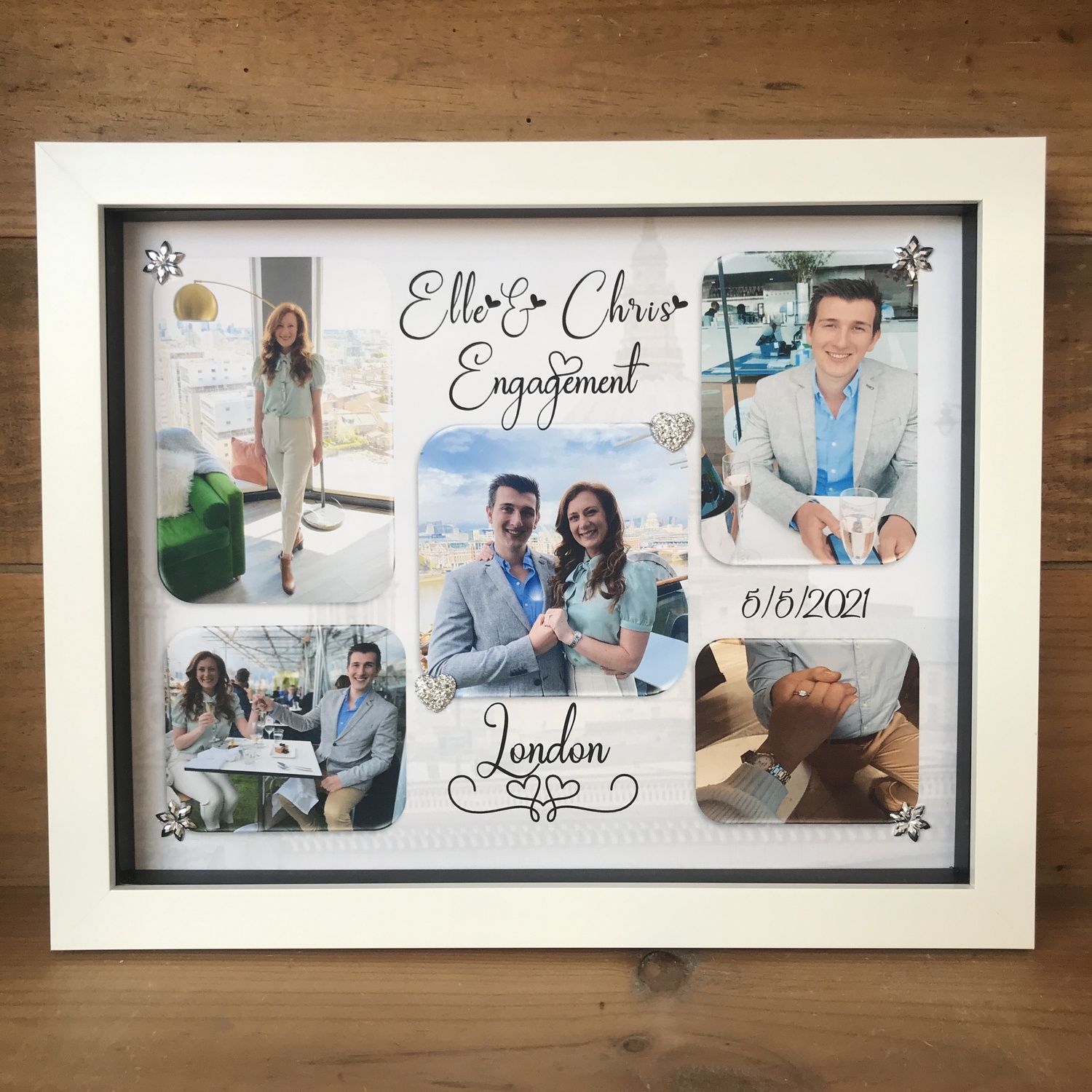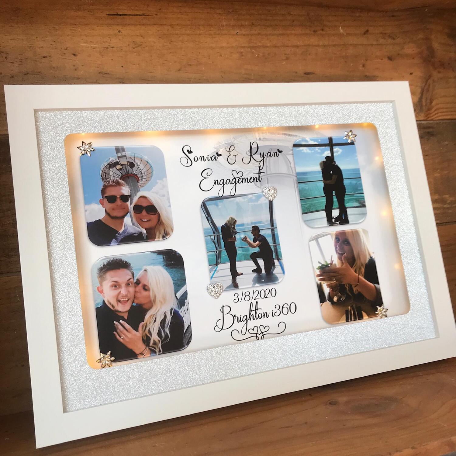 A romantic personalised gift/keepsake for you and your loved one, showing photos of the two of you to bring back happy memories of the moments the images were taken, or a thoughtful engagement, wedding or anniversary gift and a unique way to remember a special occasion. You may upload up to five photos to be included in the frame and Led Lights may be added too.
