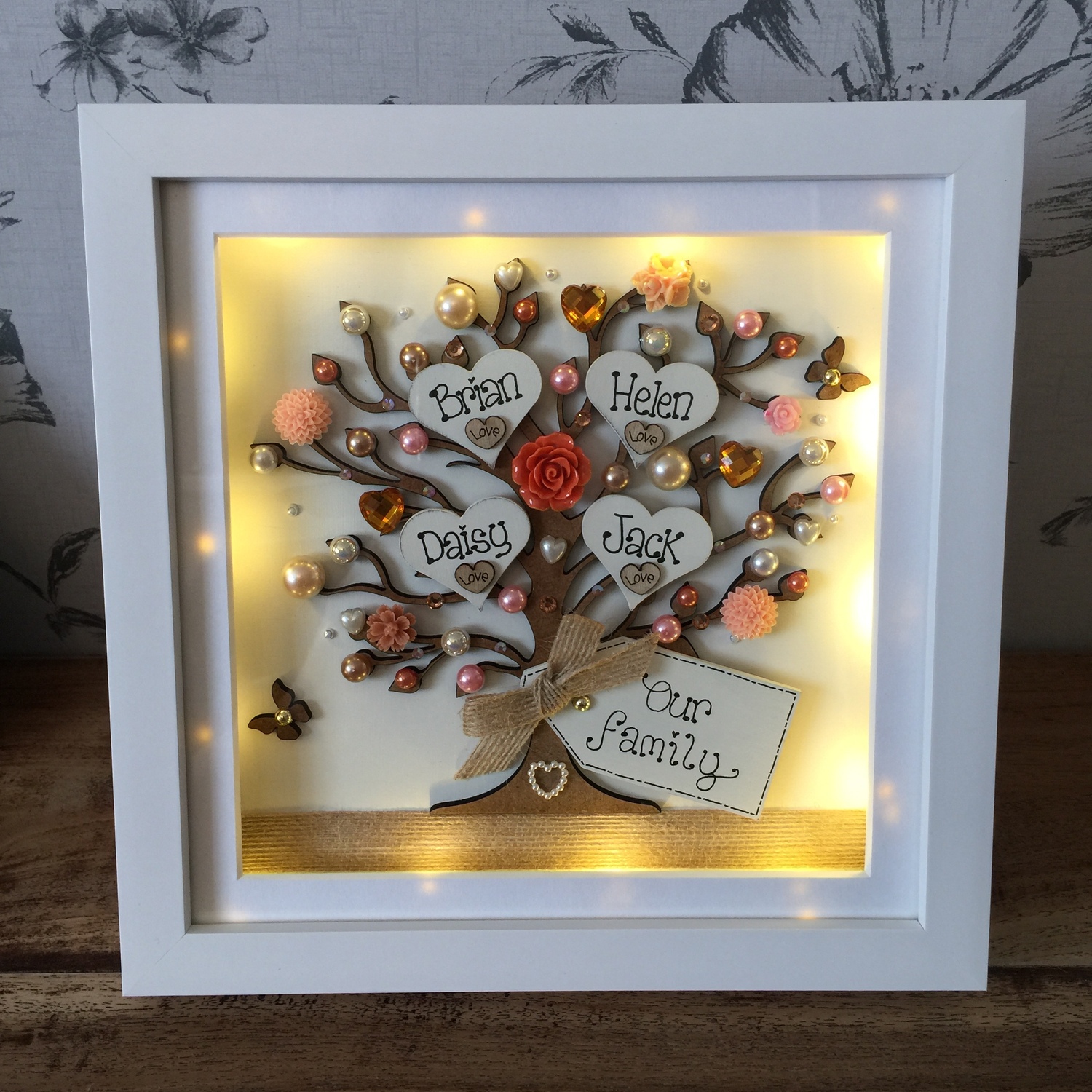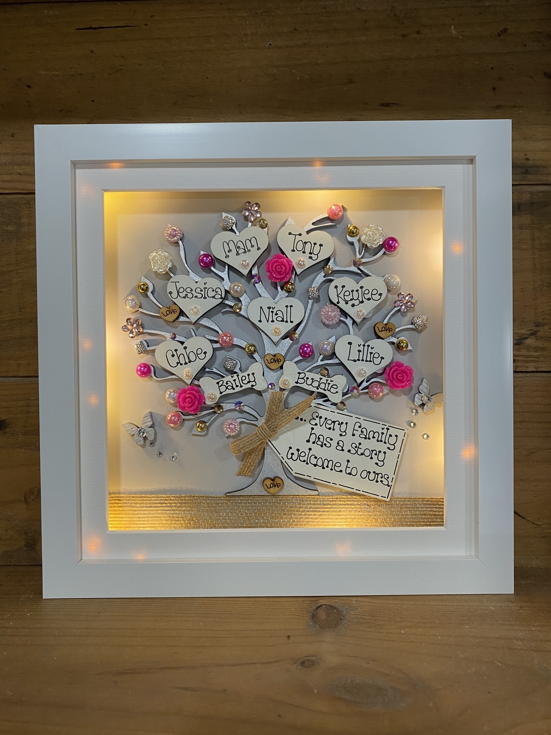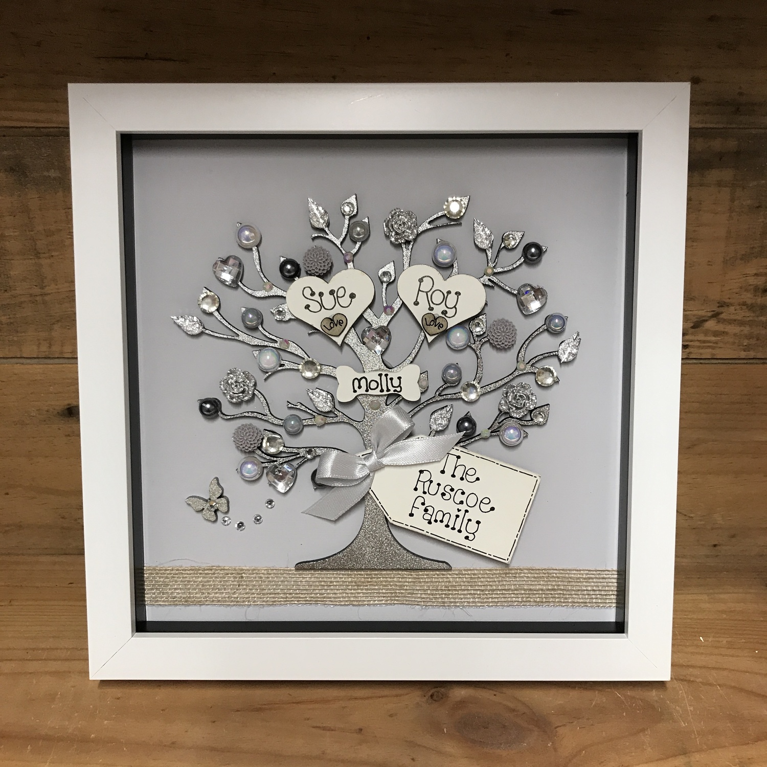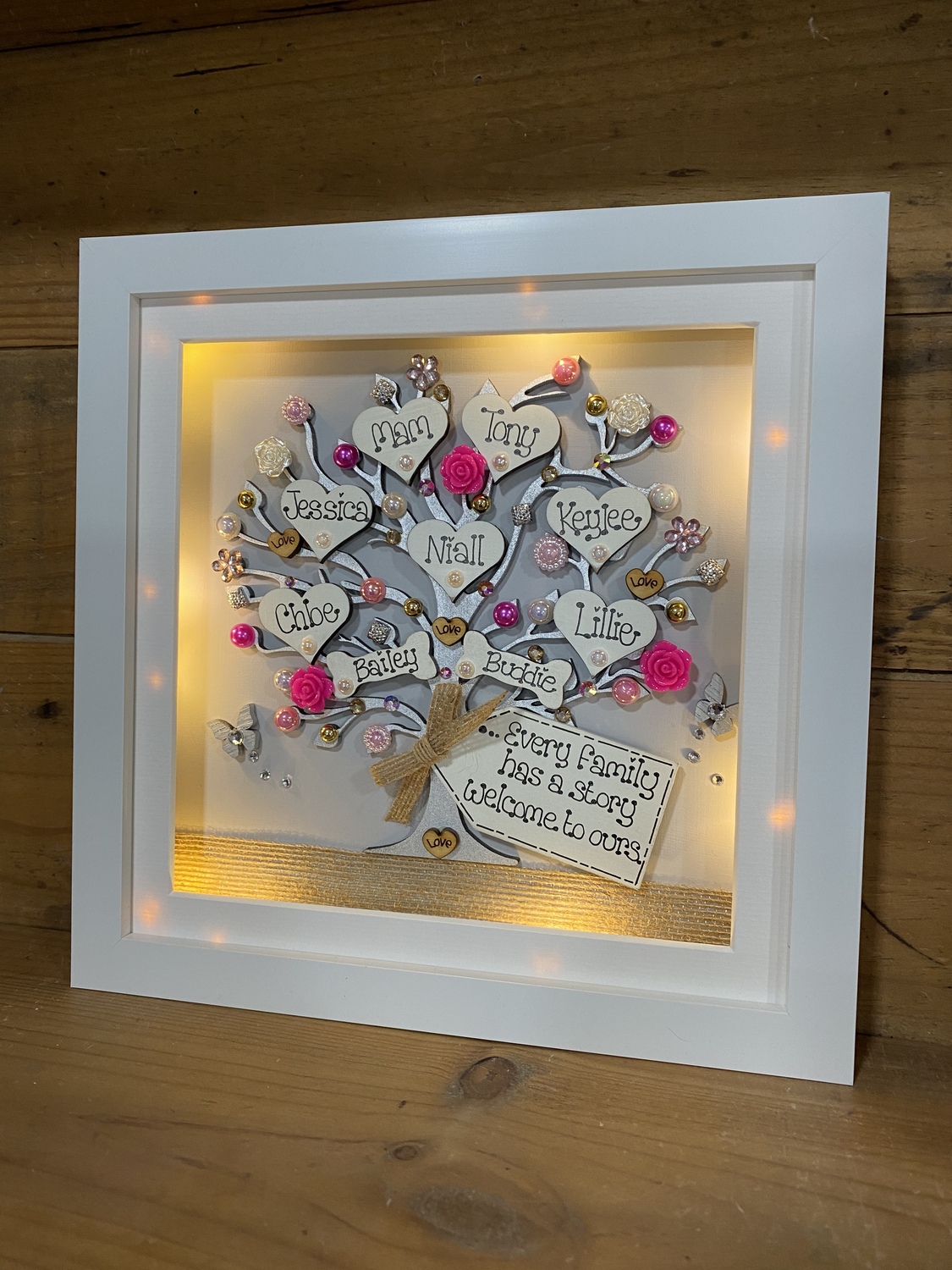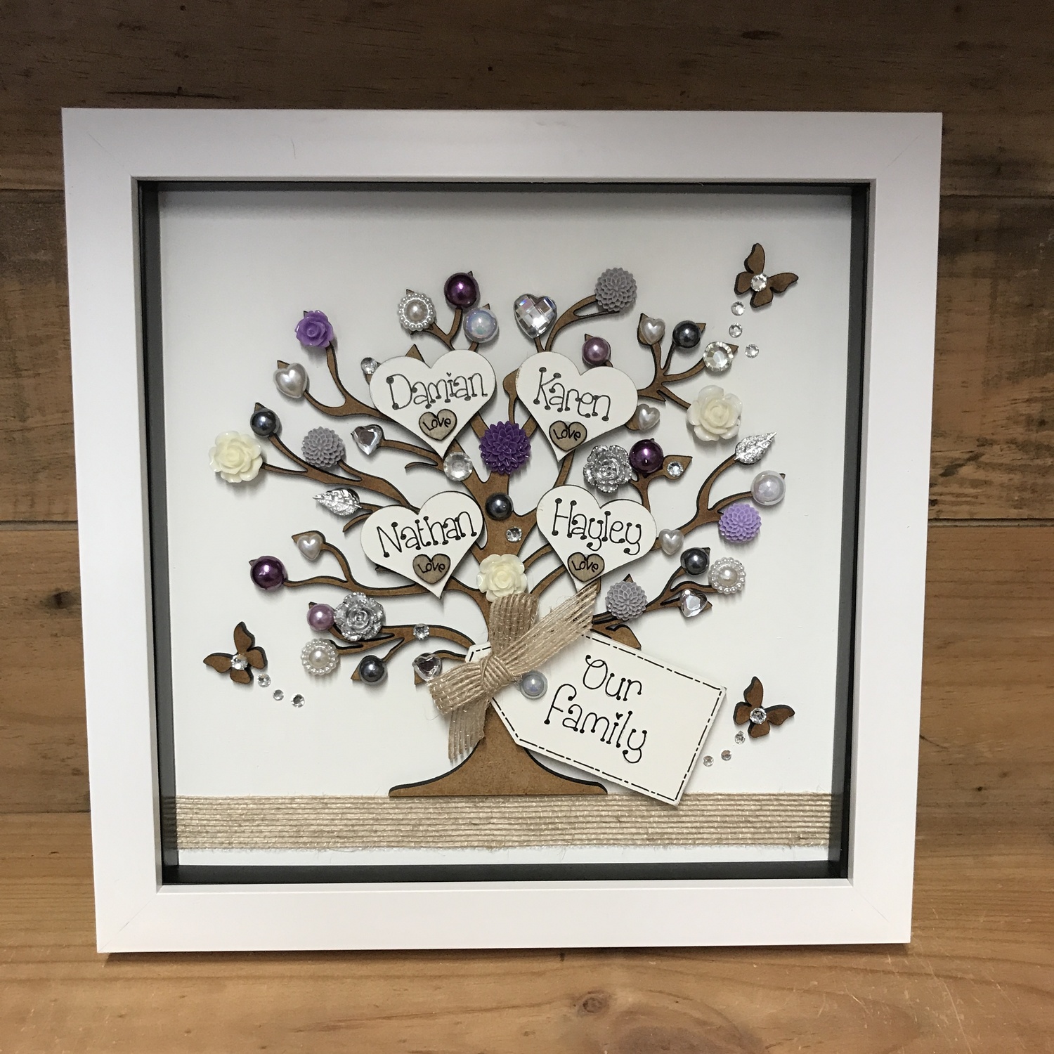 Beautiful Unique Family tree frame. The laser cut tree can be left natural or sprayed silver/gold and is embellished with hearts gems, flowers , pearls and diamantes,