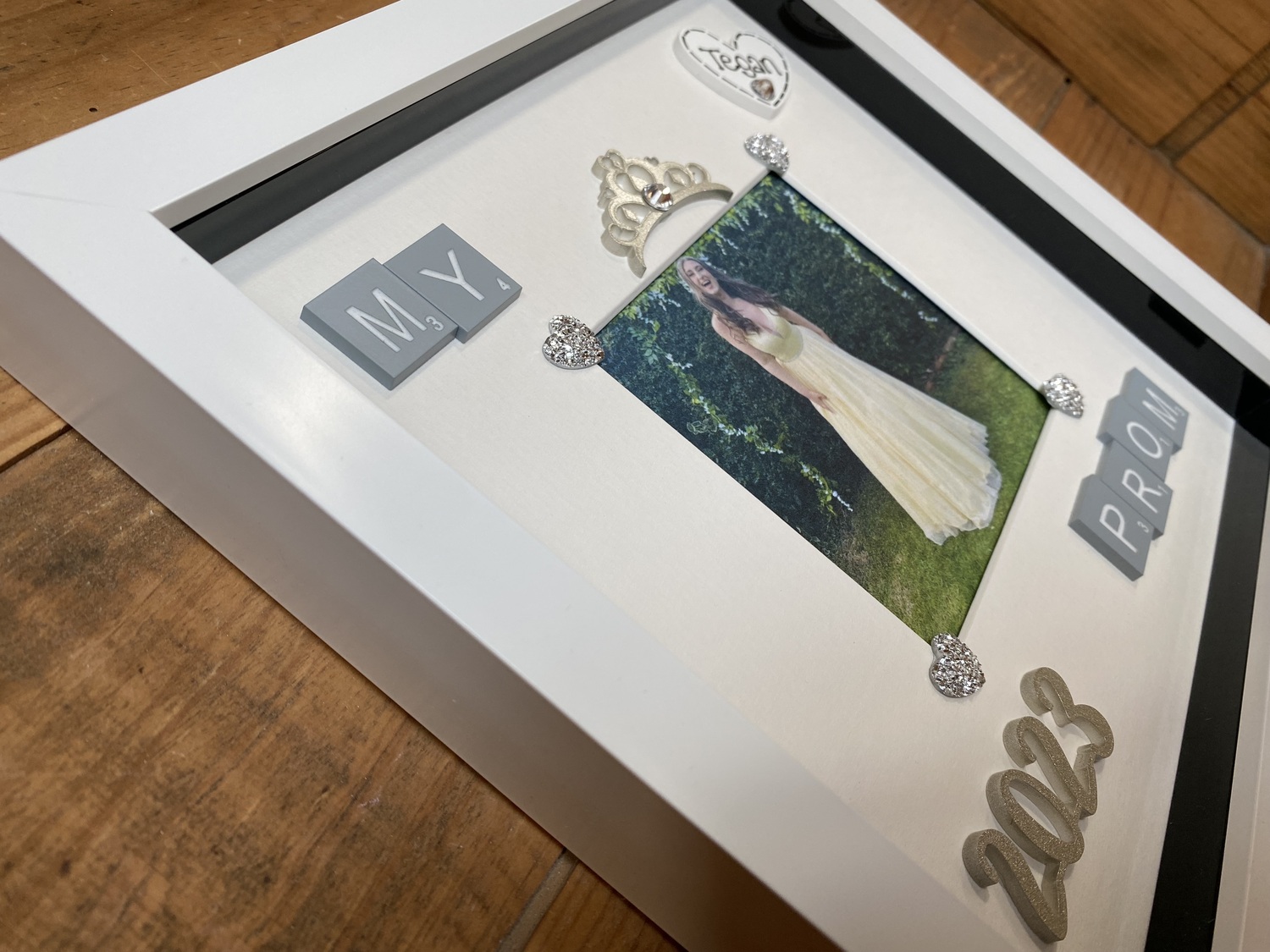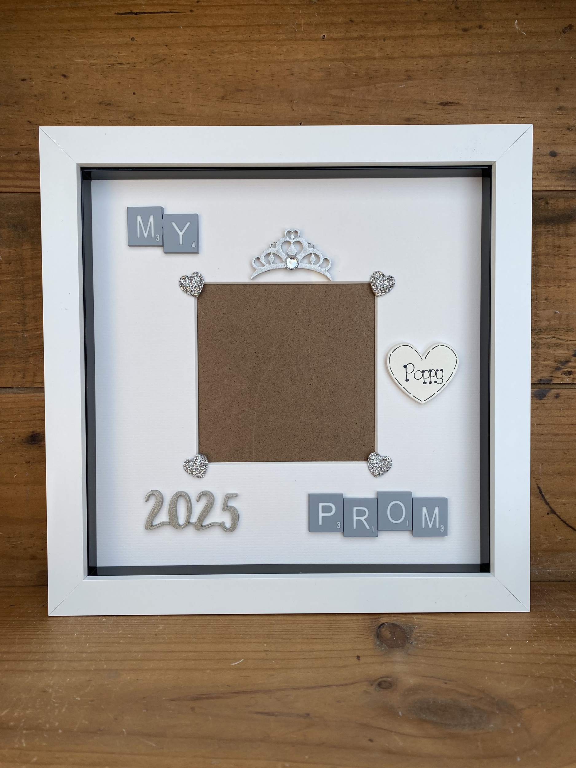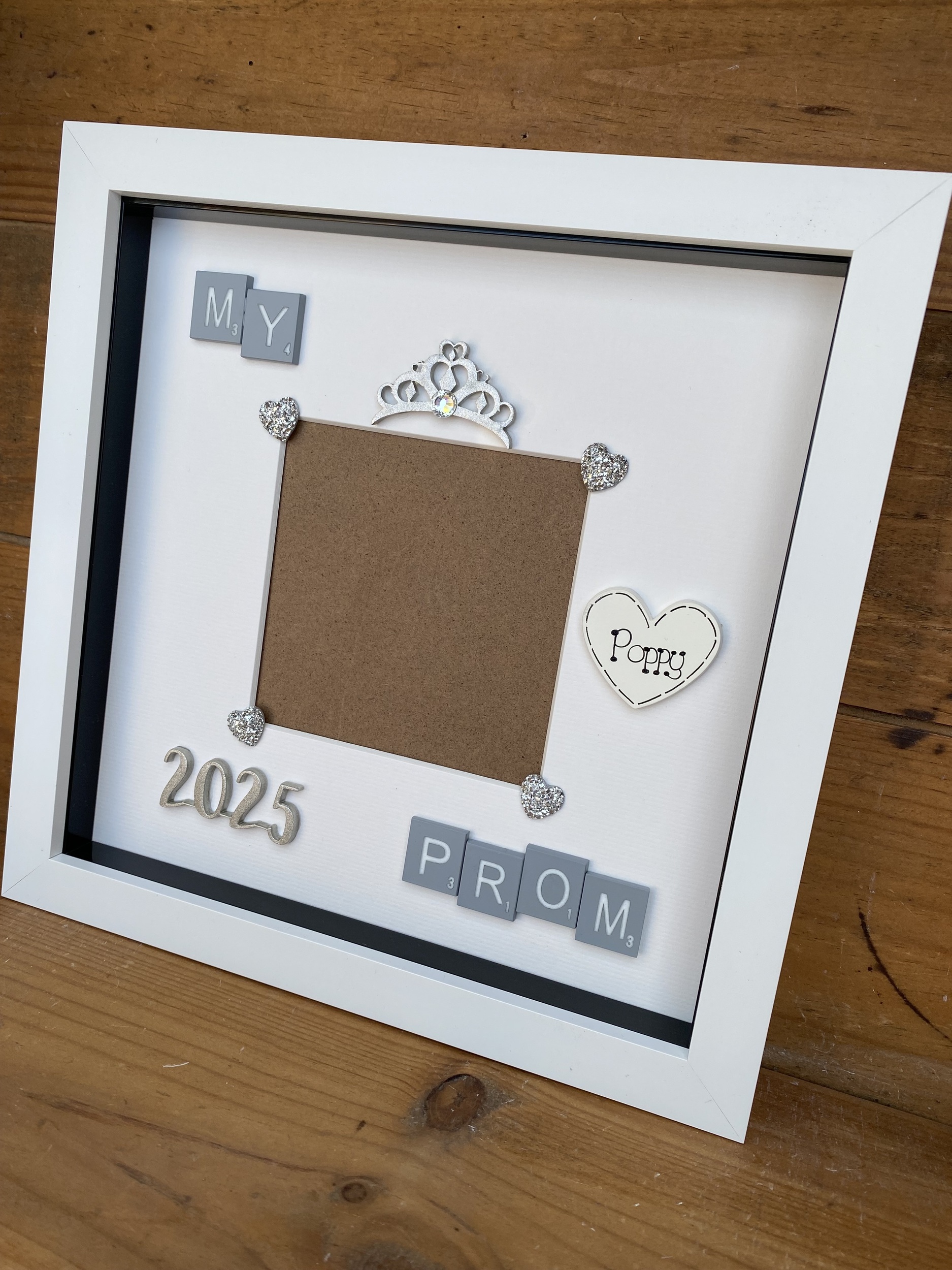 Embellished with grey scrabble tiles, a glitter silver tiara, date and silver hearts.