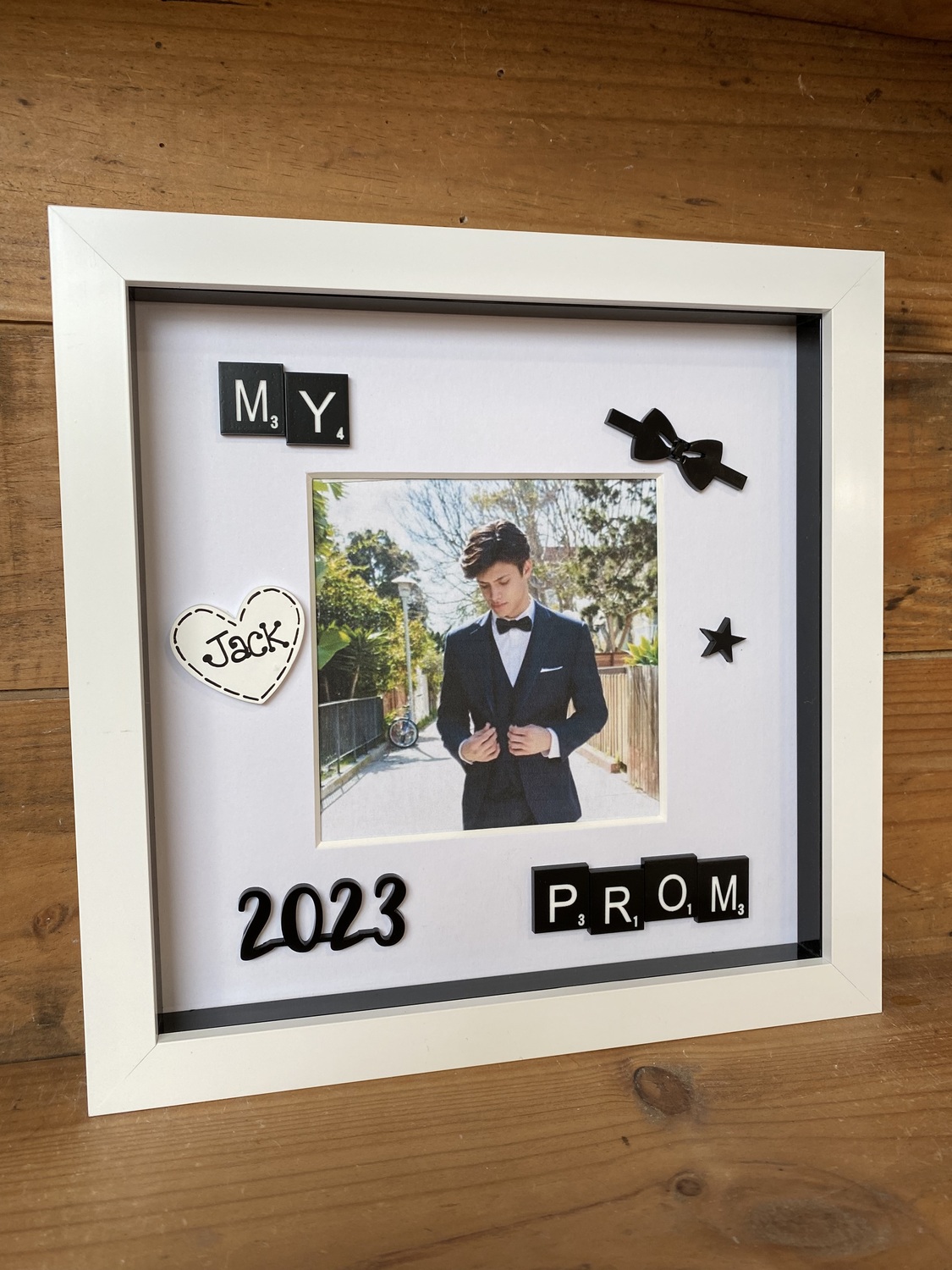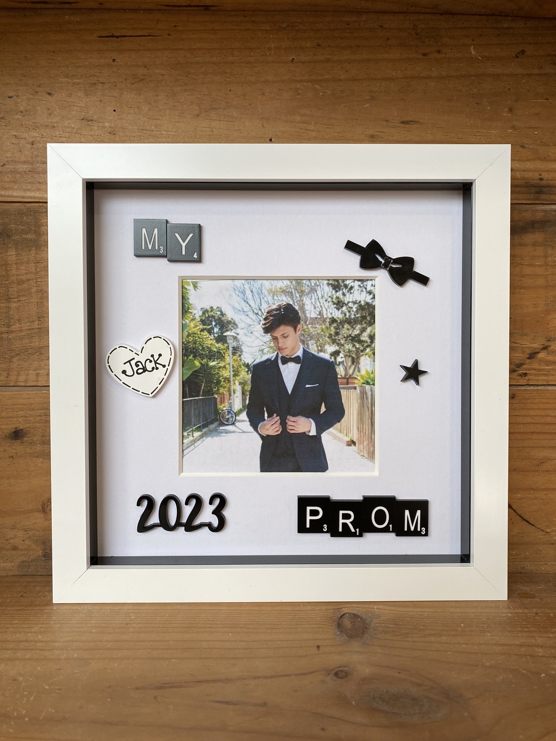 Embellished with black scrabble tiles, a black bow tie, date and stars.