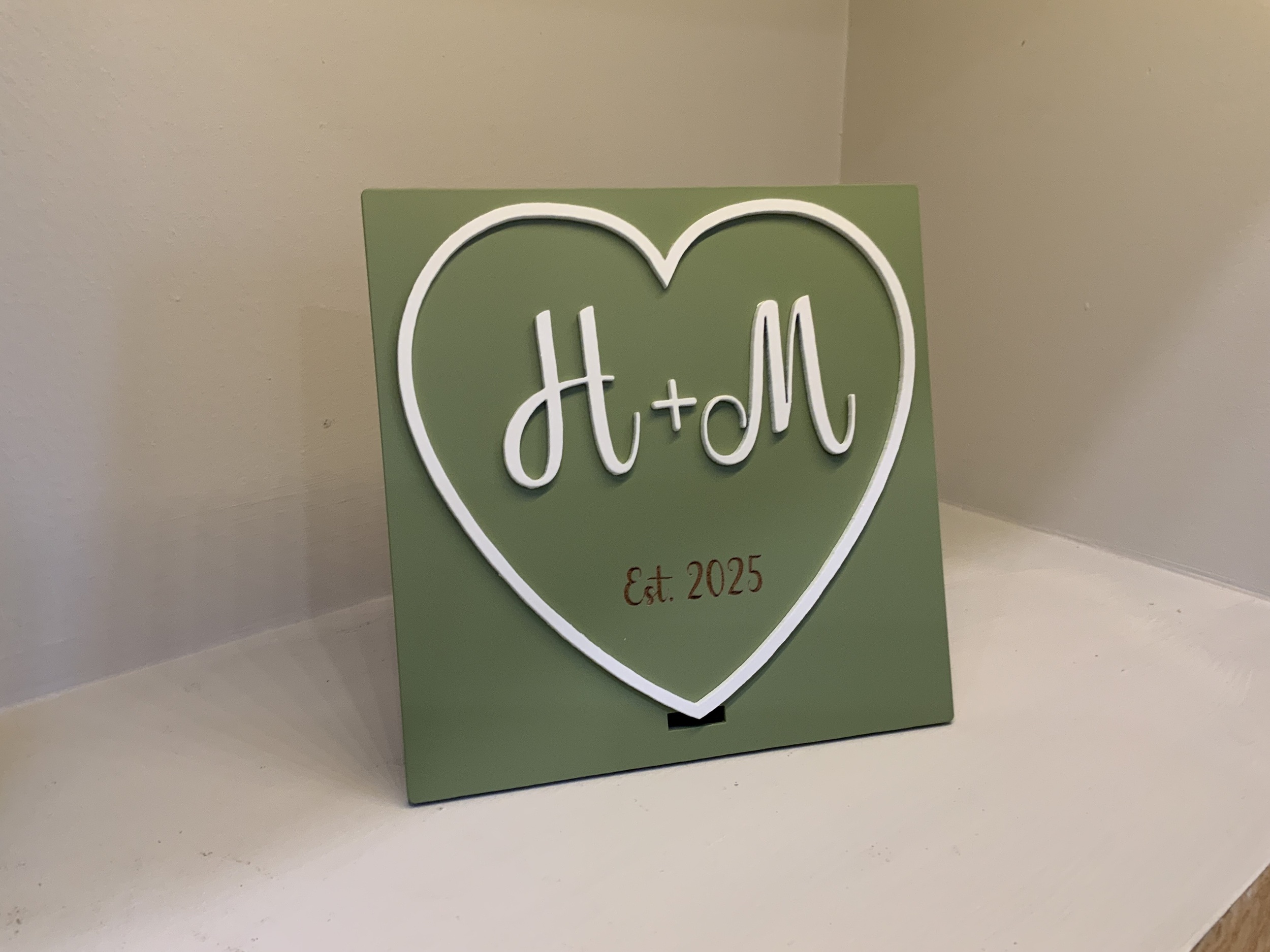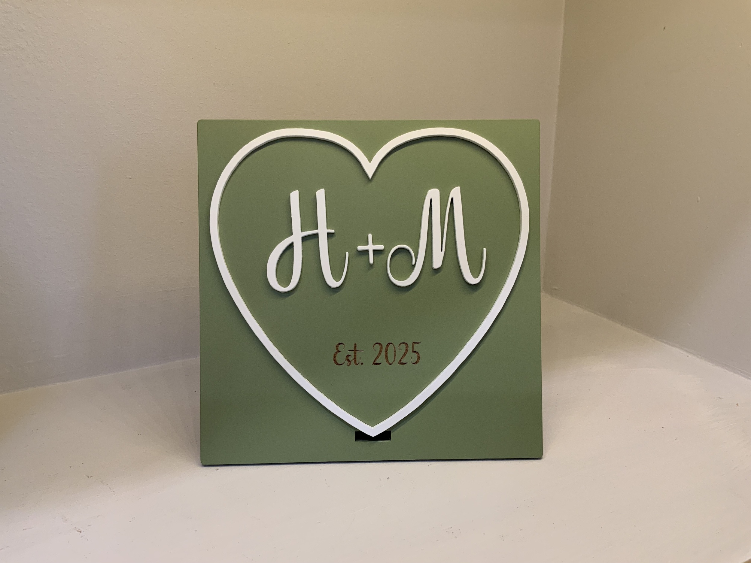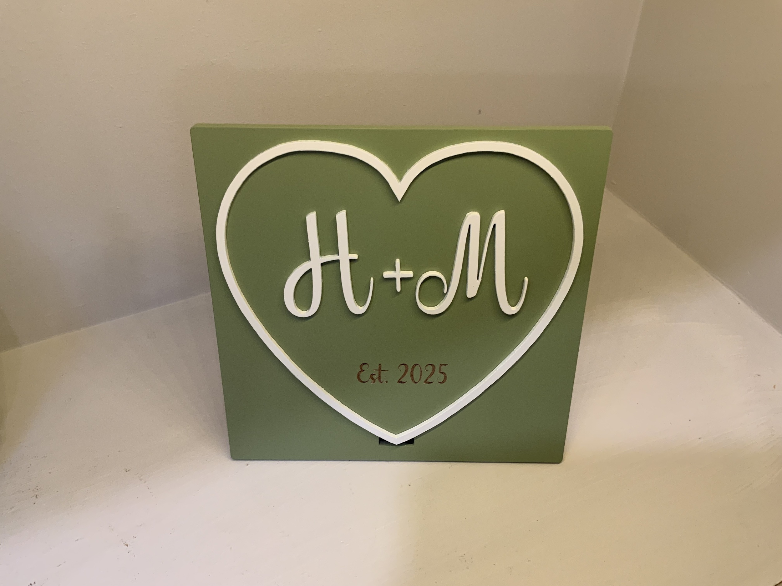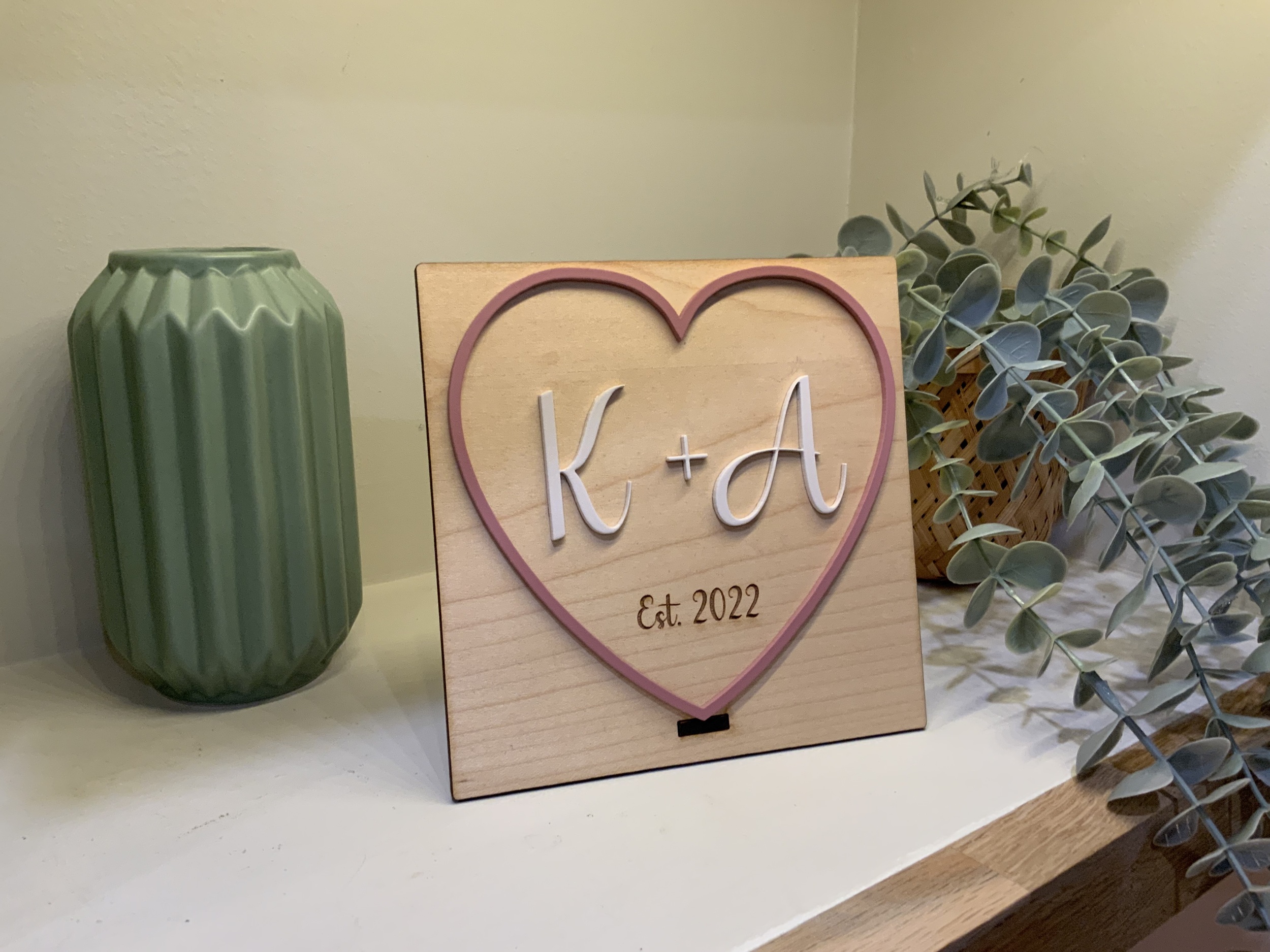 Each plaque is engraved with your chosen initials and an “Est.” year, creating a timeless piece that celebrates your story. The layered heart and lettering add lovely depth, giving it a premium, handmade feel.