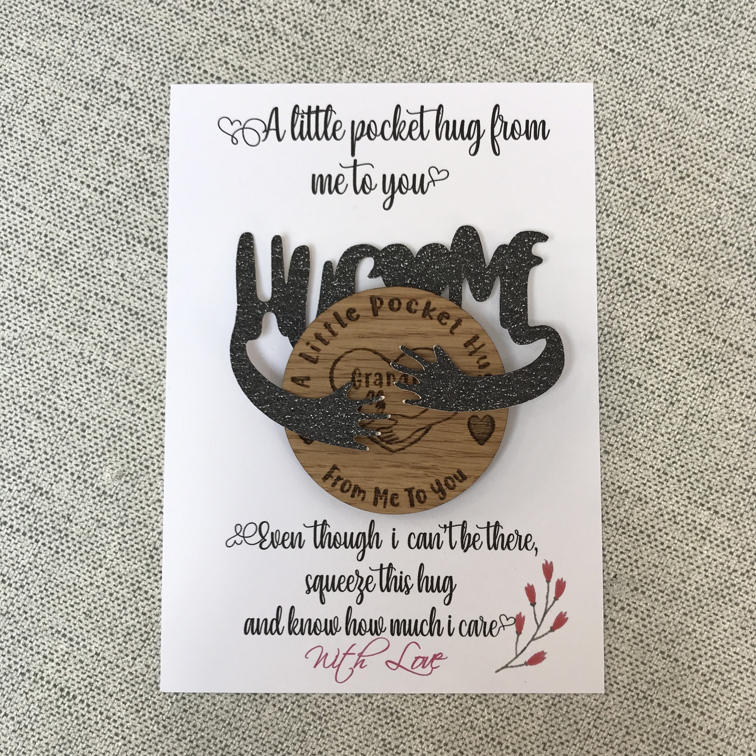 The pocket hug is made from oak and can be personalised with the recipients name.