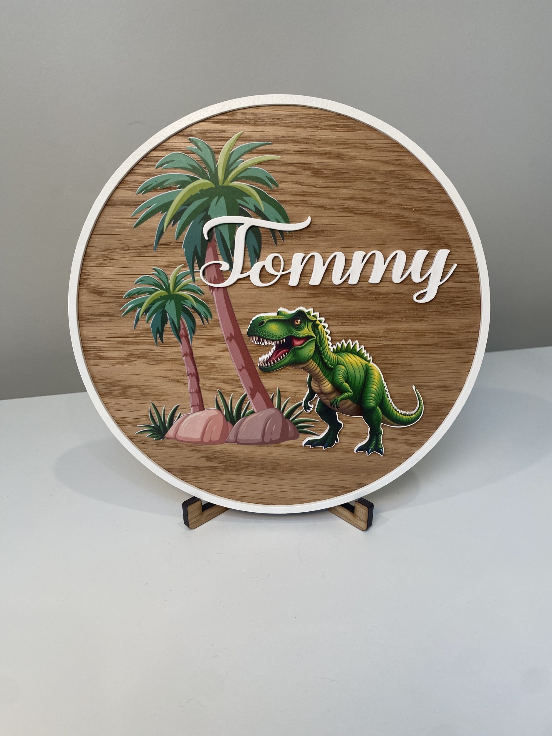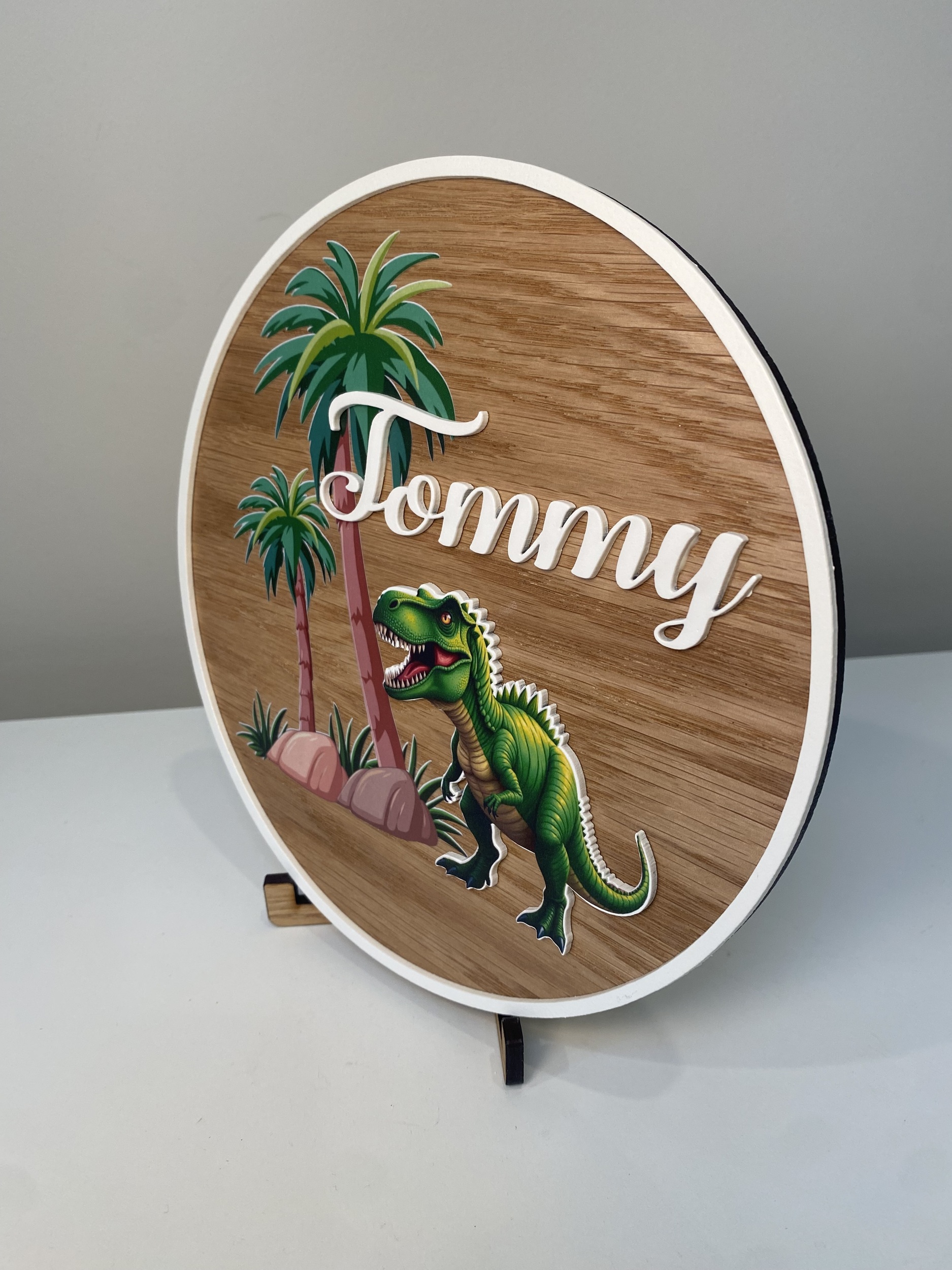 🦖 Custom made with their name for a unique touch🌿 3D dinosaur design featuring playful prehistoric creatures🌳 Premium oak veneer for durability and style🔹 Versatile display – Can be hung on a door or placed on a shelf using the included stand📏 19.5cm size to make an impact
