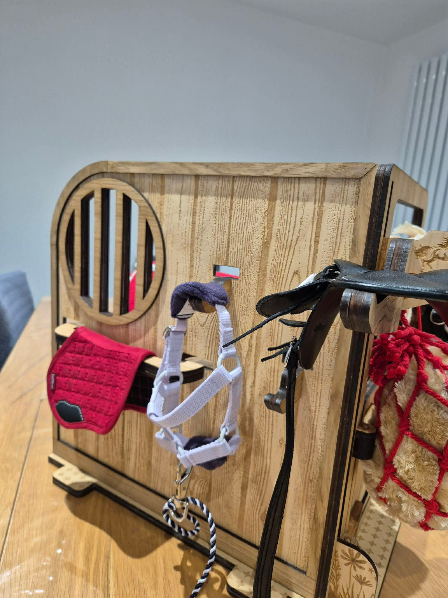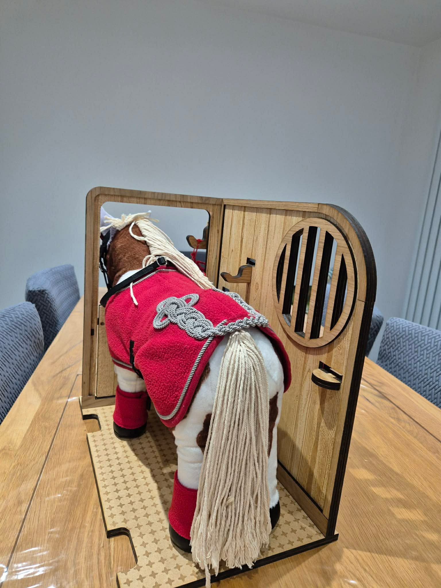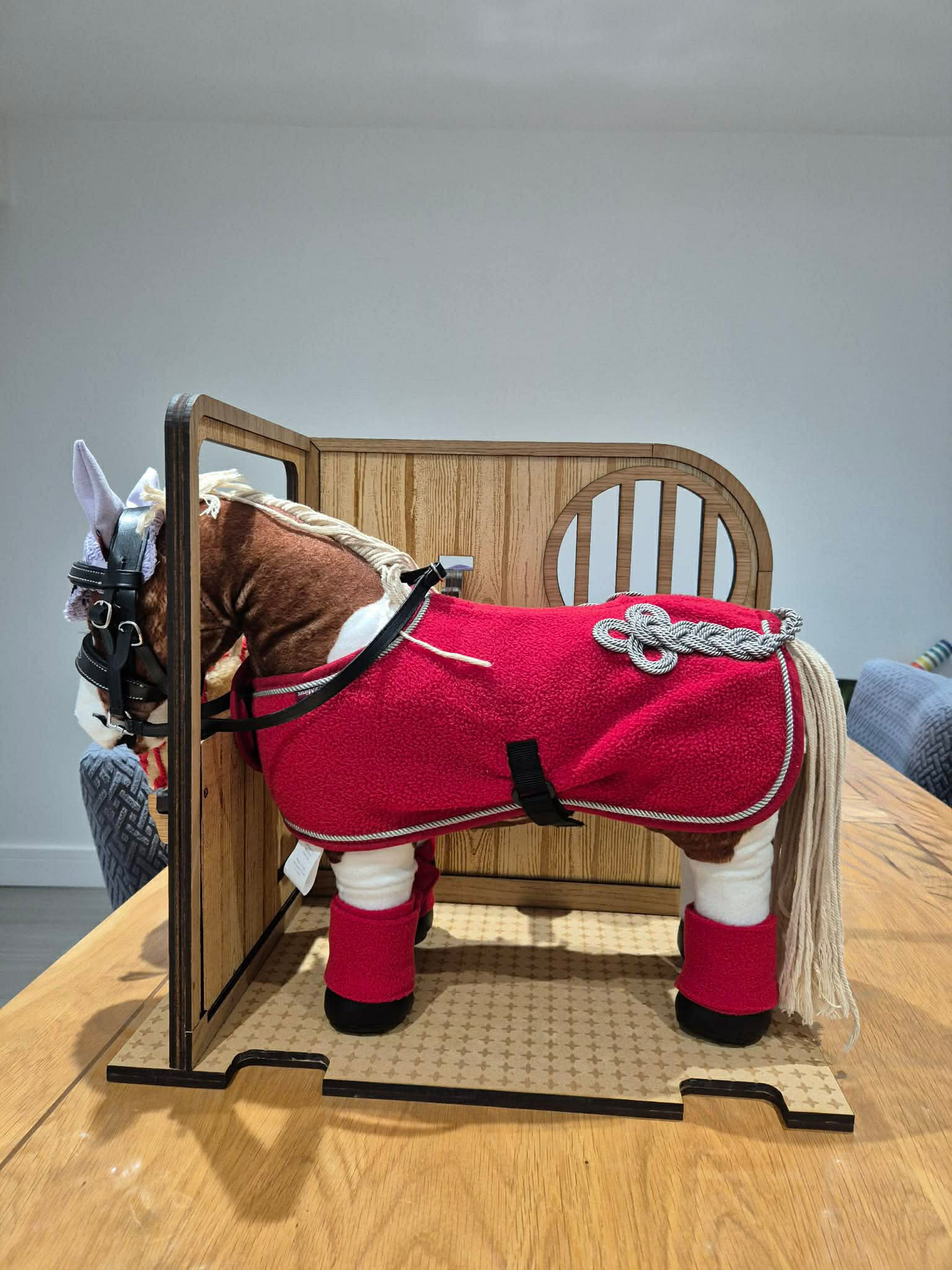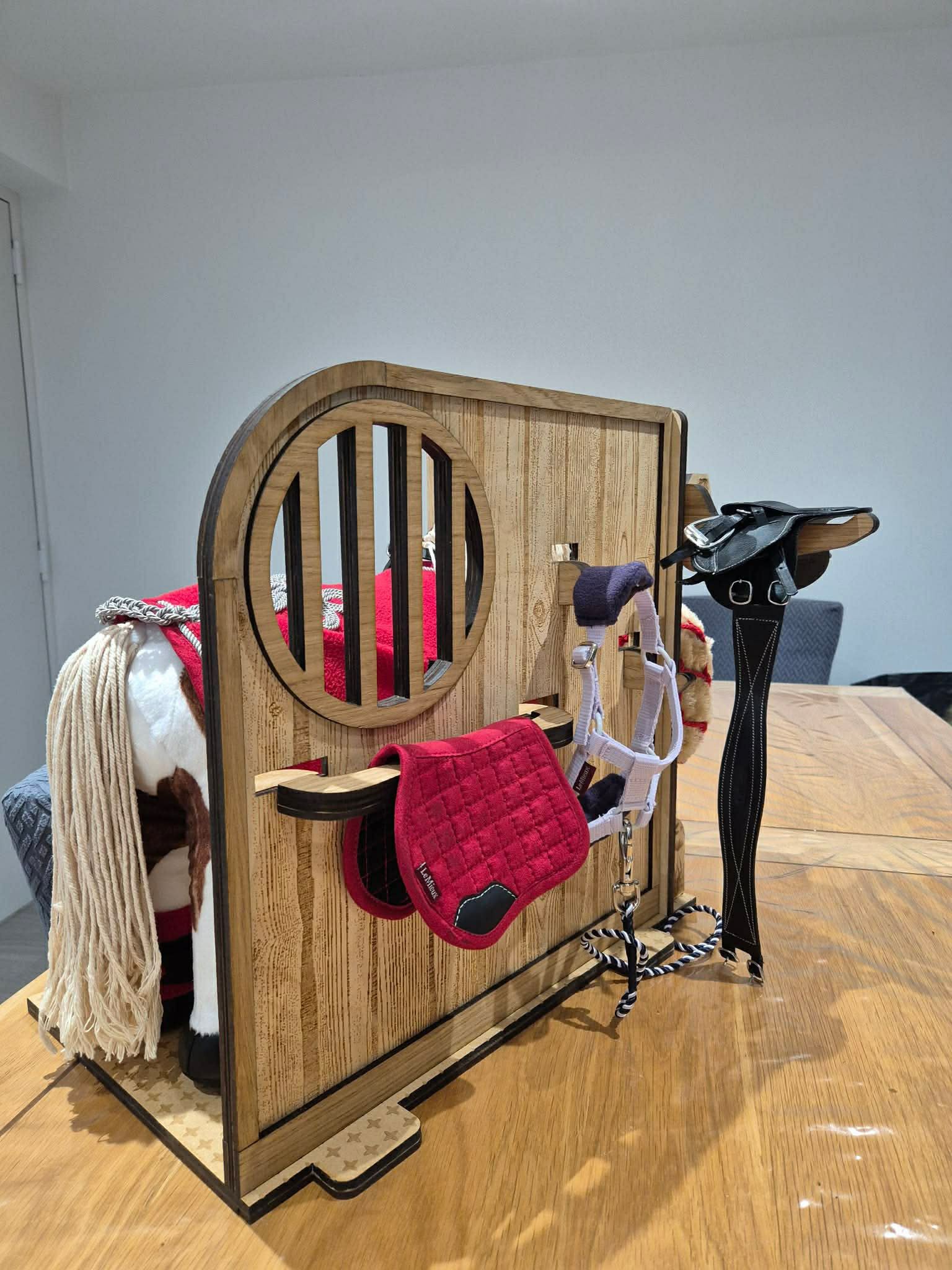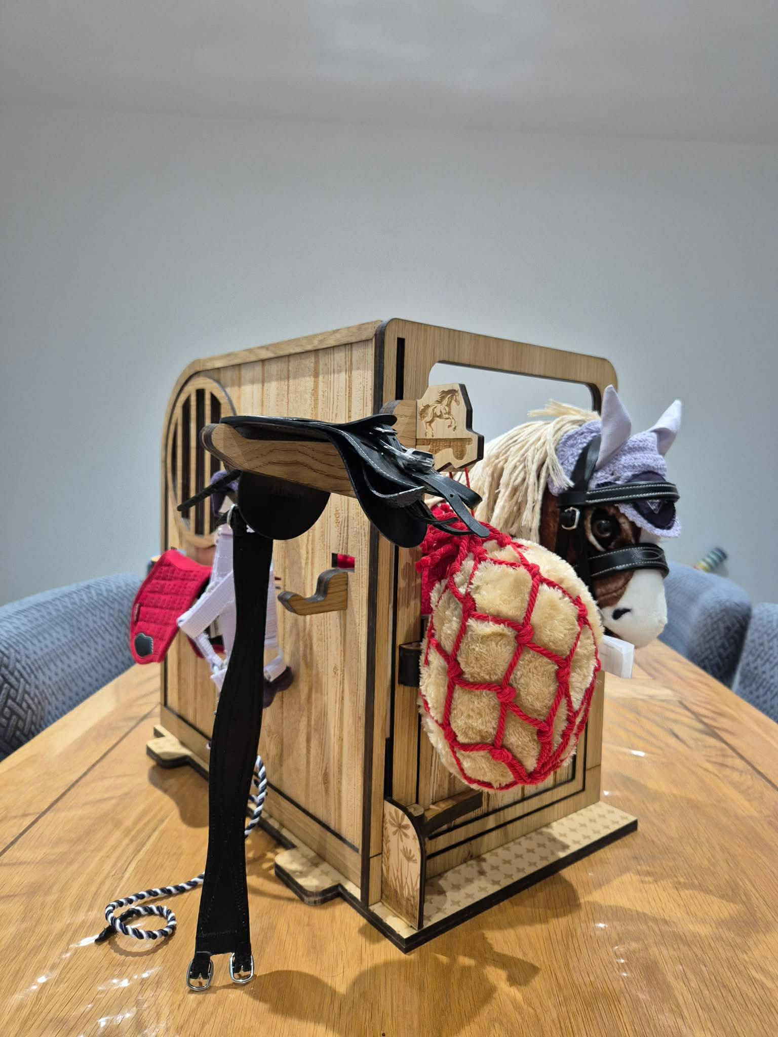 A beautifully handmade wooden pony stable, perfectly sized for LeMieux toy ponies, ideal for imaginative play and tidy storage.