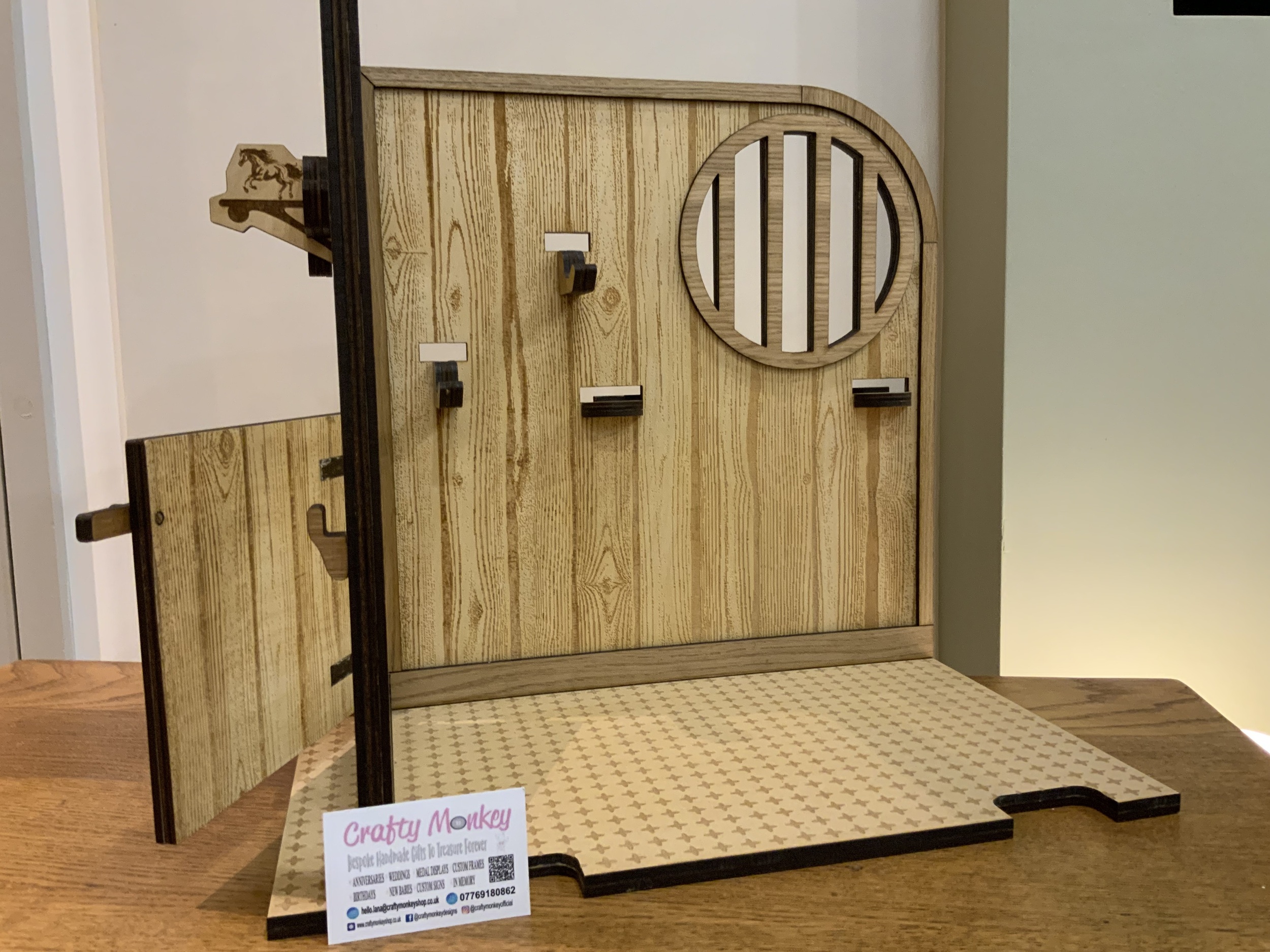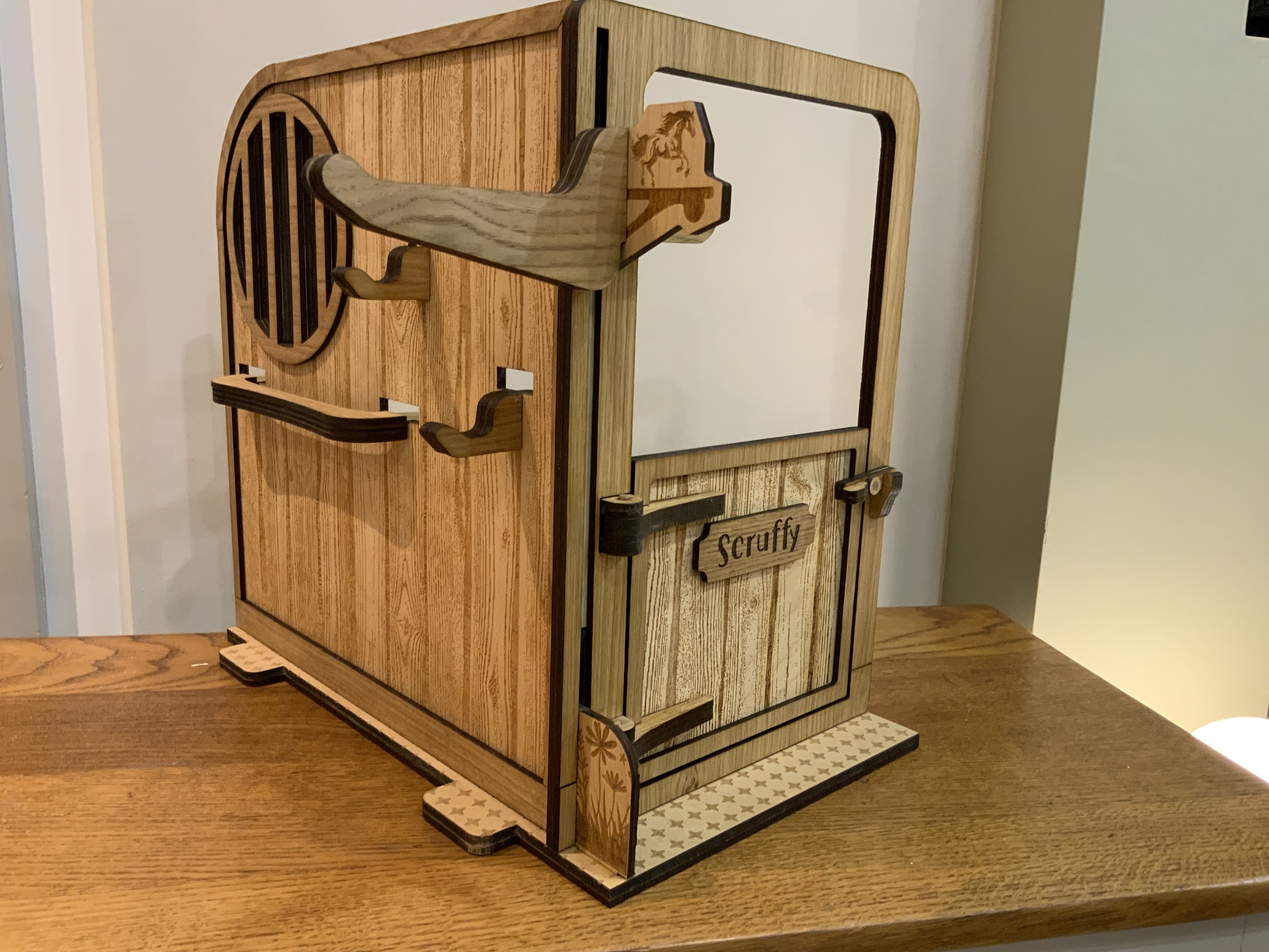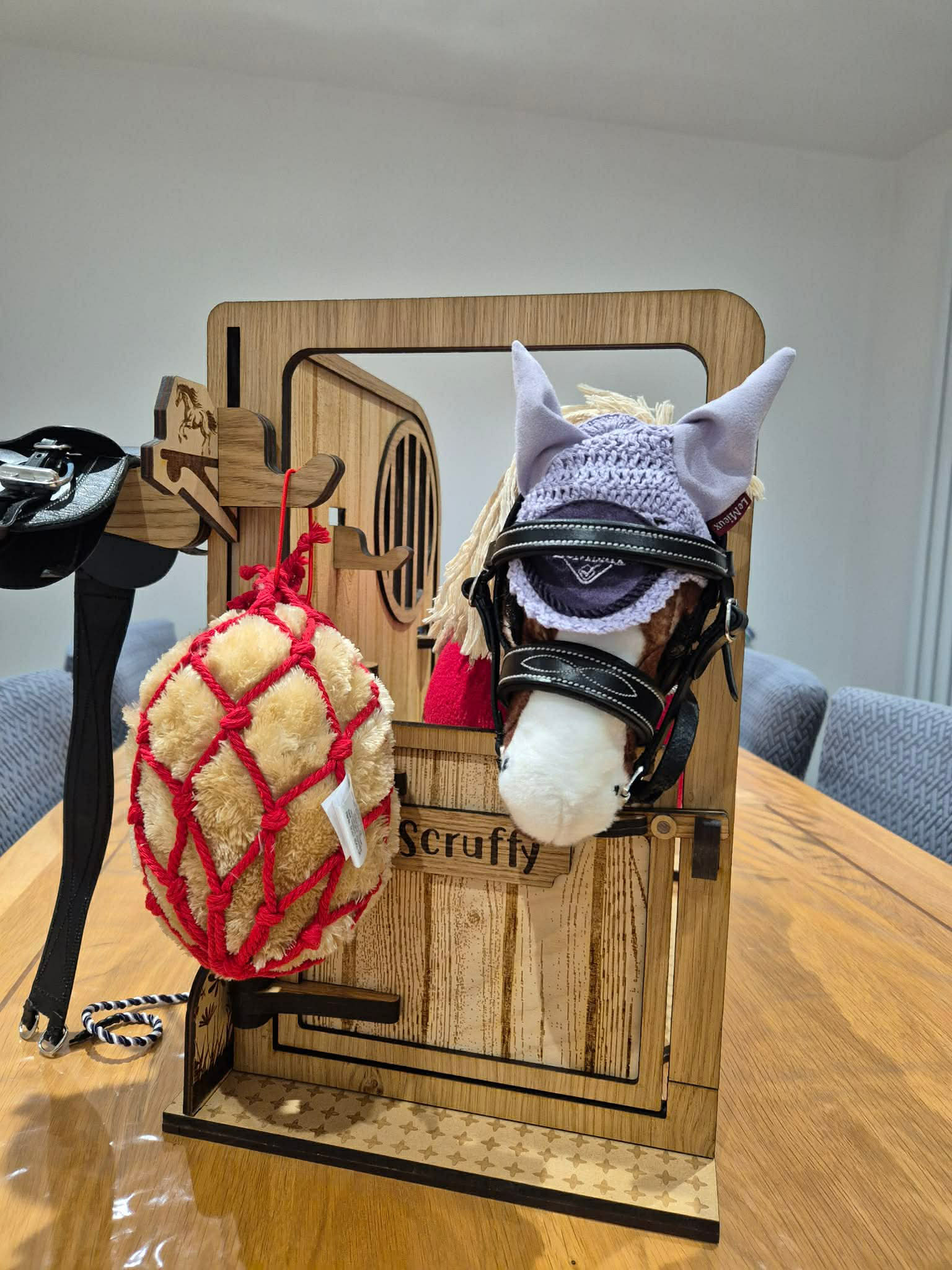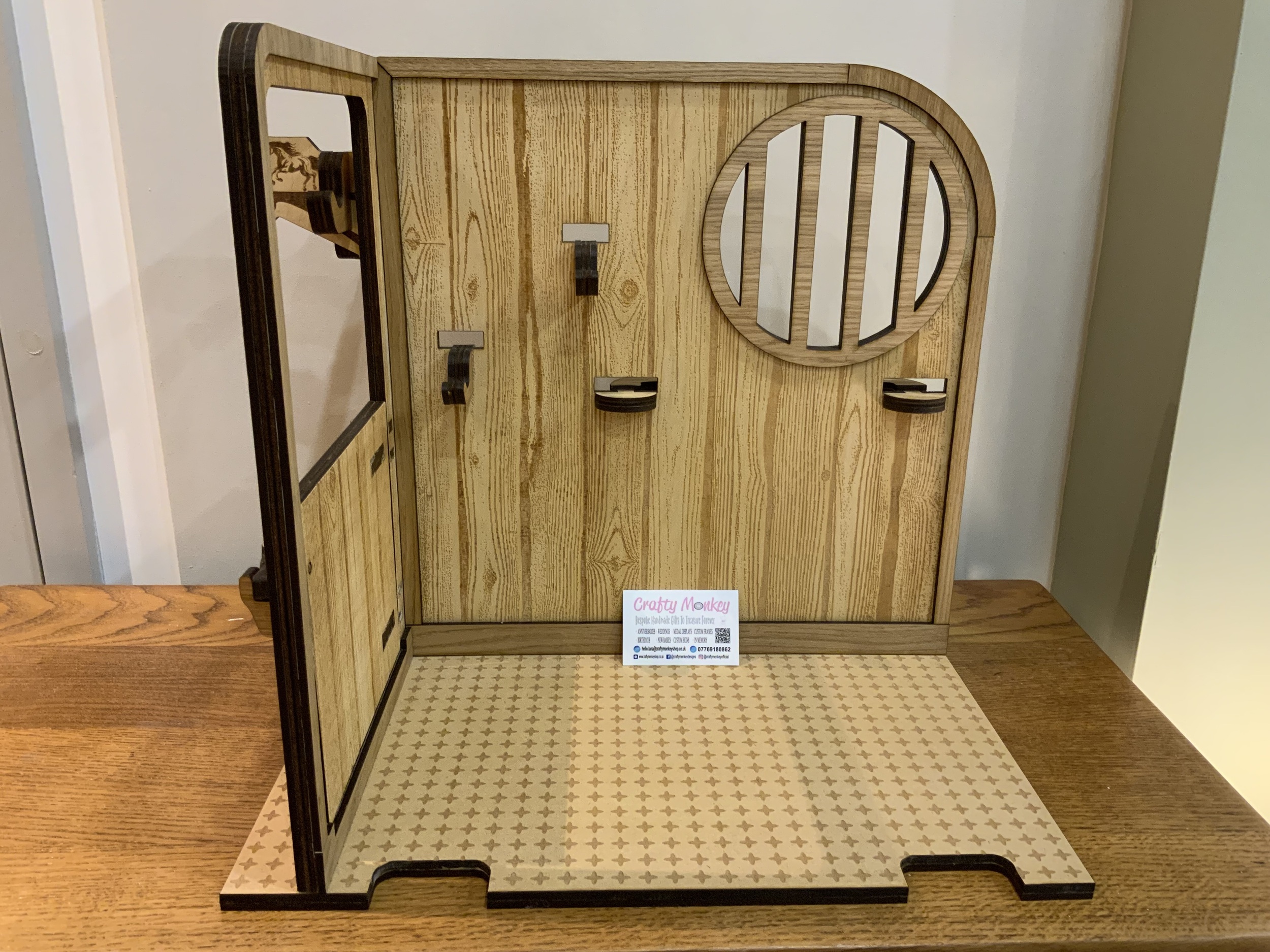 A beautifully handmade wooden pony stable, perfectly sized for LeMieux toy ponies, ideal for imaginative play and tidy storage.