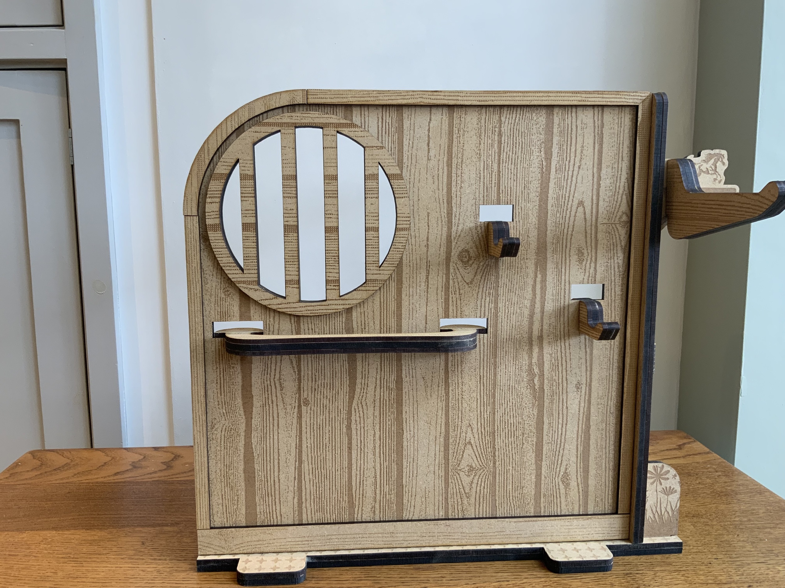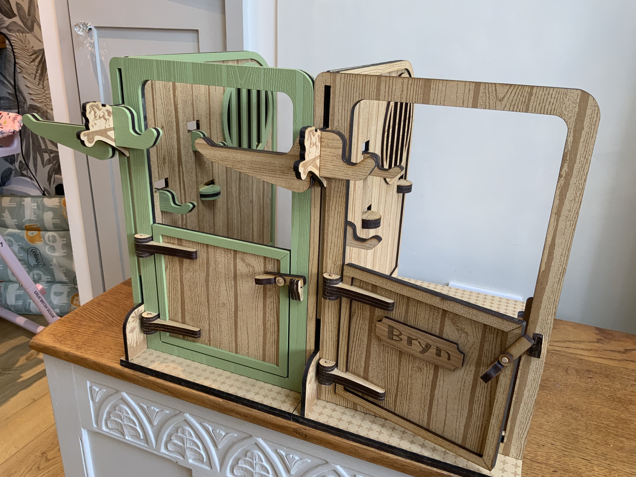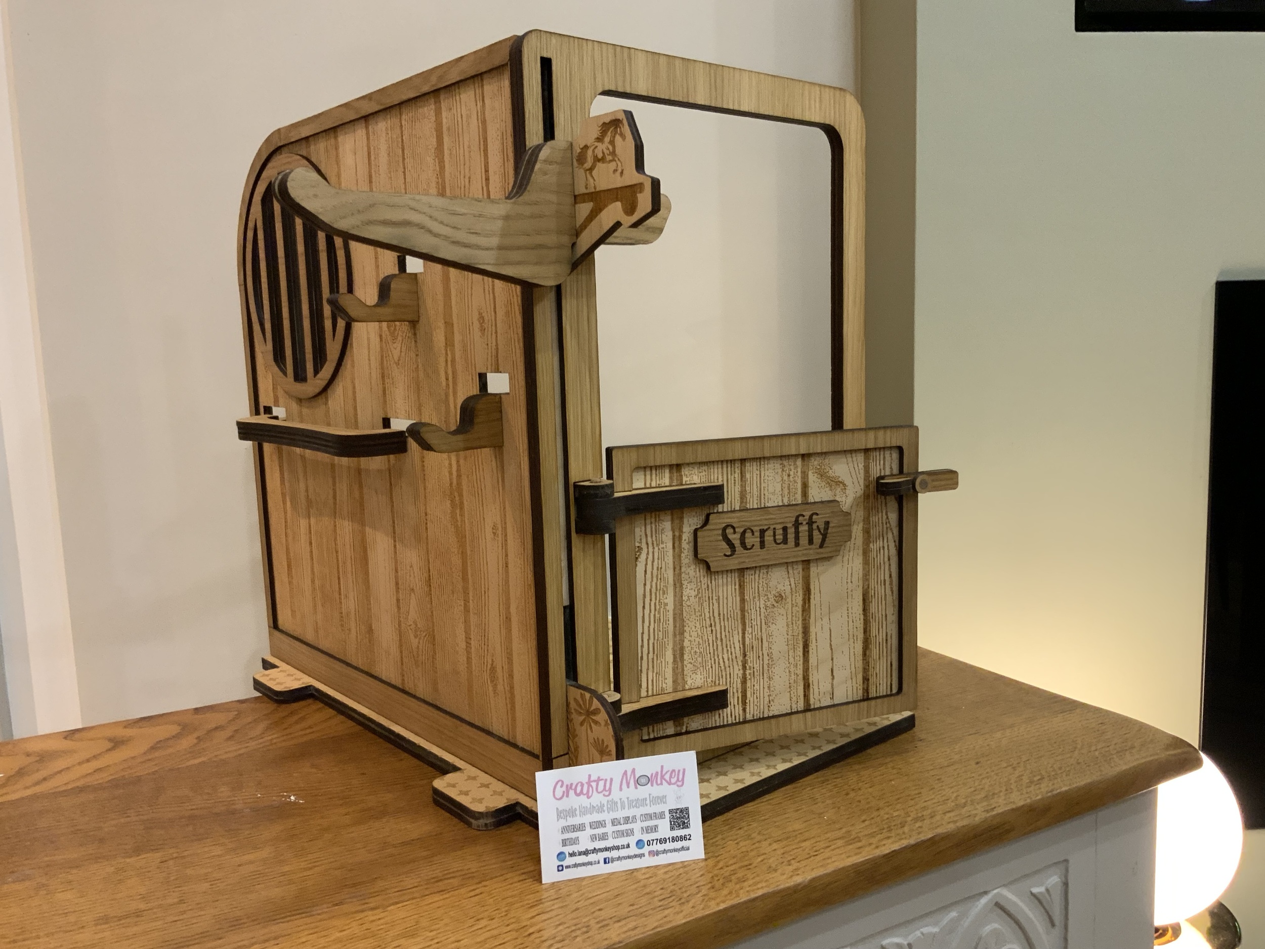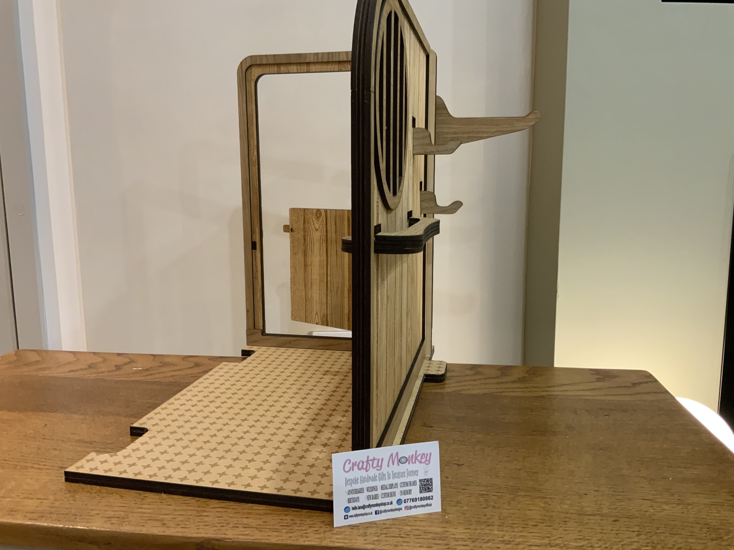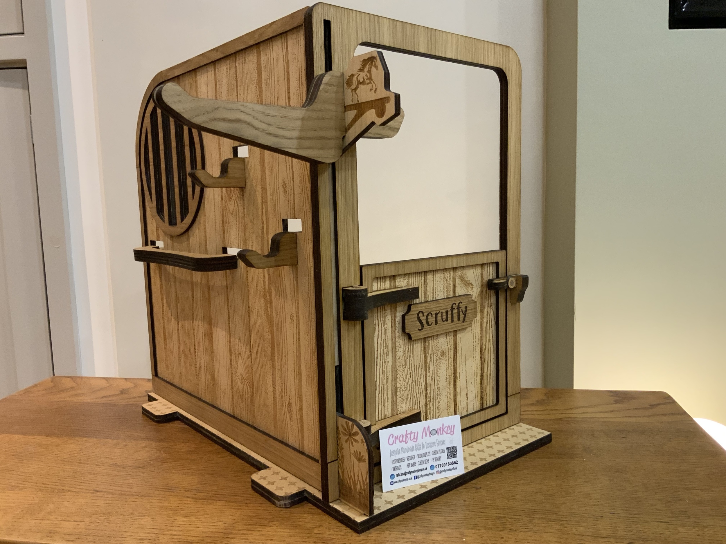 A beautifully handmade wooden pony stable, perfectly sized for LeMieux toy ponies, ideal for imaginative play and tidy storage.