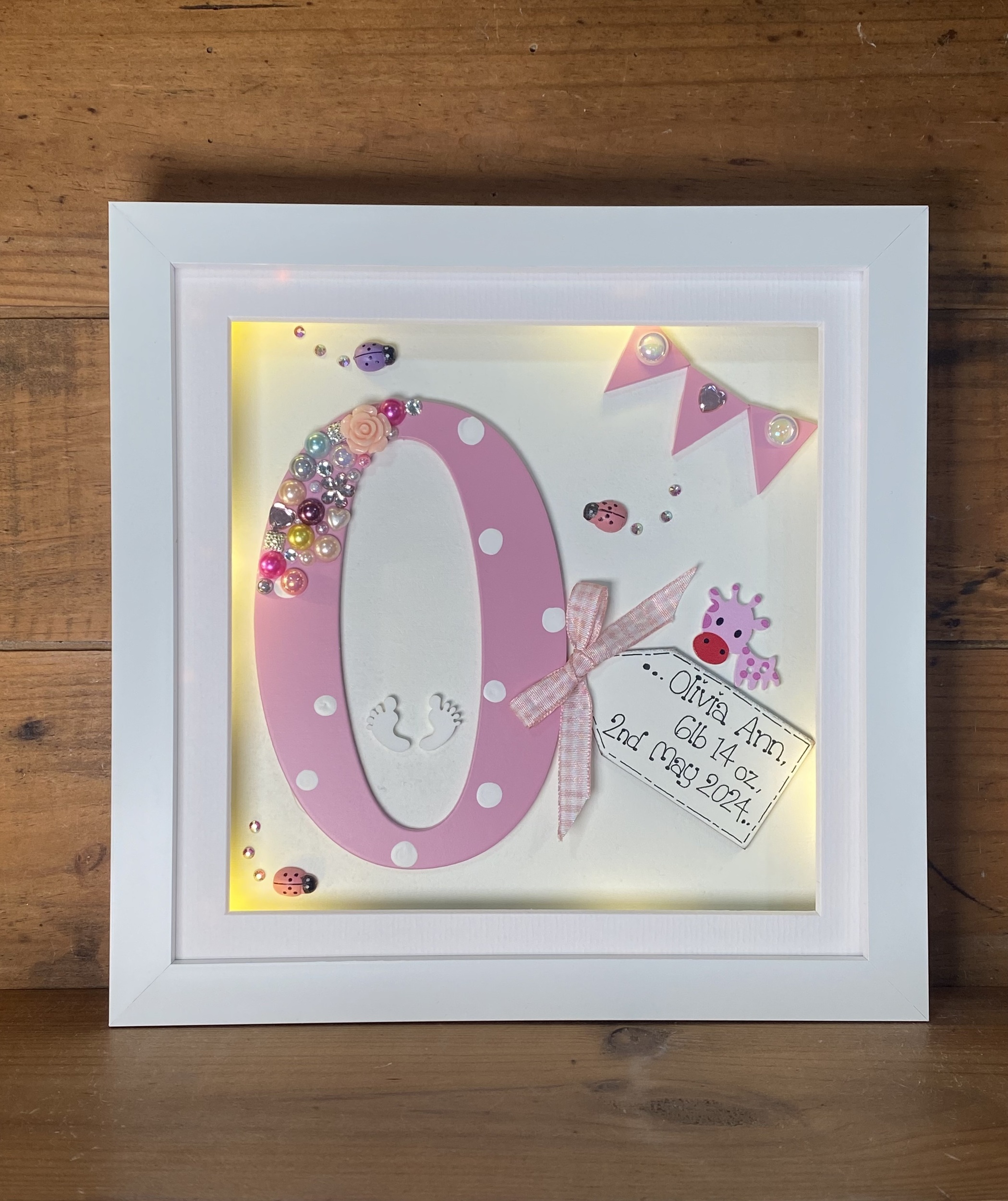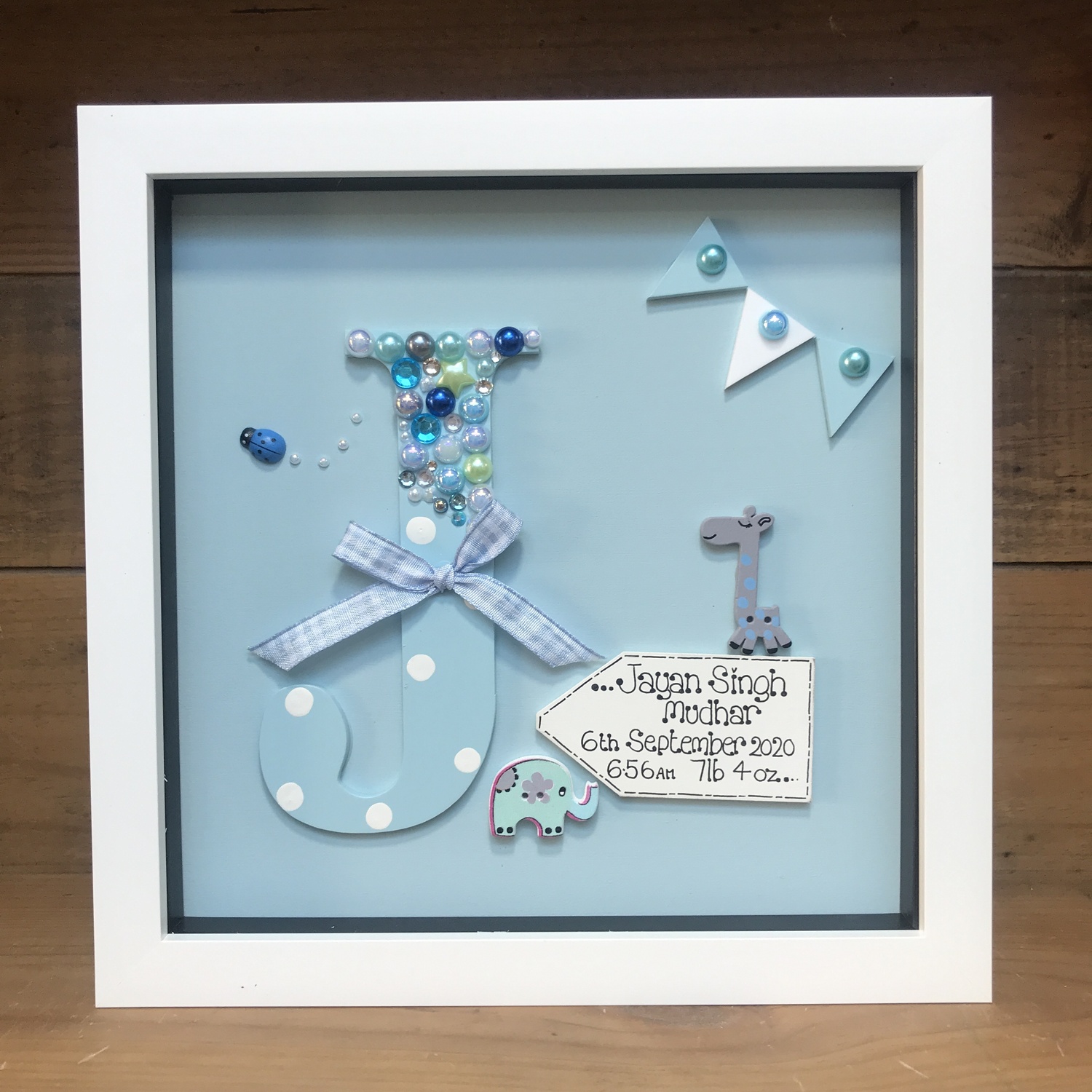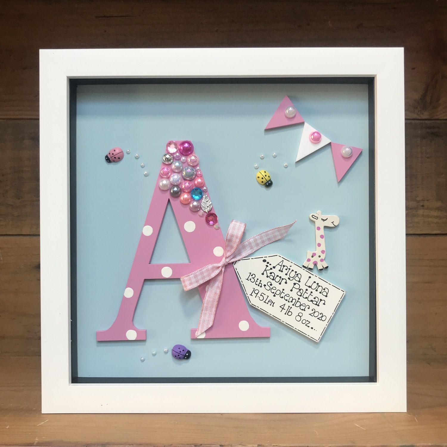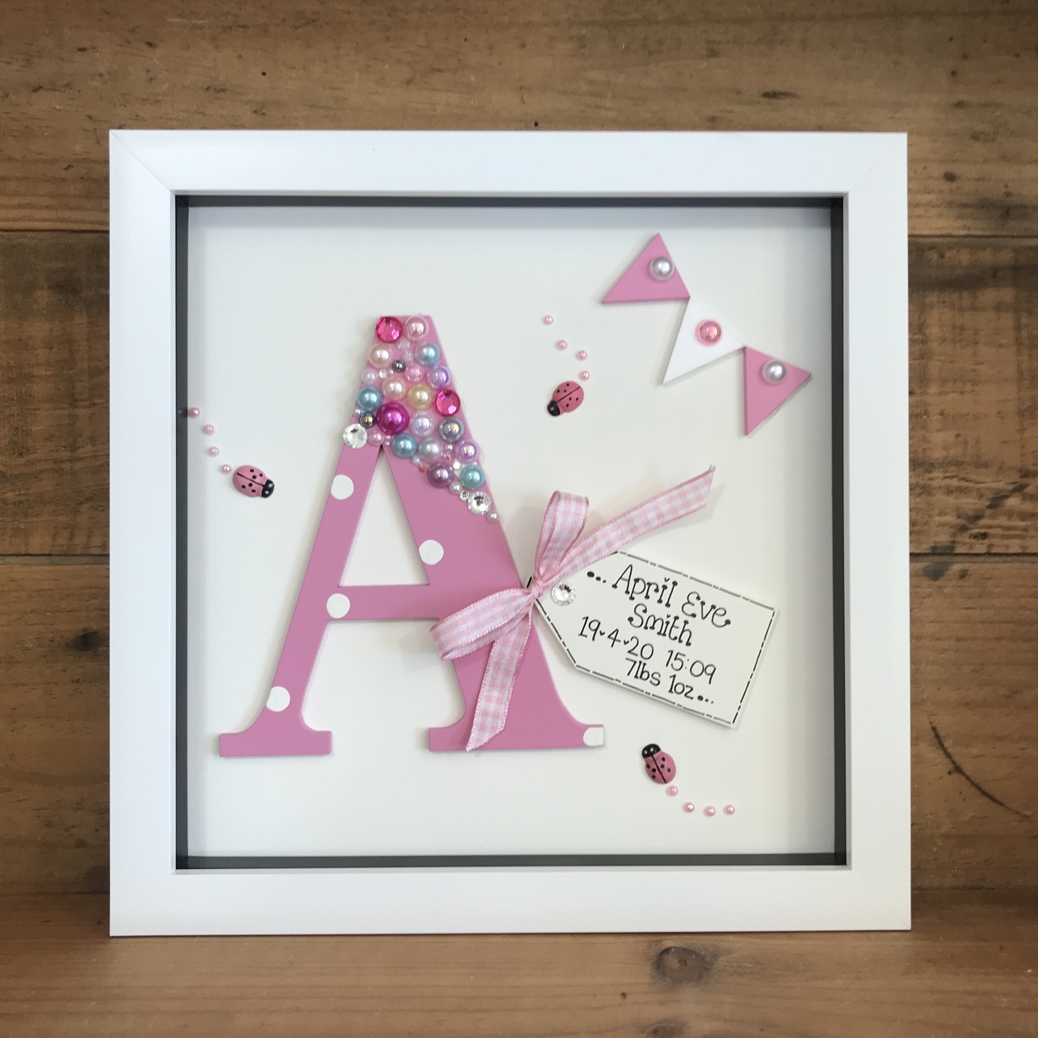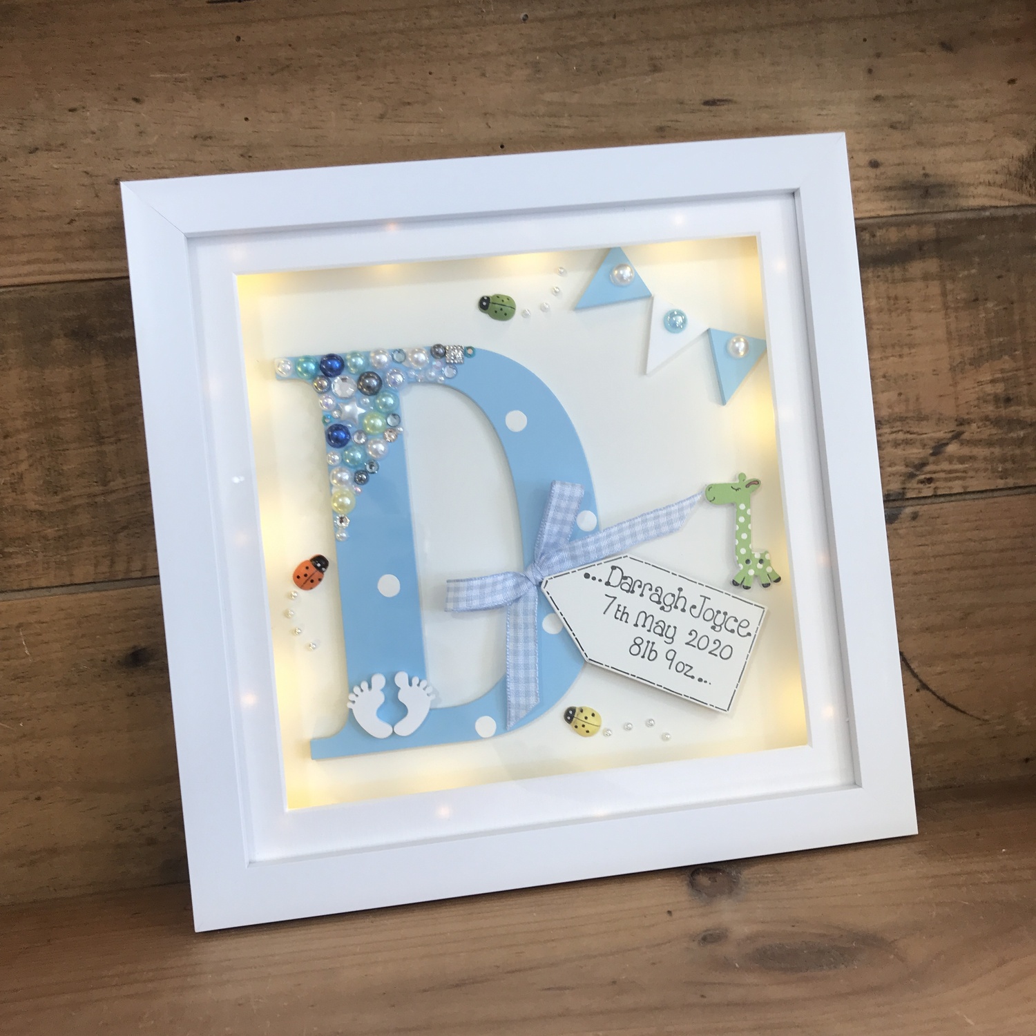 beautiful deep box frame with a hand painted laser cut letter inside,
