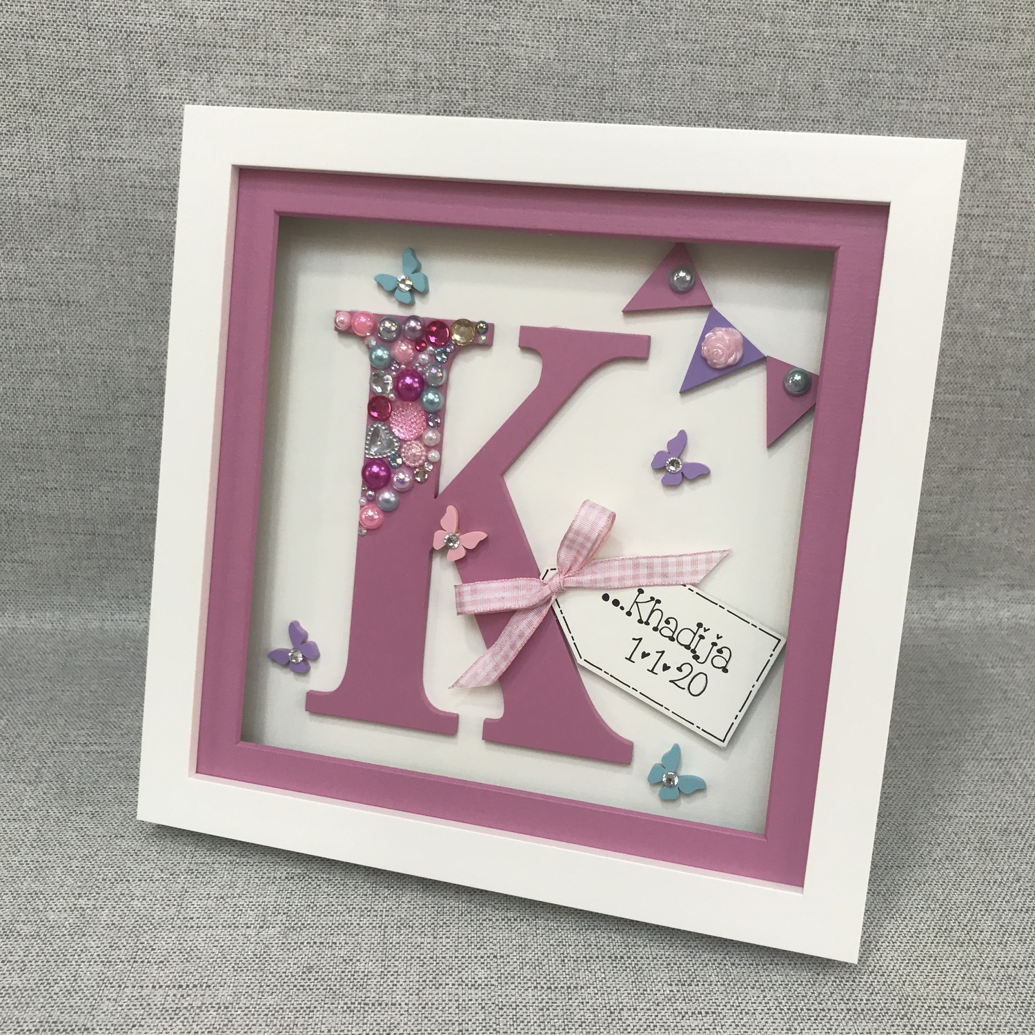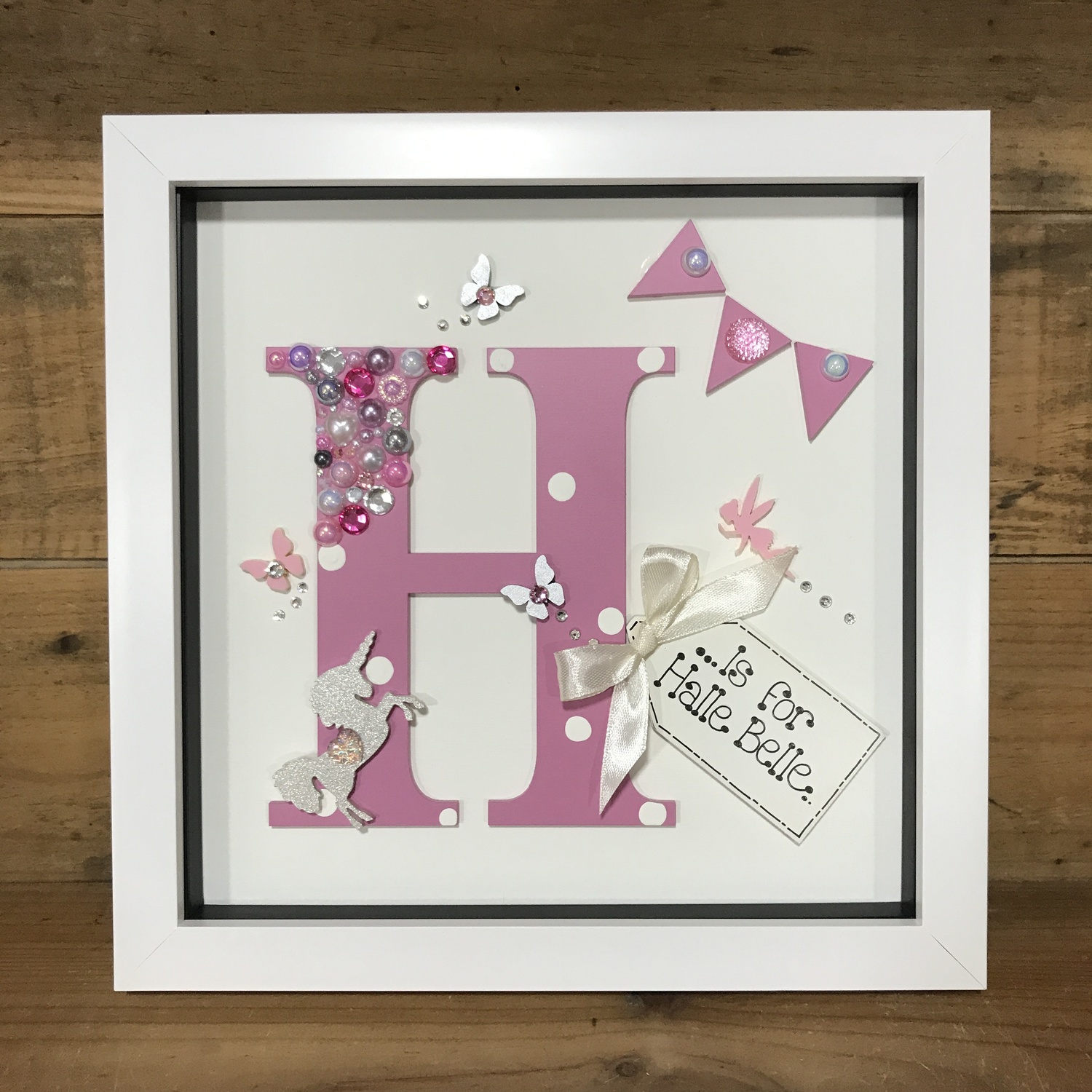 beautiful deep box frame with a hand painted laser cut letter inside,