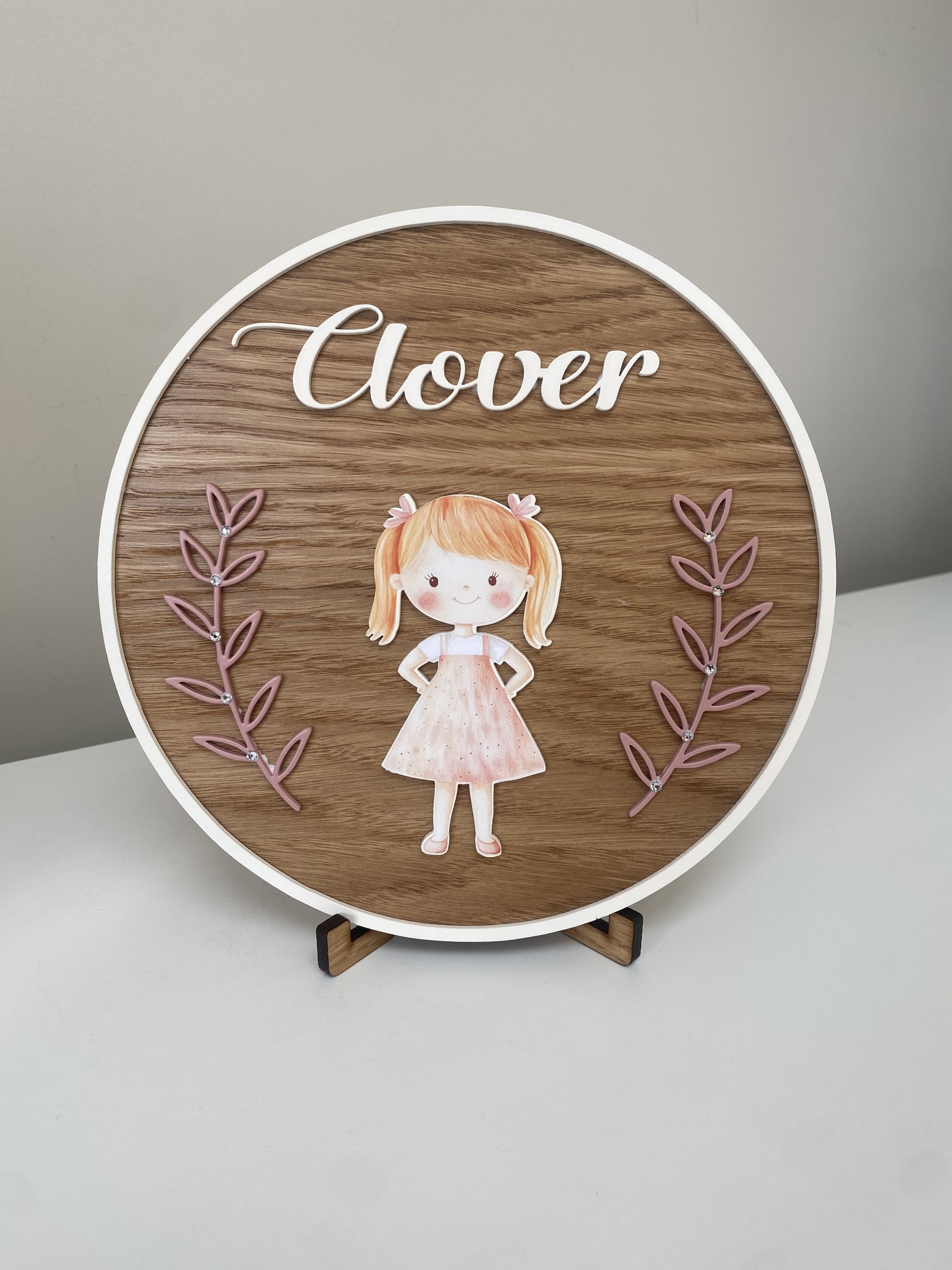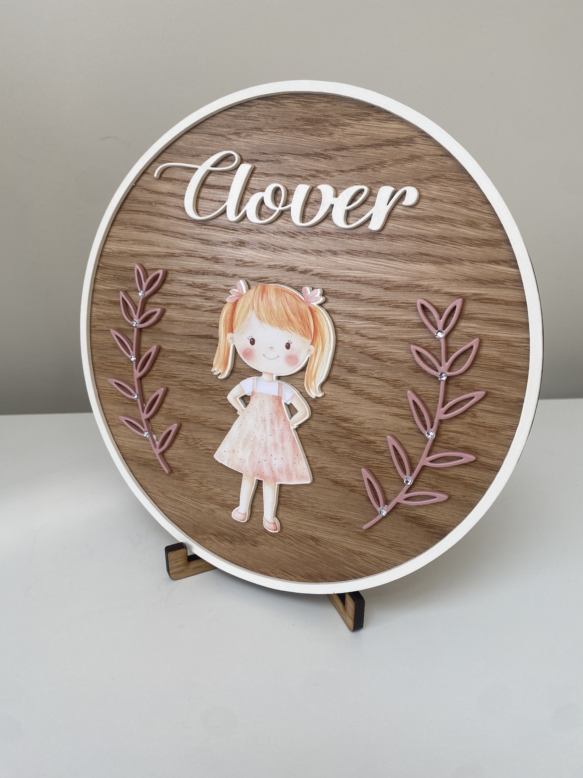 🌸 Custom made with her name for a unique touch👧 3D design featuring a little girl motif – playful and heartwarming🌿 Premium oak veneer – durable and elegant🔹 Versatile display – Can be hung on a door or placed on a shelf using the included stand📏 Perfectly sized at 19.5cm