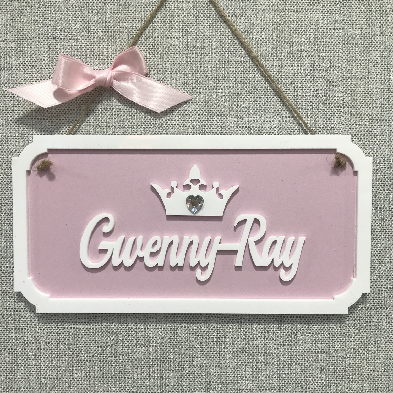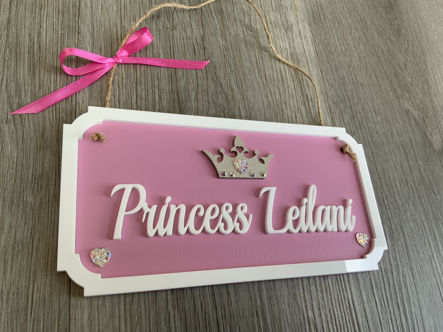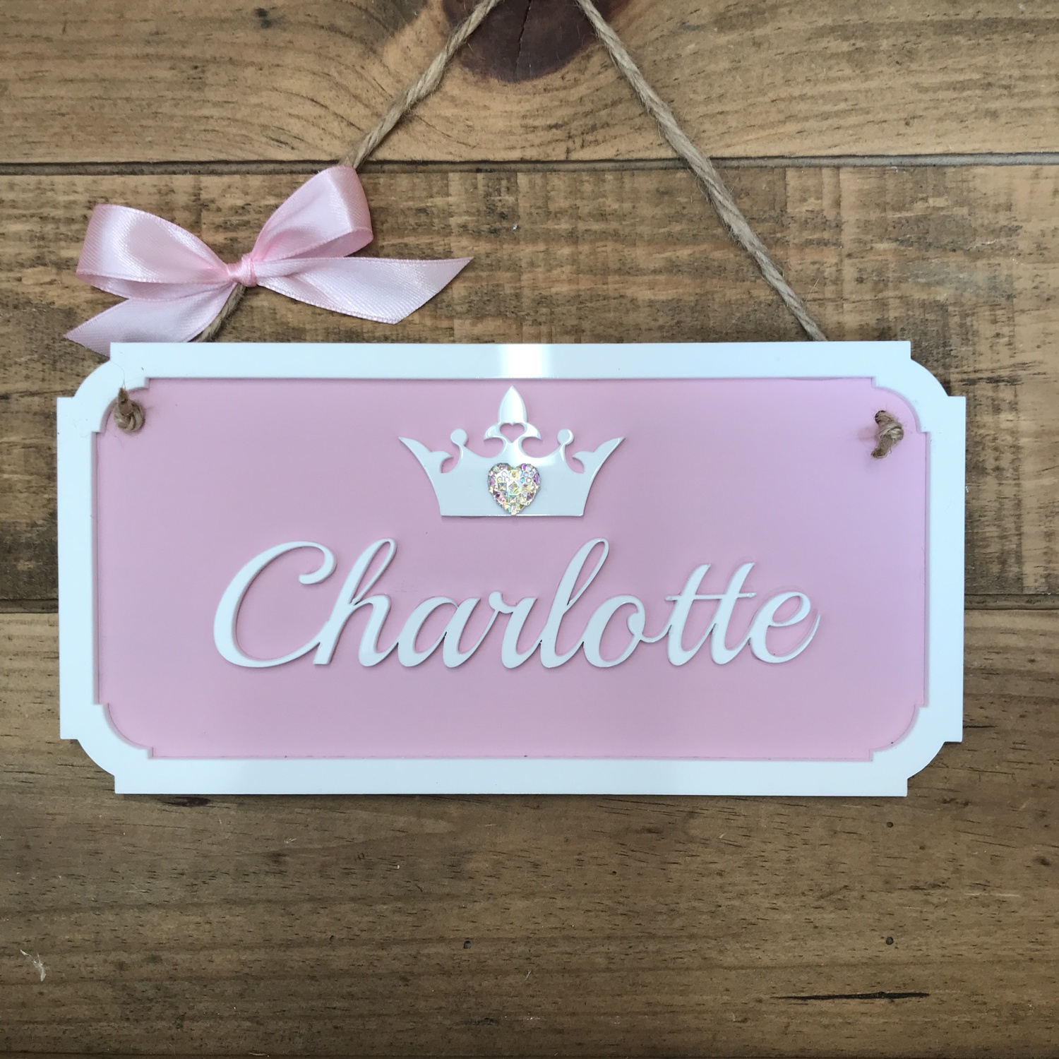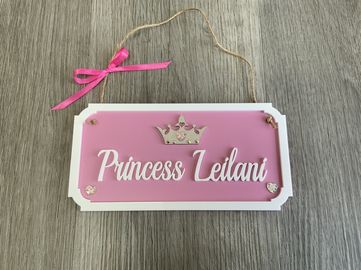 The name is cut out of white acrylic with a matching crown ( with optional glitter )