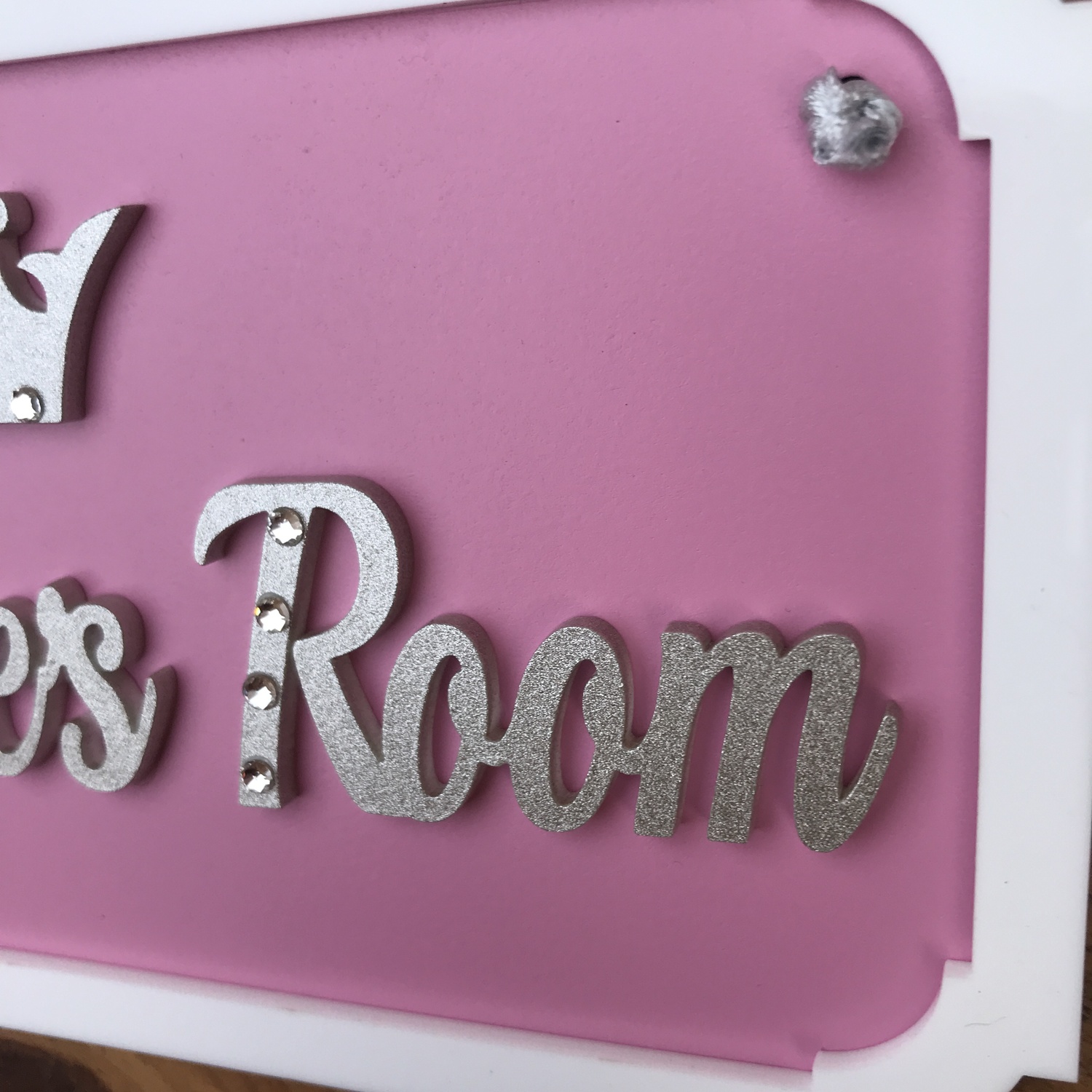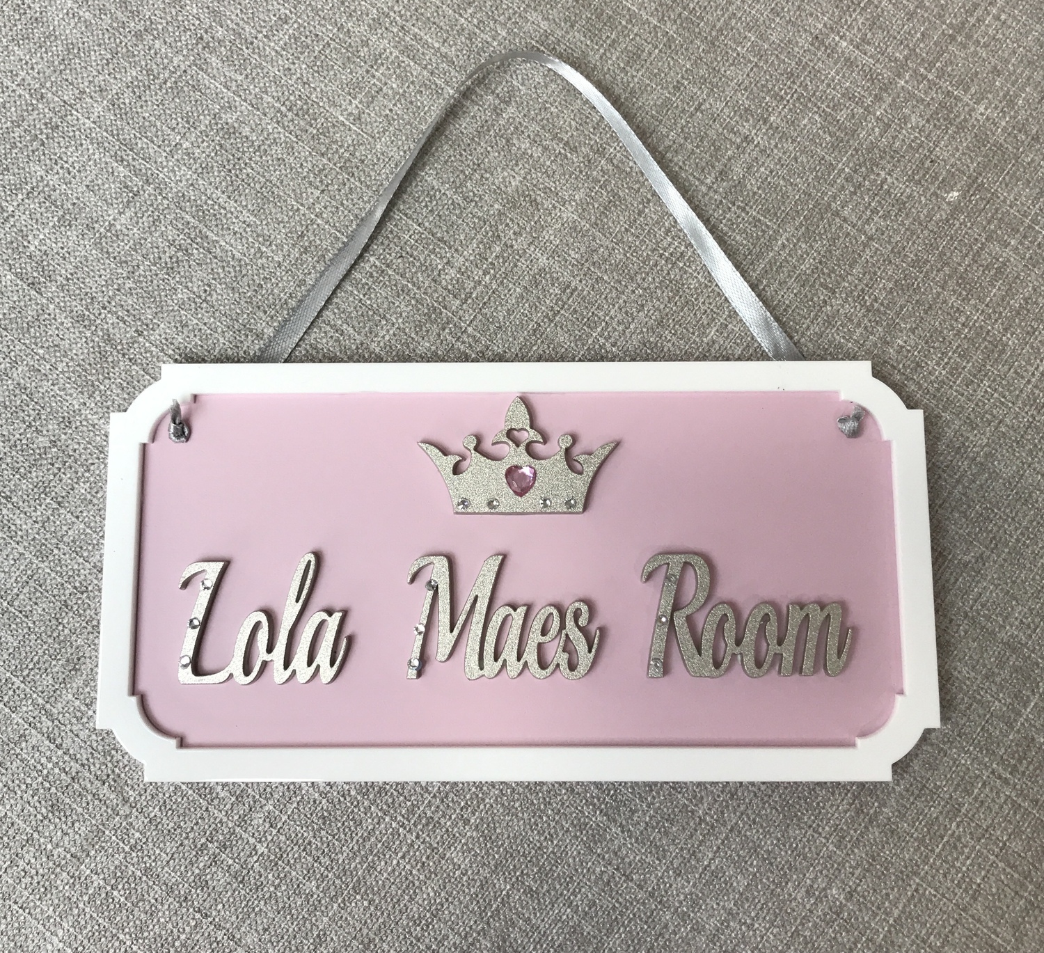 The name is cut out of glitter silver acrylic with matching crown and diamanté’s