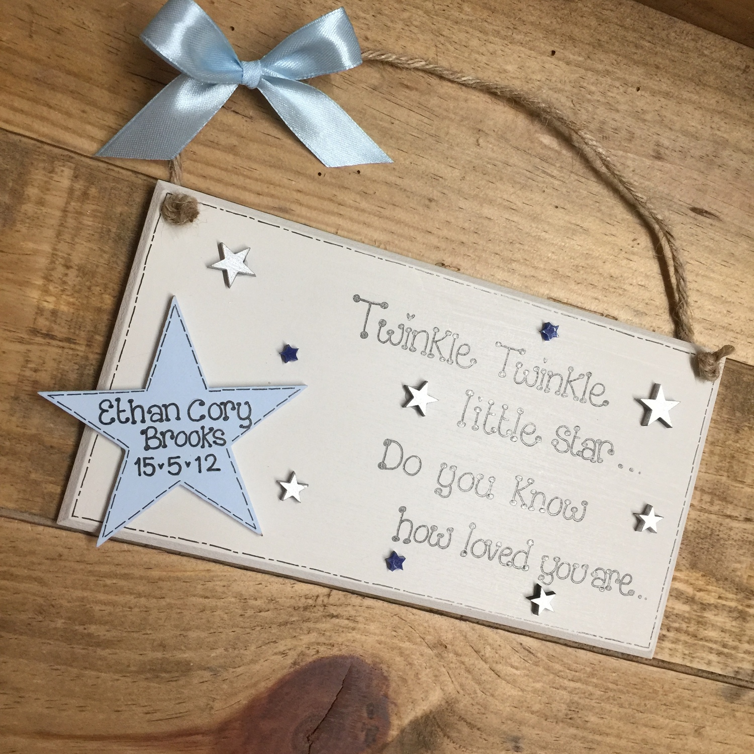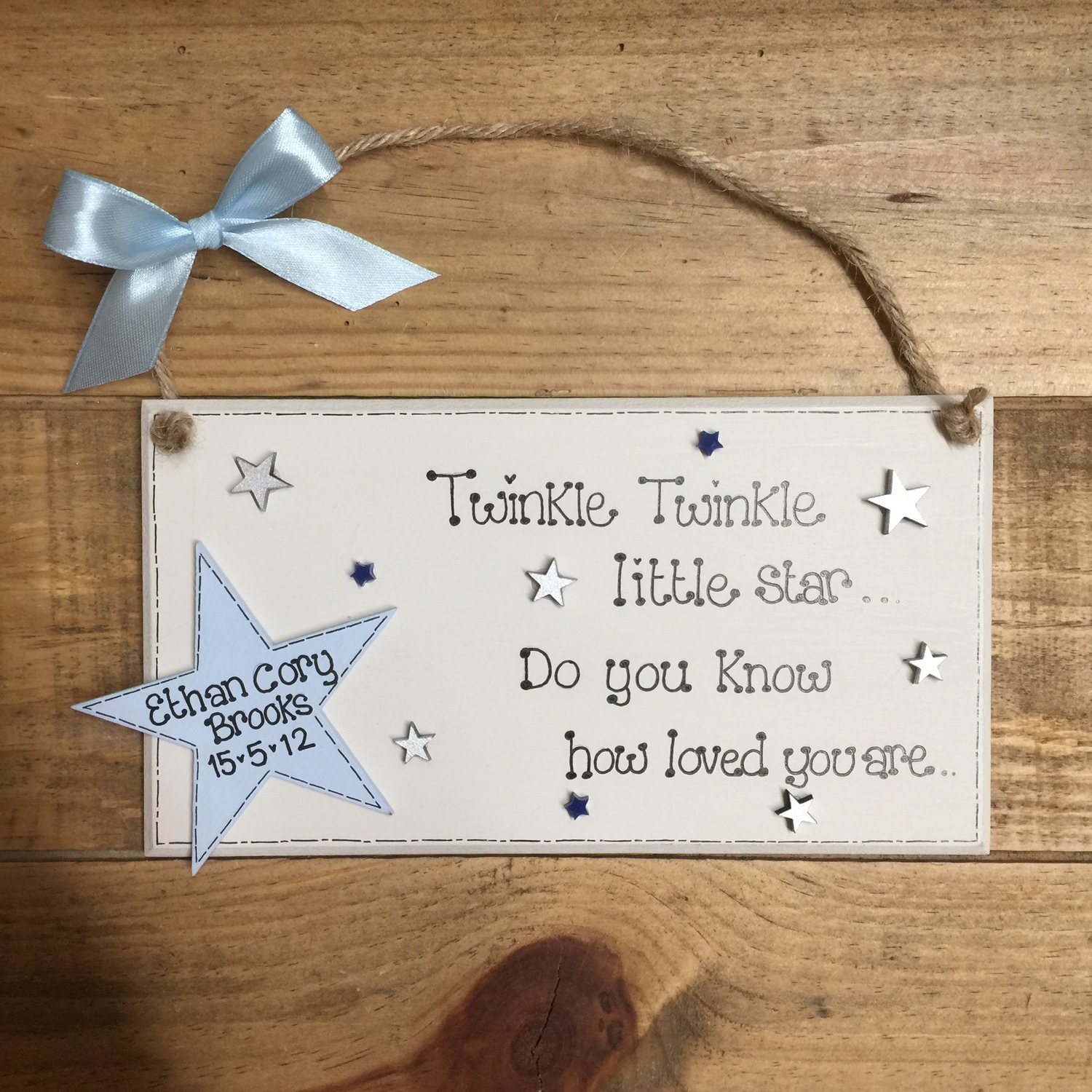 With a painted wooden star for the name and date, can be painted in blue or pink. Other colours available.