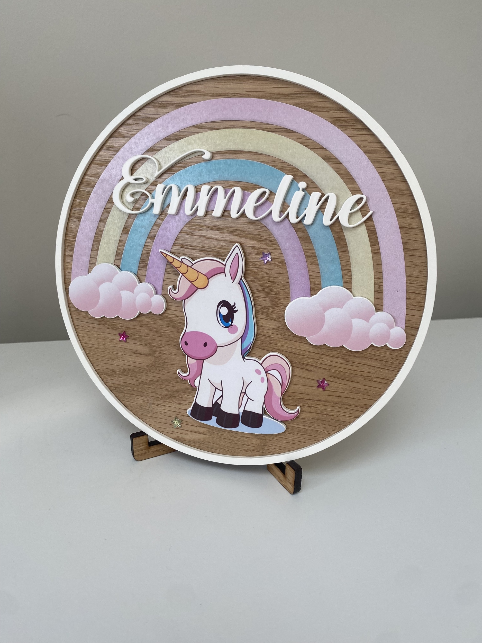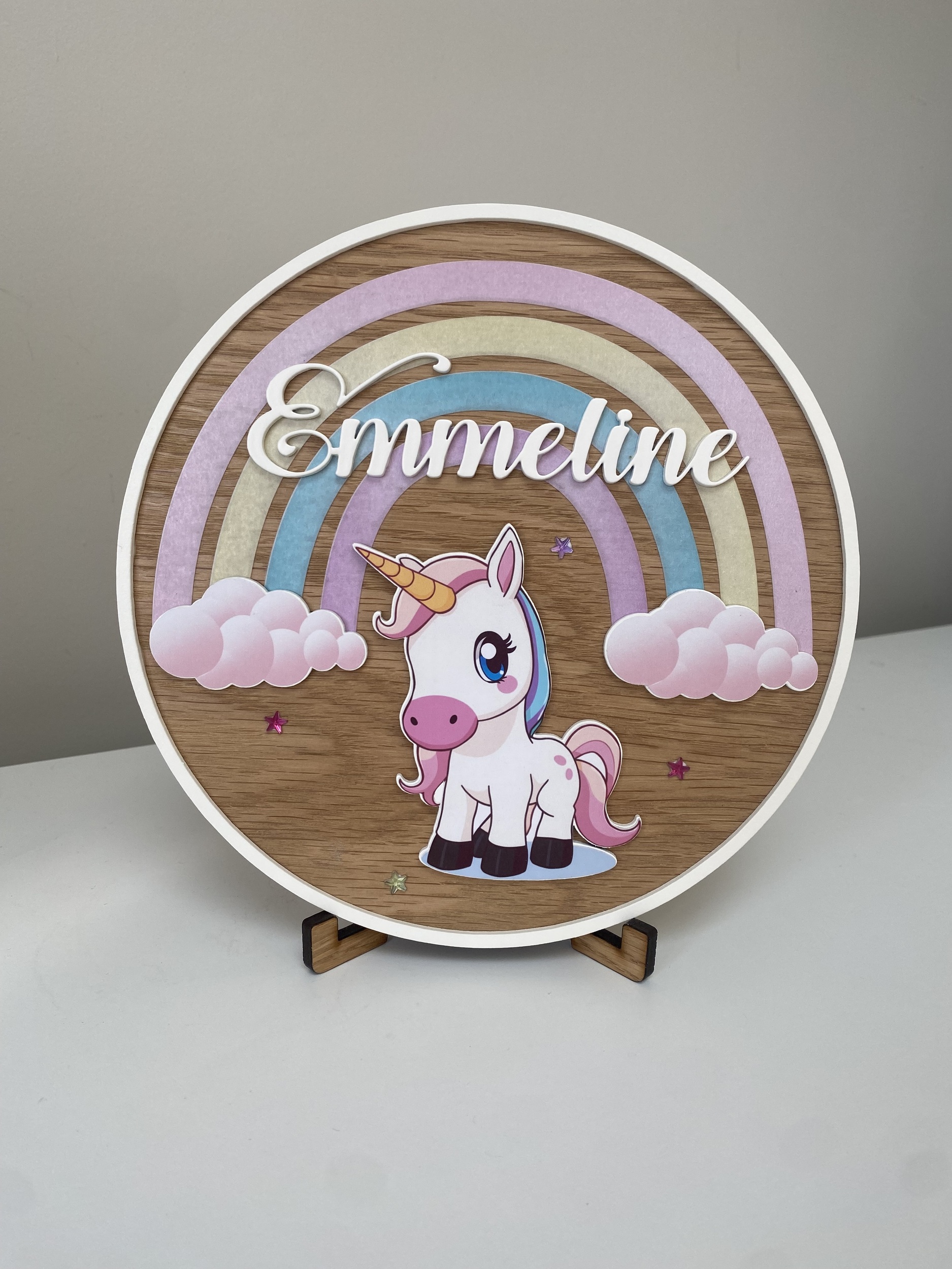 🦄 Custom made with their name for a unique touch✨ Whimsical 3D unicorn design with stars, rainbows, and magic🌳 Premium oak veneer for durability and style🔹 Versatile display – Can be hung on a door or placed on a shelf using the included stand📏 19.5cm size for an enchanting presence