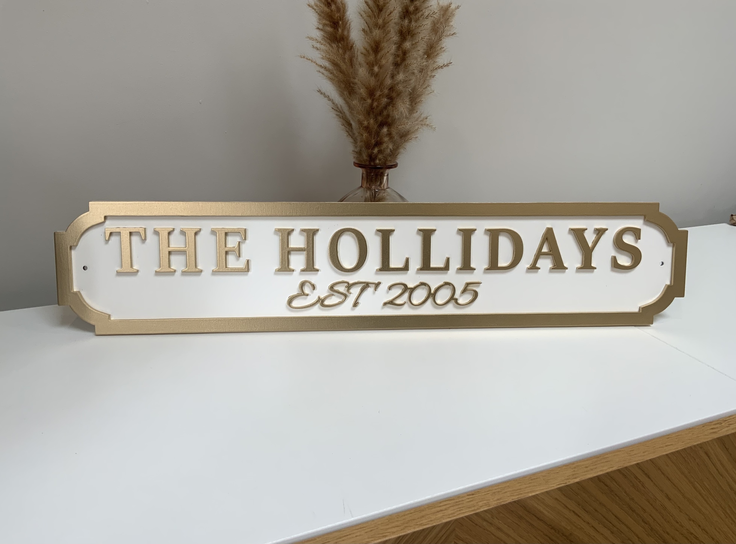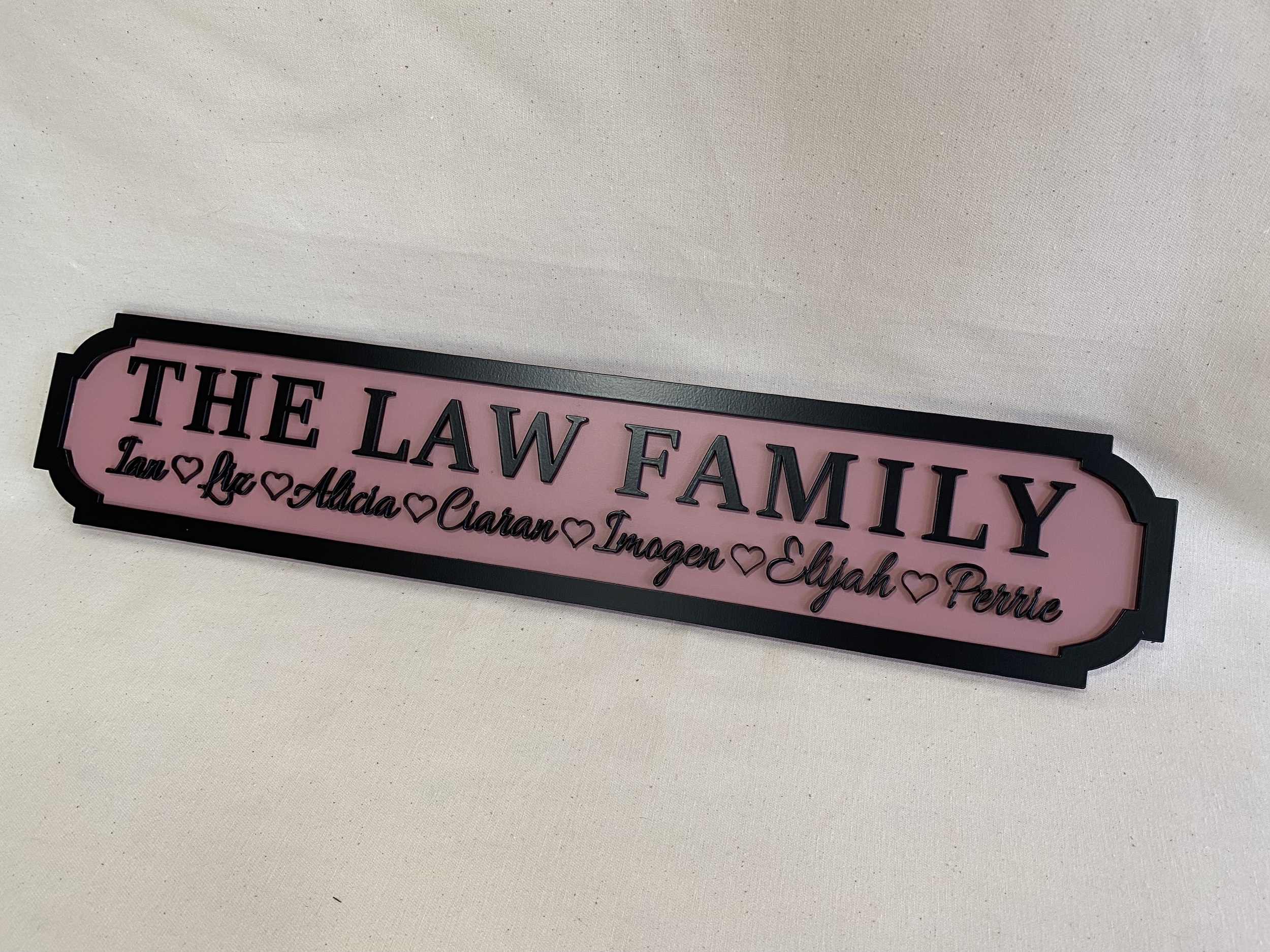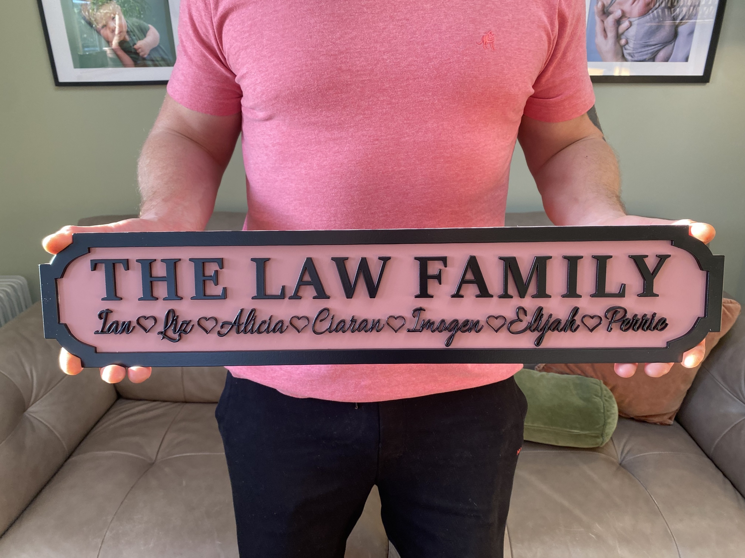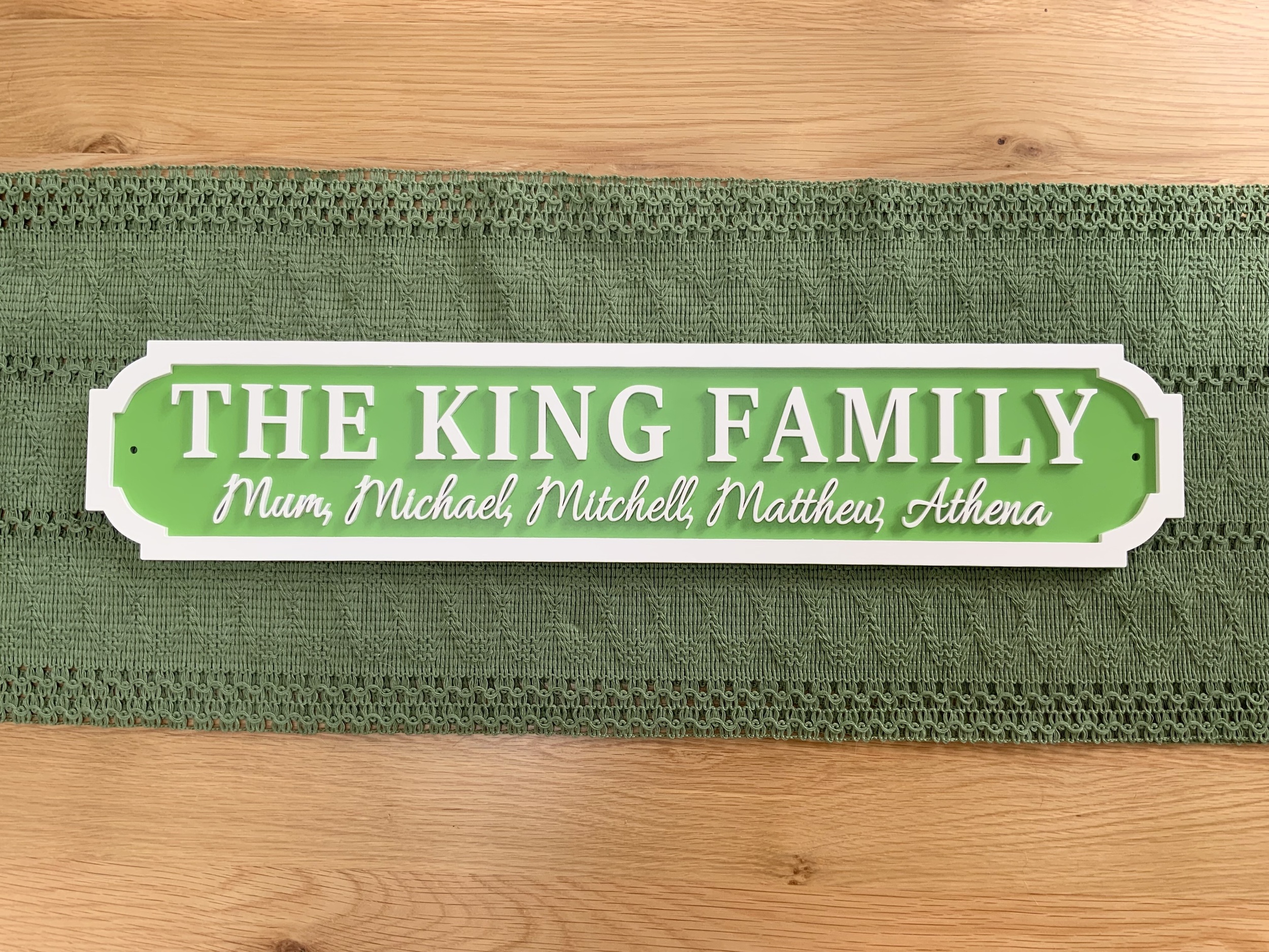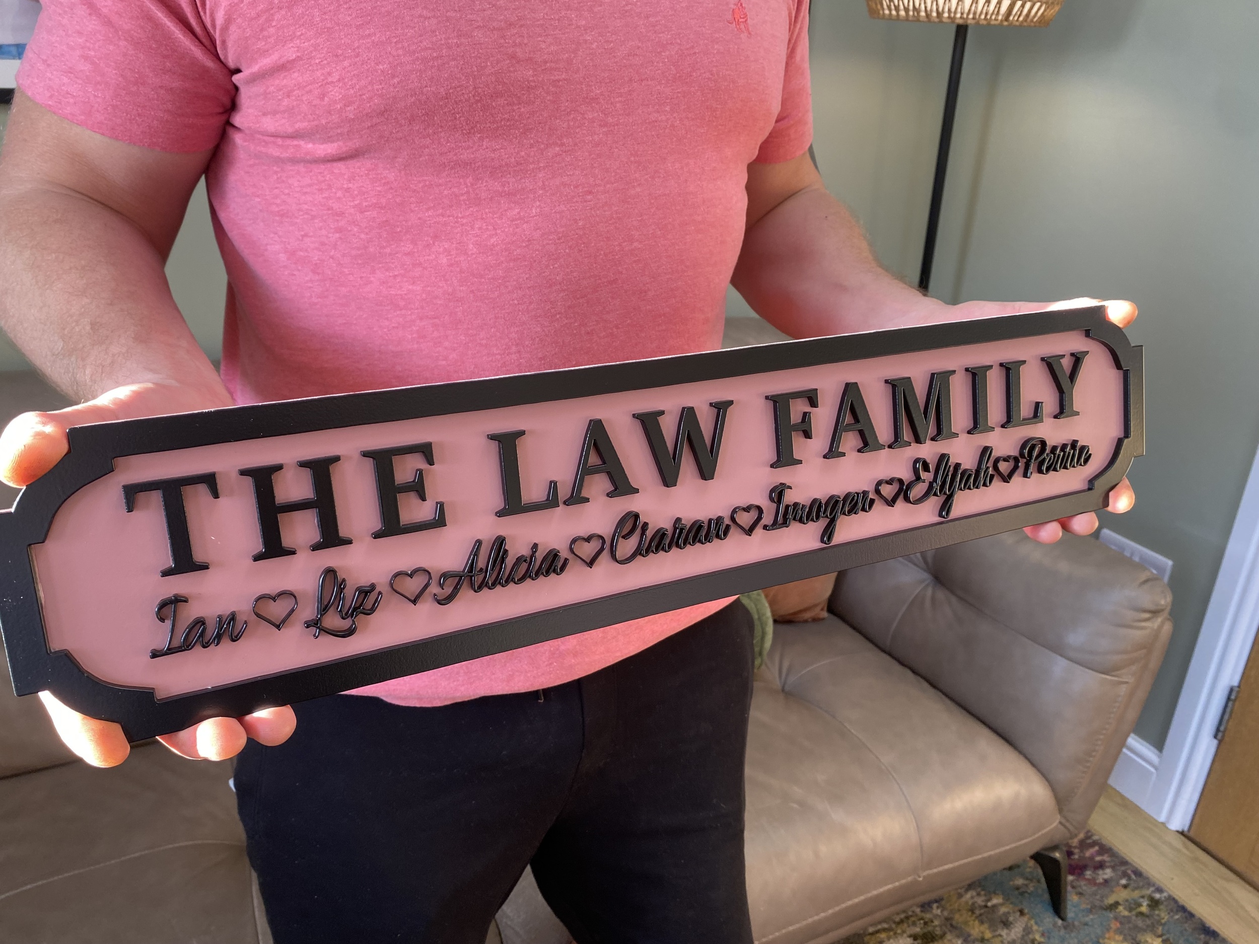 A large personalised family name street sign, handcrafted from layered wood to create a beautiful 3D raised effect — not a print.