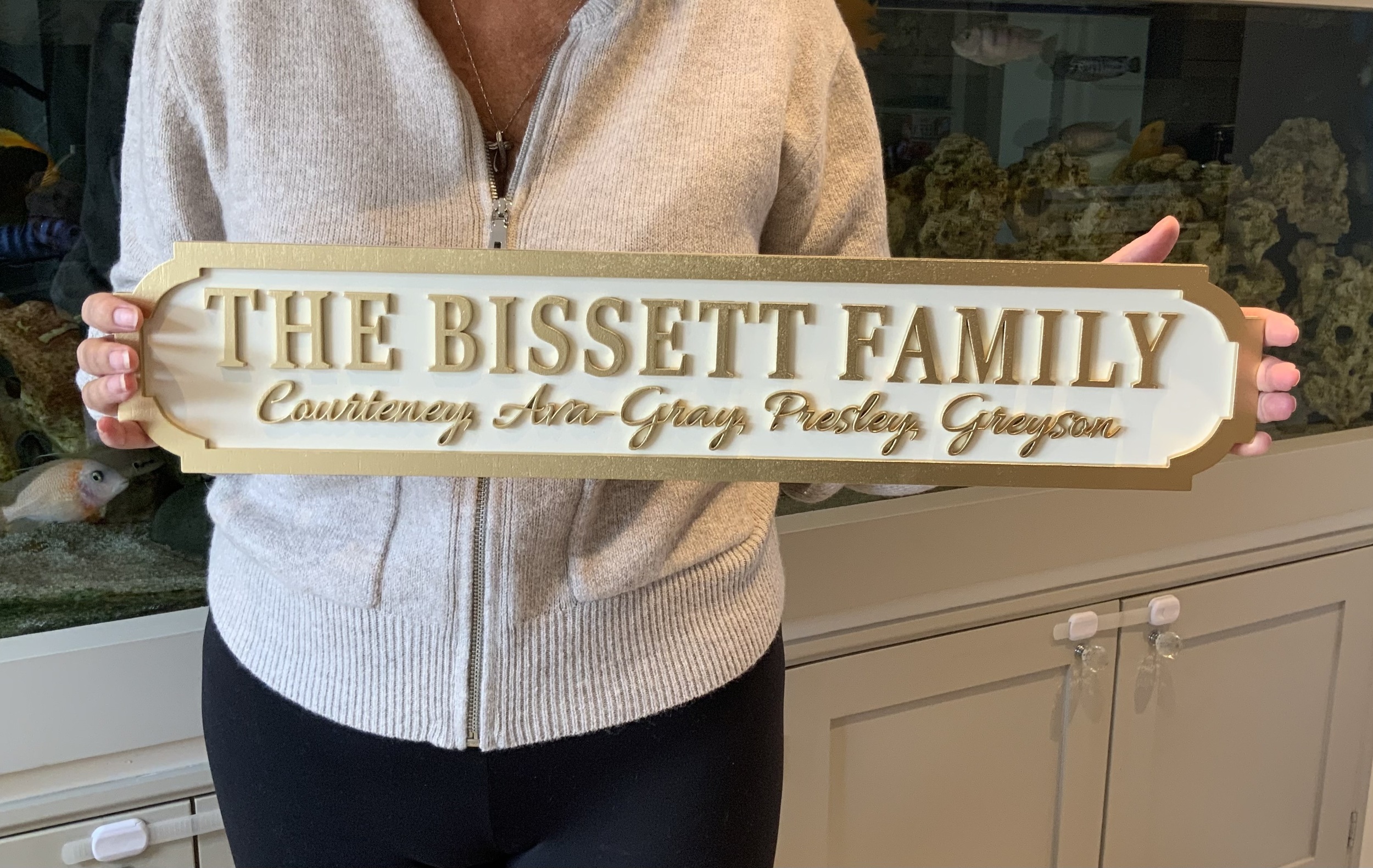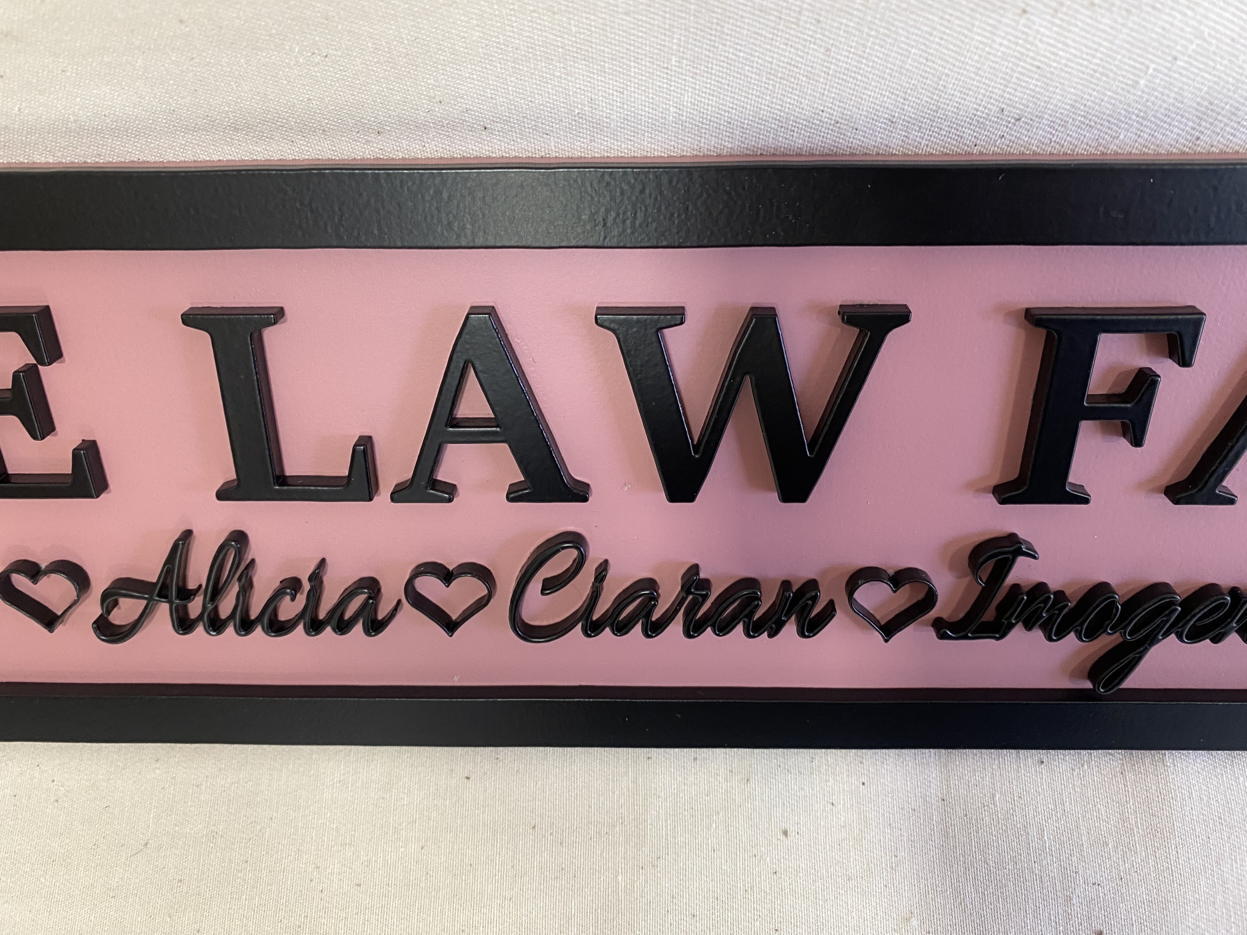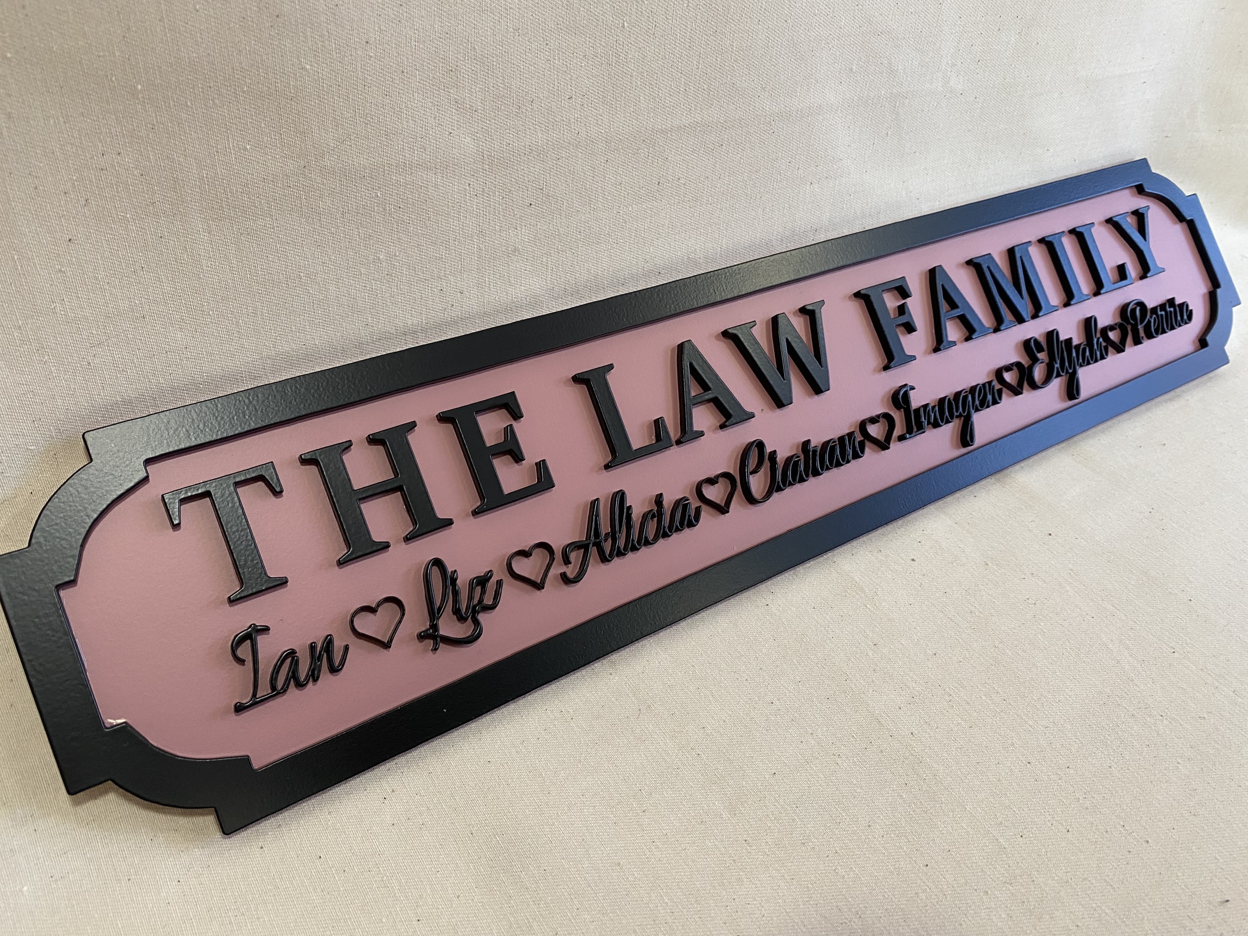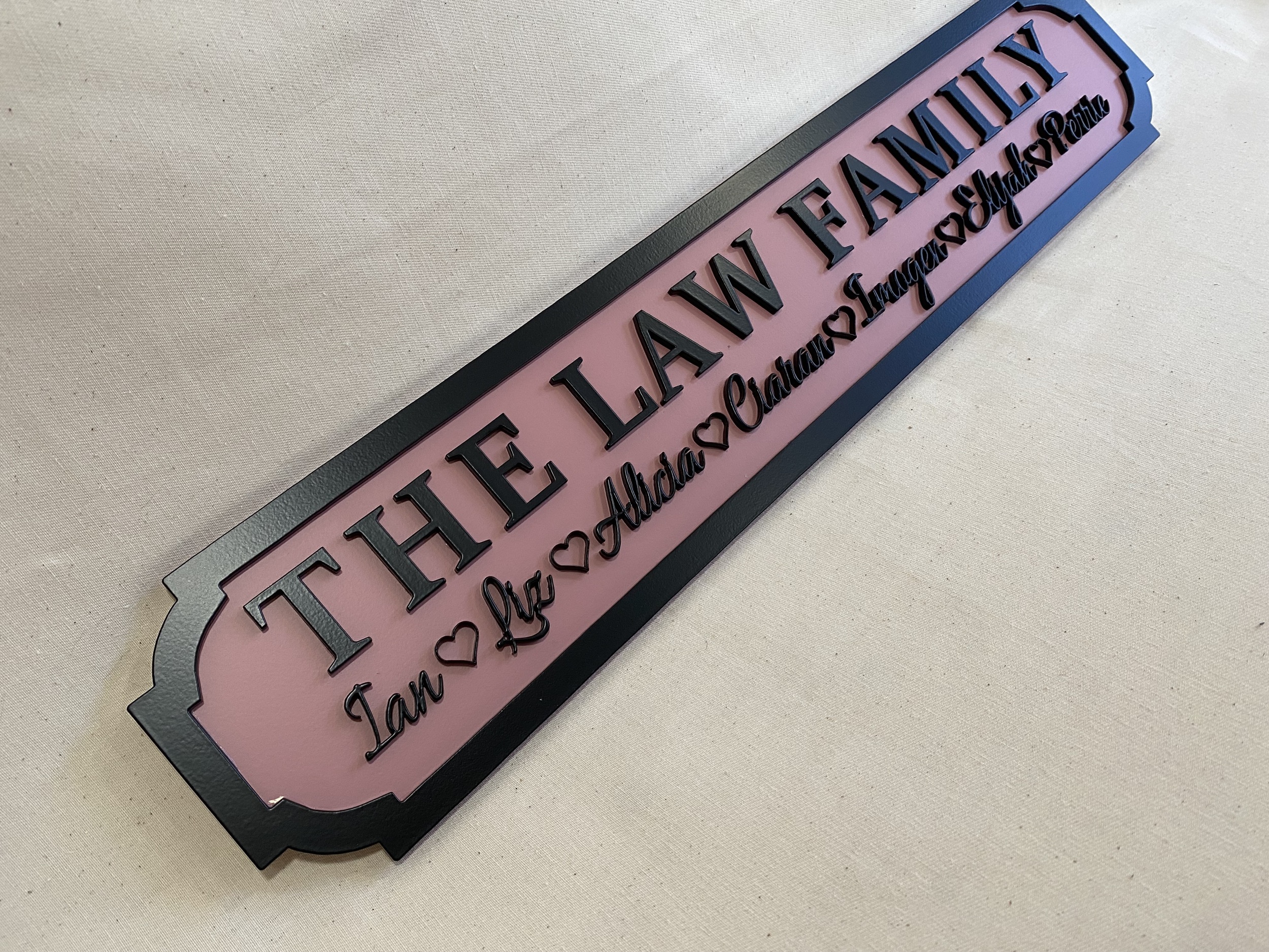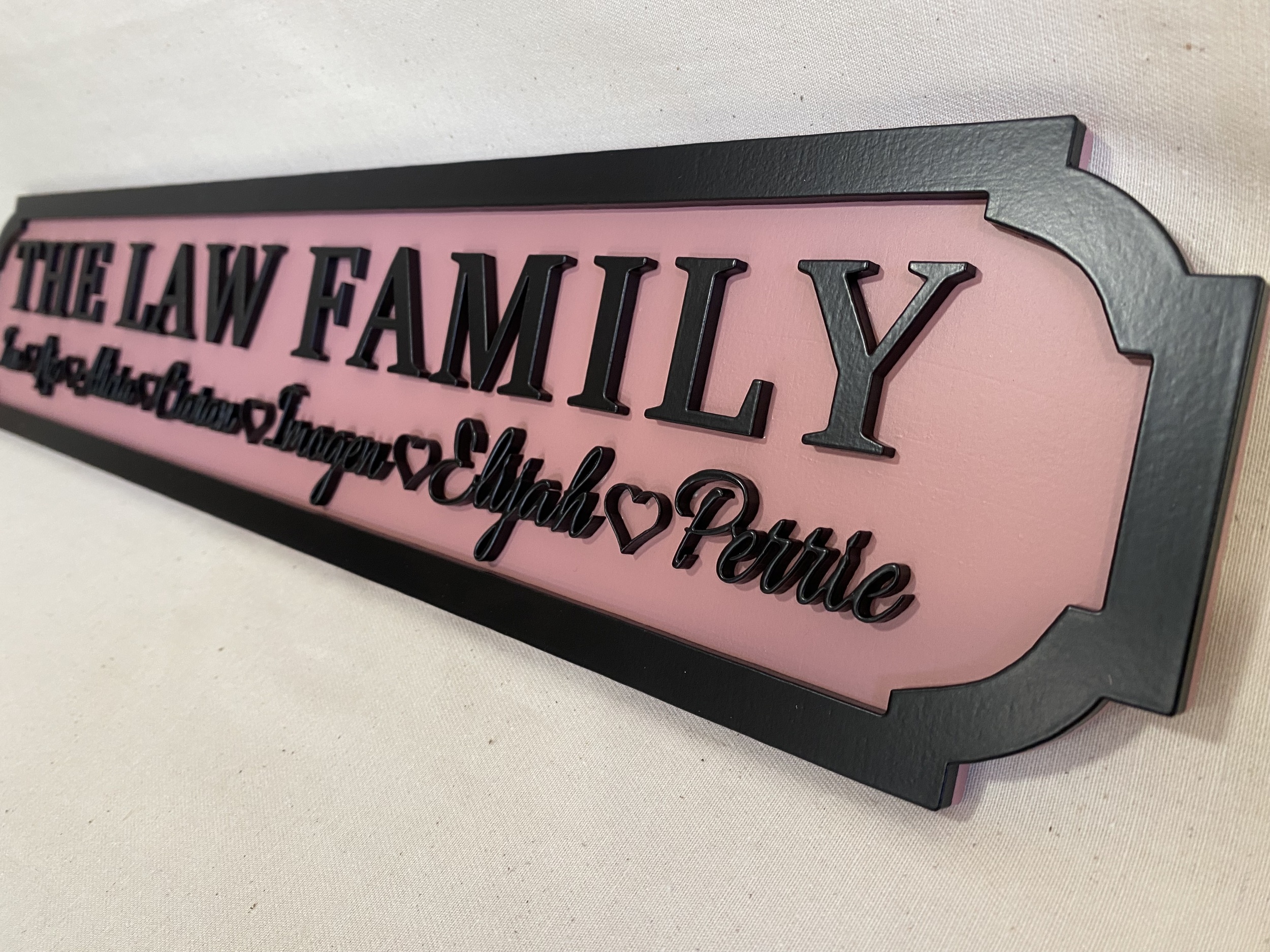A large personalised family name street sign, handcrafted from layered wood to create a beautiful 3D raised effect — not a print.