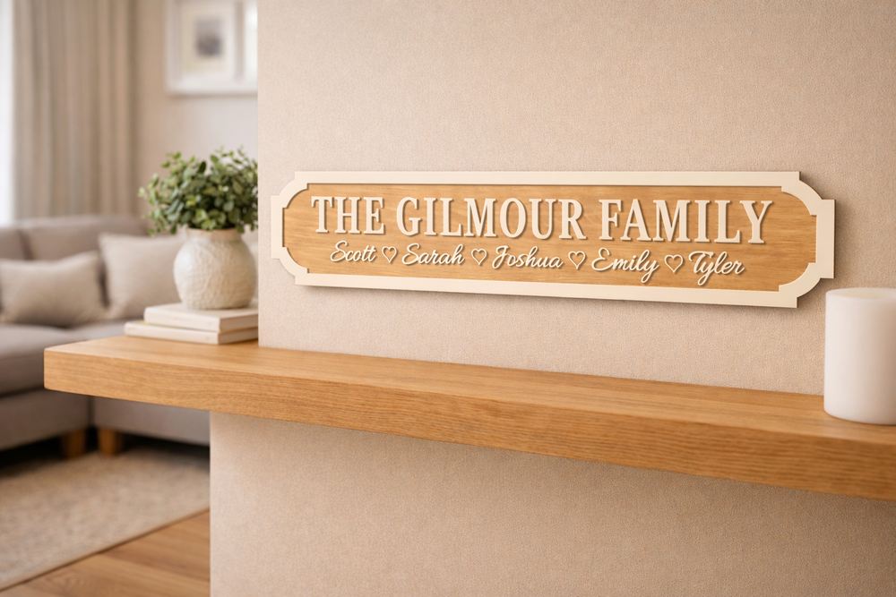 Designed as a statement indoor plaque, this piece features your chosen surname as the main focal point, with optional additional names beneath. The layered wooden construction gives depth, texture and a premium finish that stands out in any hallway, living room or entrance space.