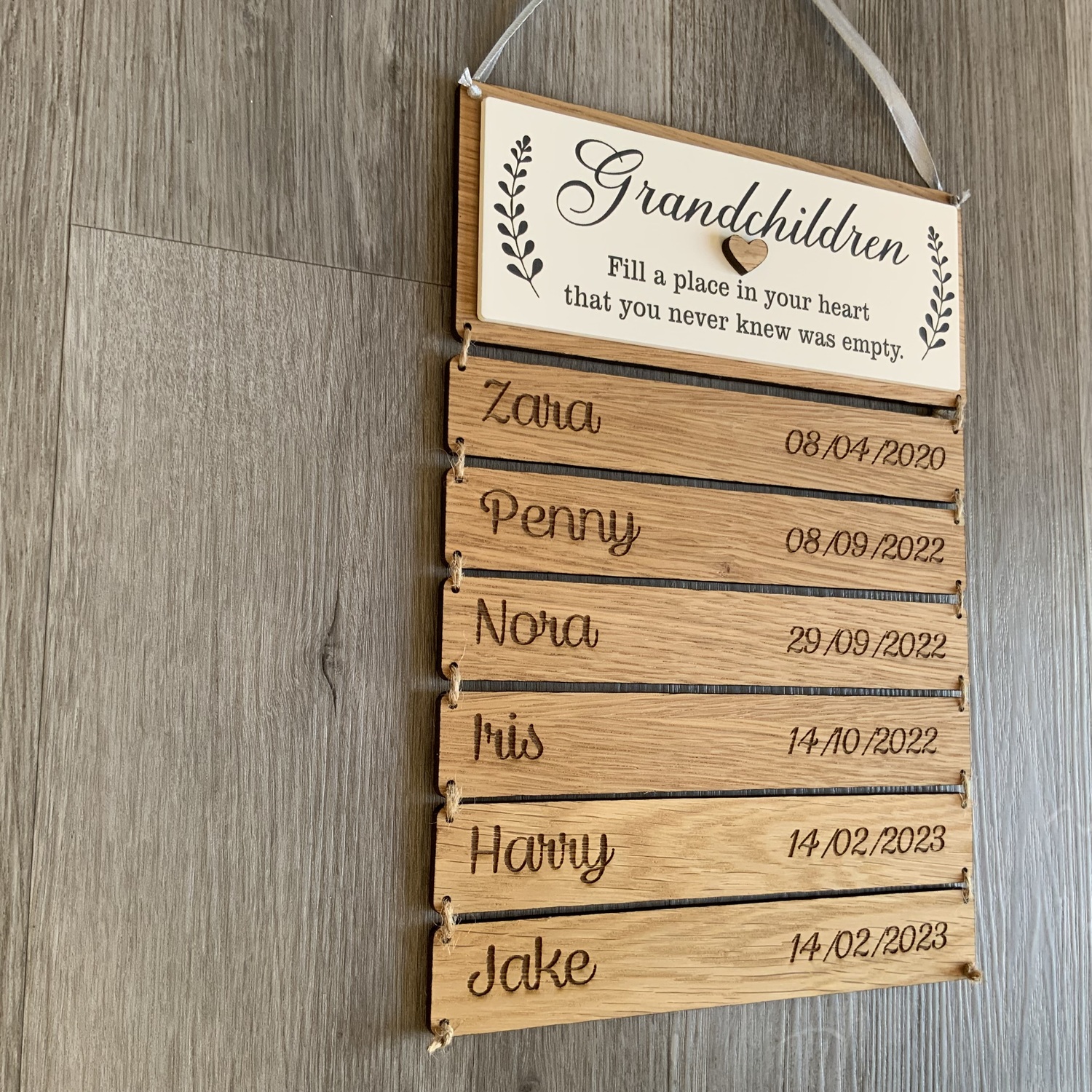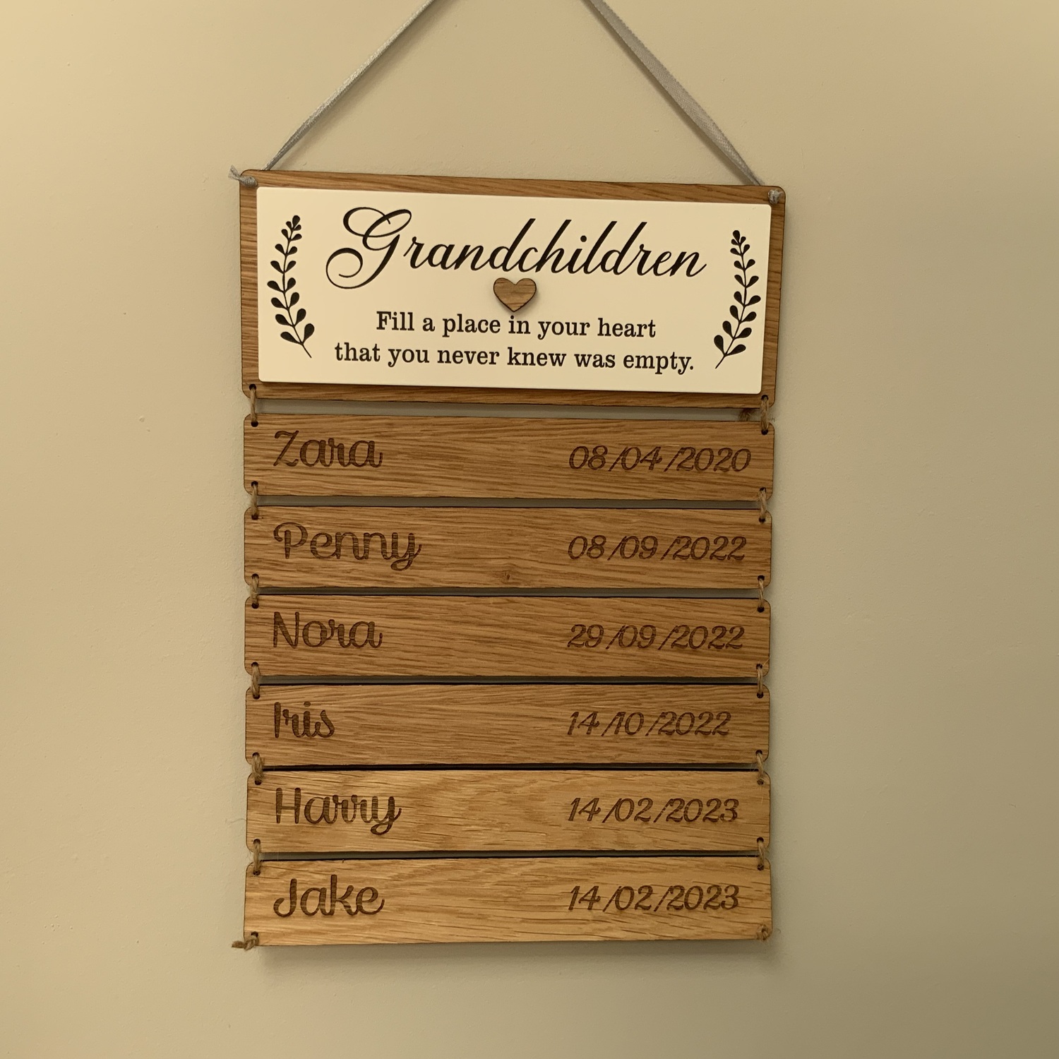 personalised with the children’s names and date of birth, additional names can be added at a later date.