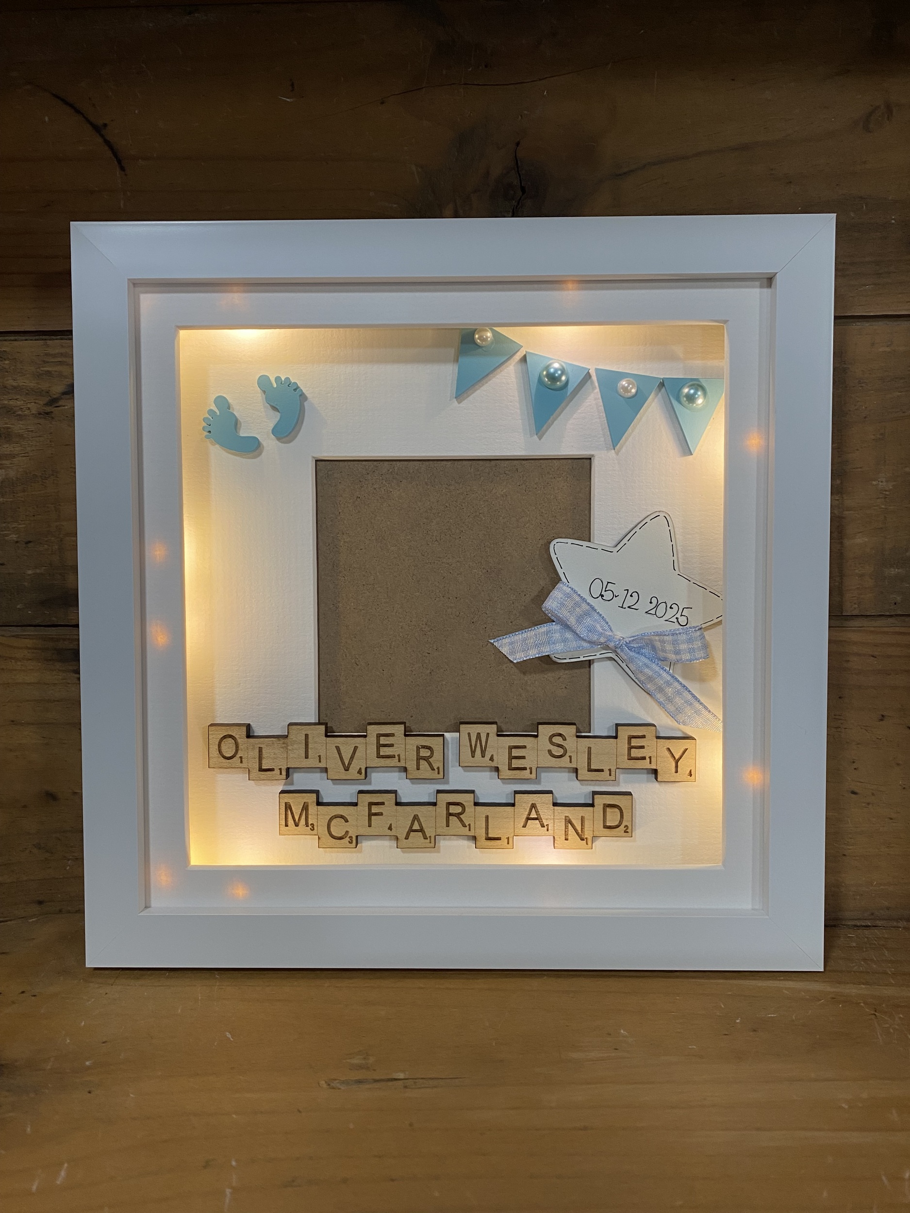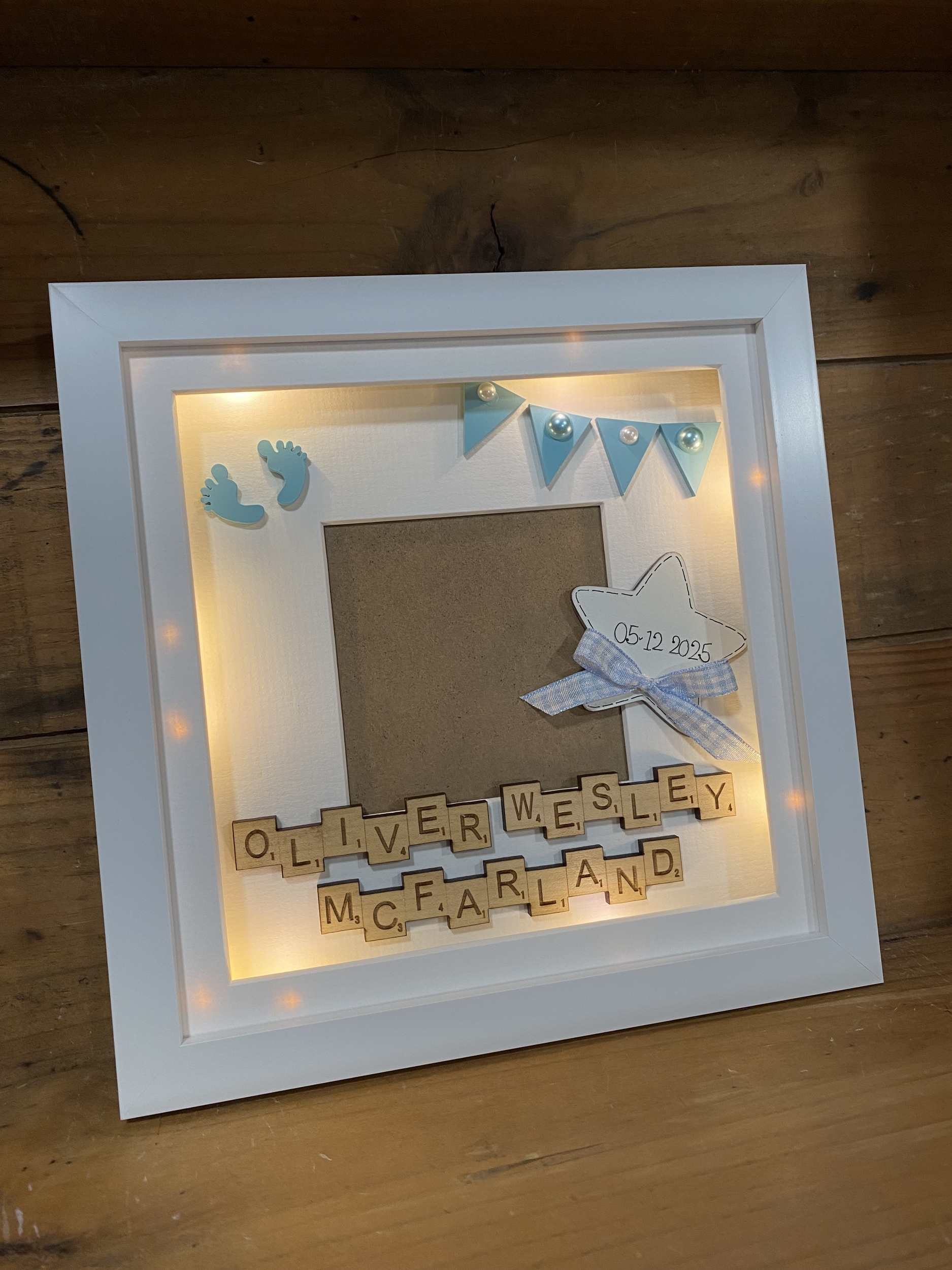 Each frame is handmade to order and can be customised in any colour to suit your nursery or party theme. Soft lighting and delicate details make it a lovely addition to a bedroom, shelf or memory corner, and it also makes a thoughtful gift for first birthdays, baby showers or christenings.