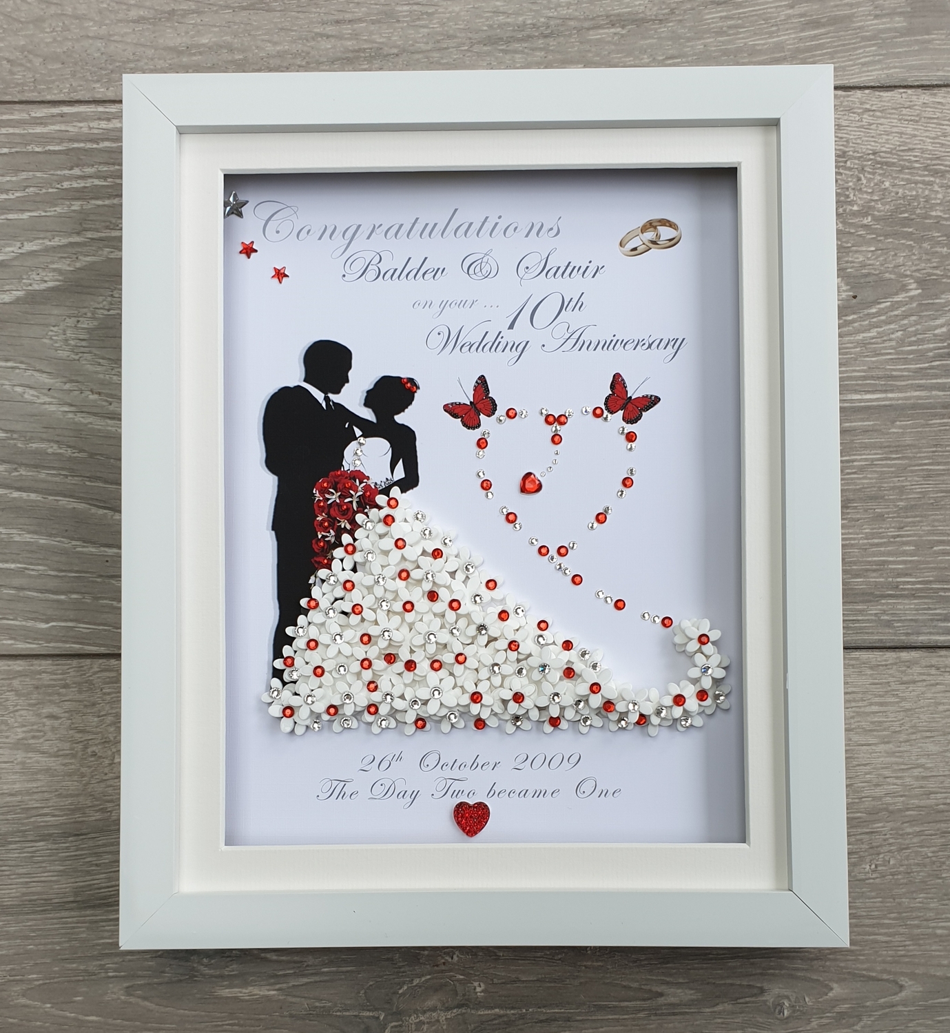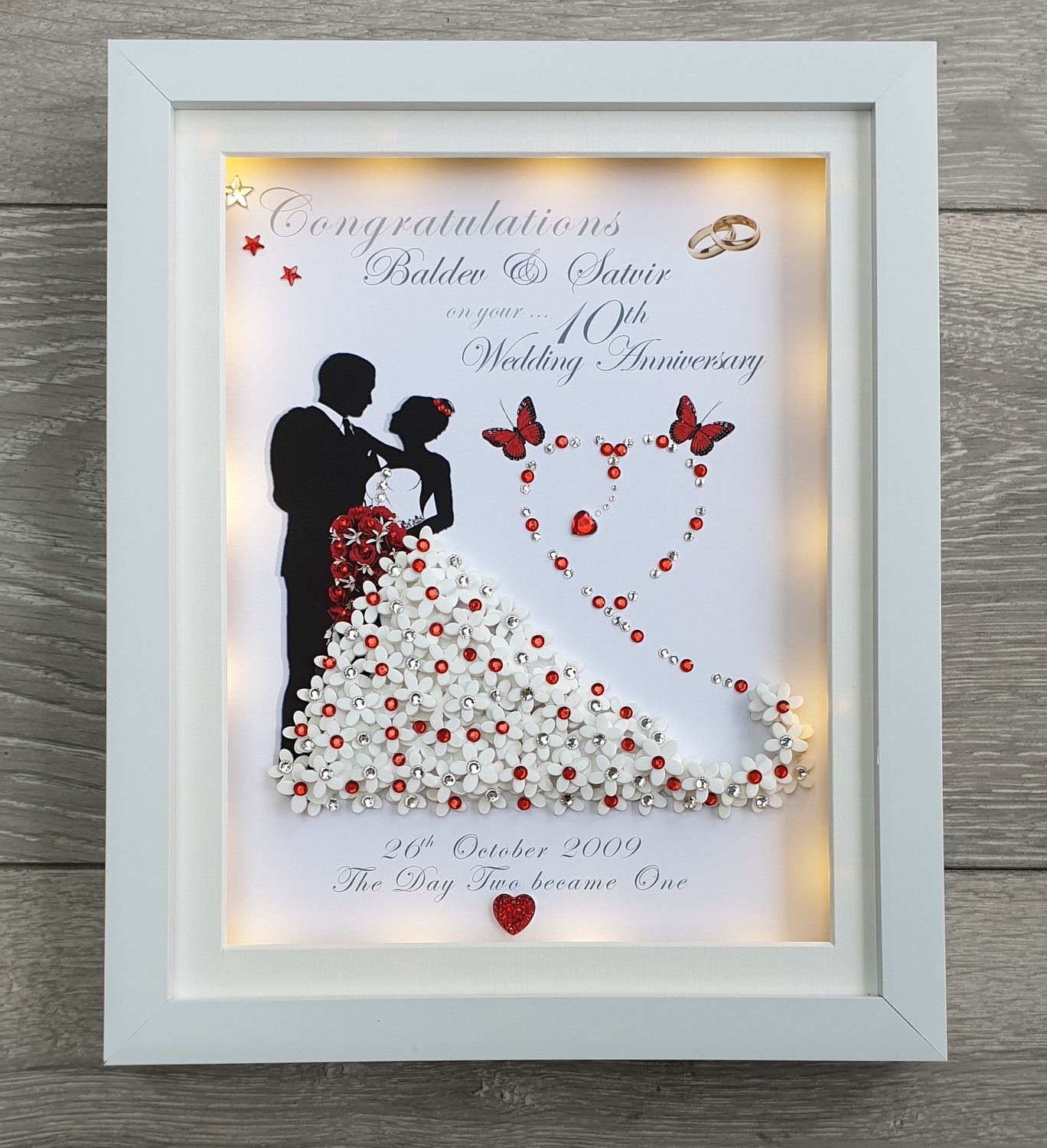 Celebrate a special wedding anniversary with this beautifully handcrafted 3D boxed frame, personalised with the couple’s names and anniversary date to create a truly meaningful keepsake.