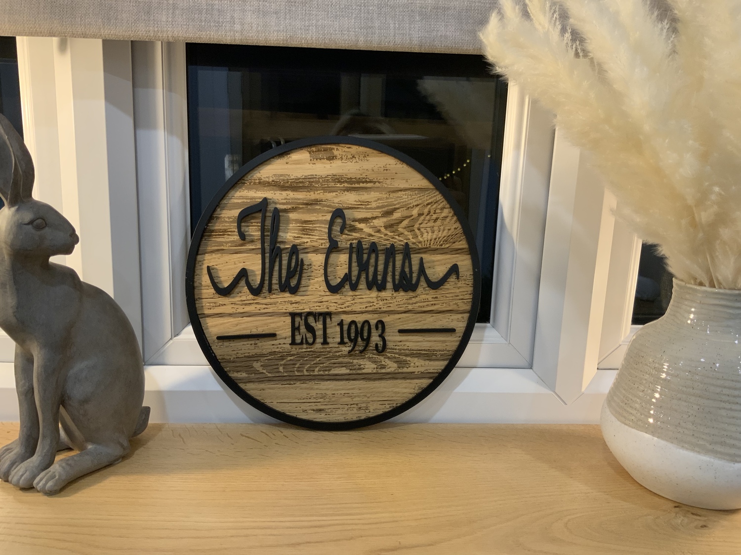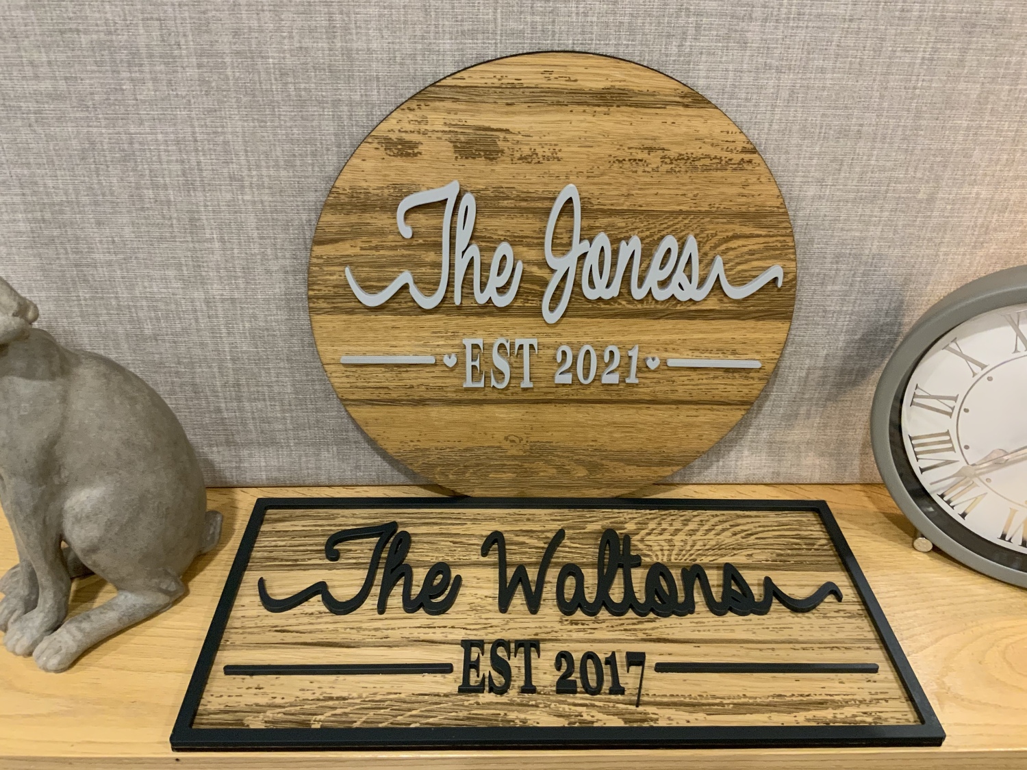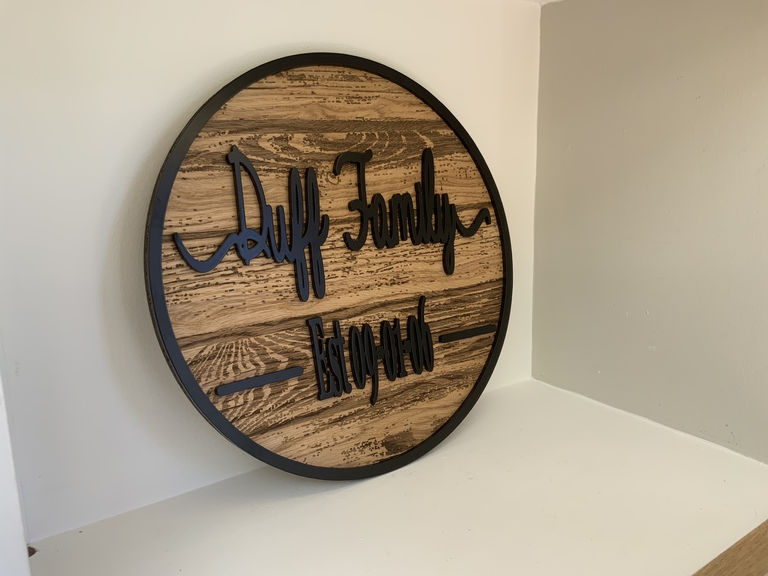 Feel a sense of pride growing within you when you display the name of your family or established date on one of our beautiful Personalized Last Name Signs made from High Quality Oak veneer with Engraved wood grain.